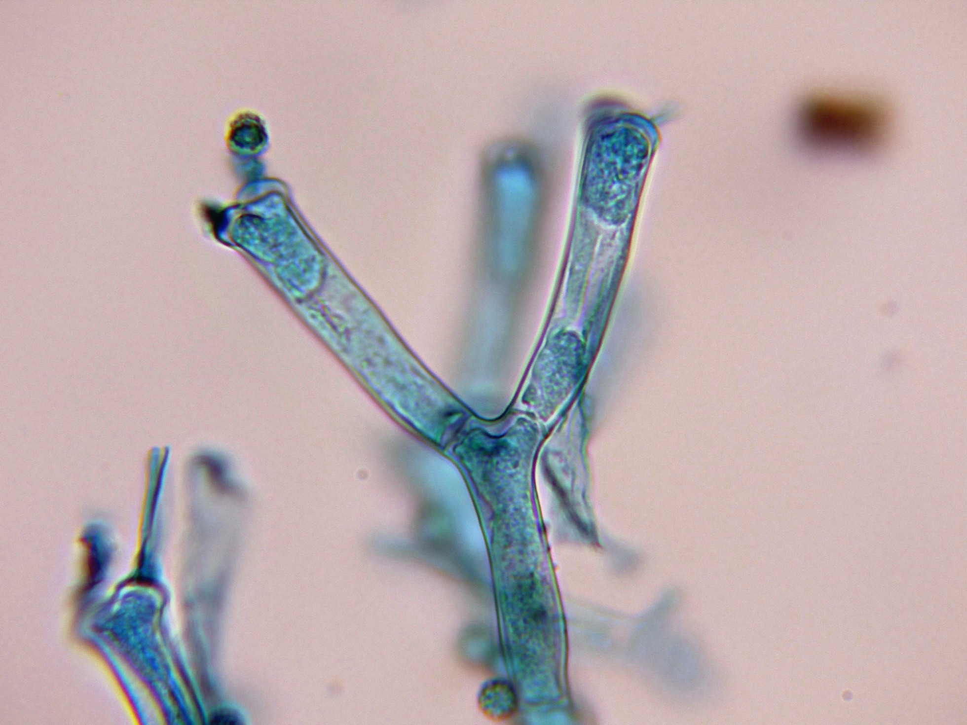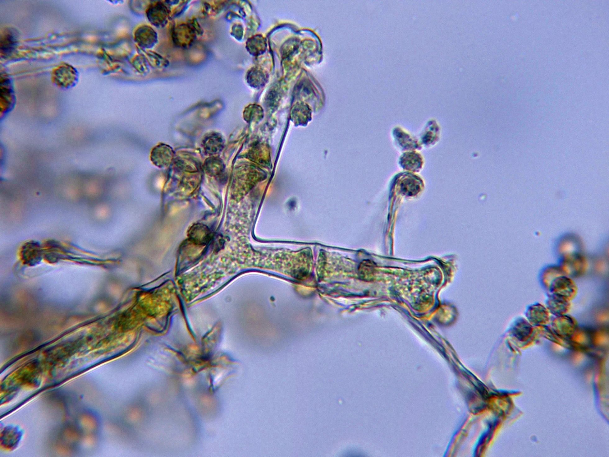 Los conidióforos en Reactivo de Melzer, en este medio se pueden observar mejor los septos.