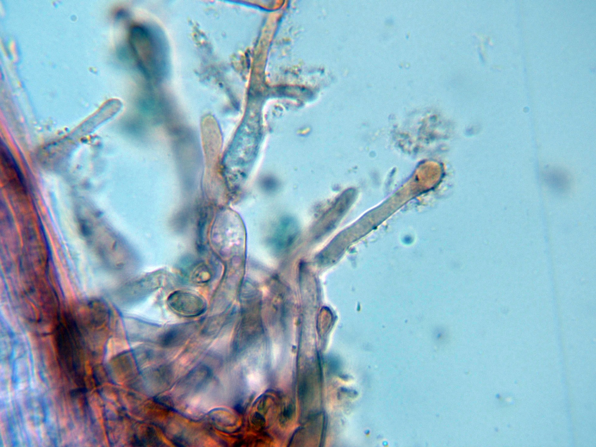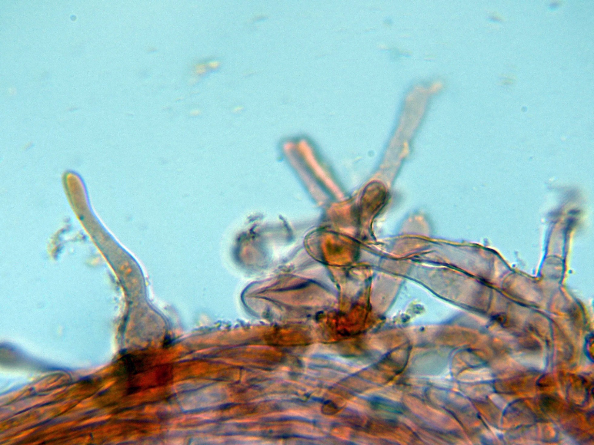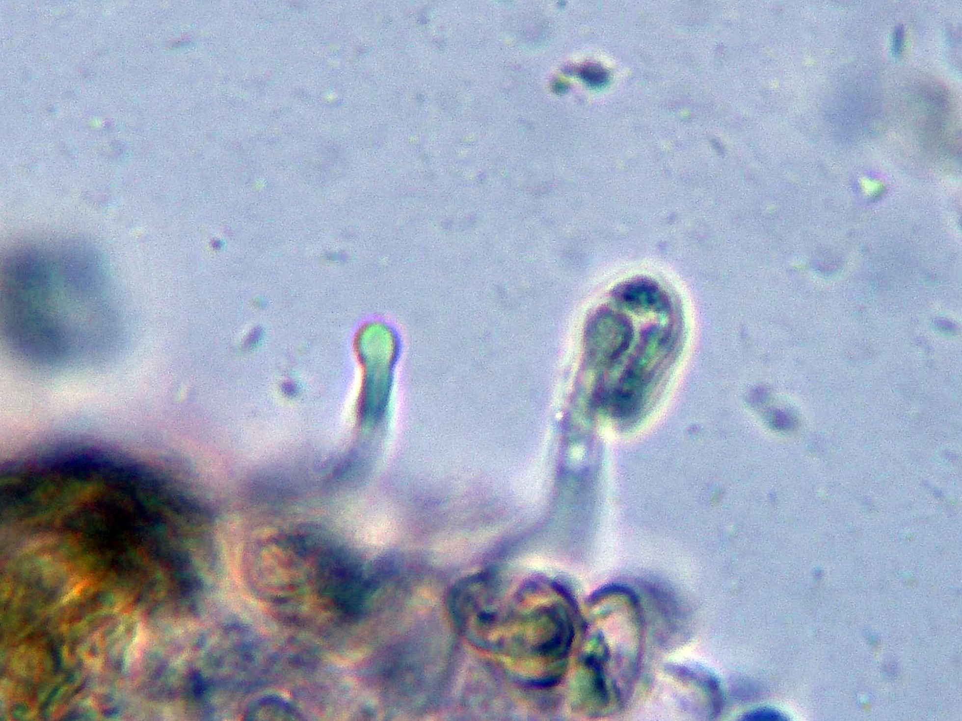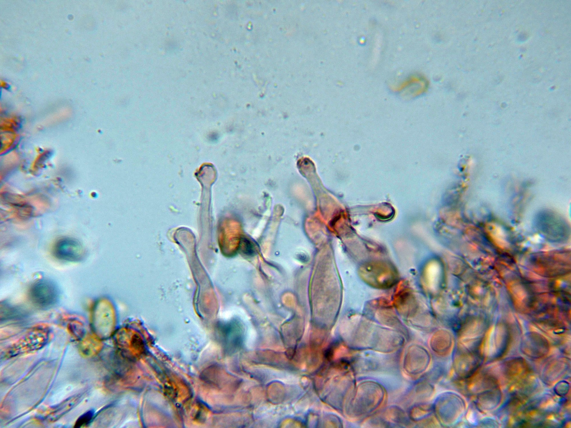 Parte alta del pie con caulocistidios ensanchados en el ápice, con tendencia a capitados.