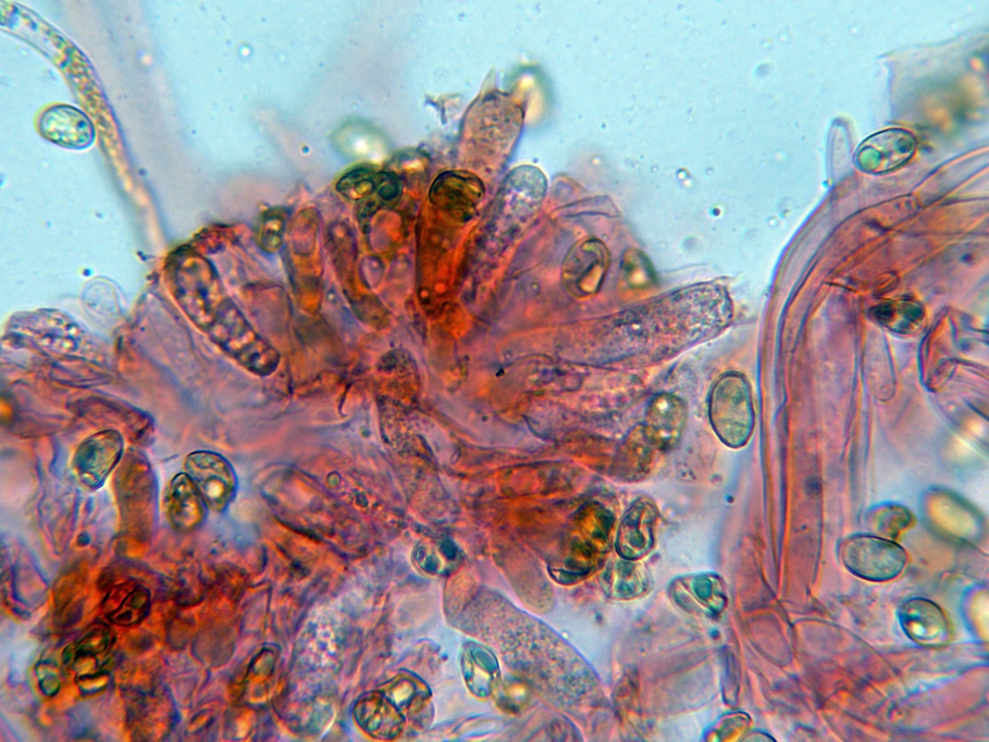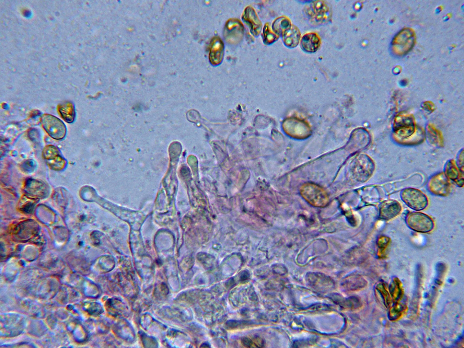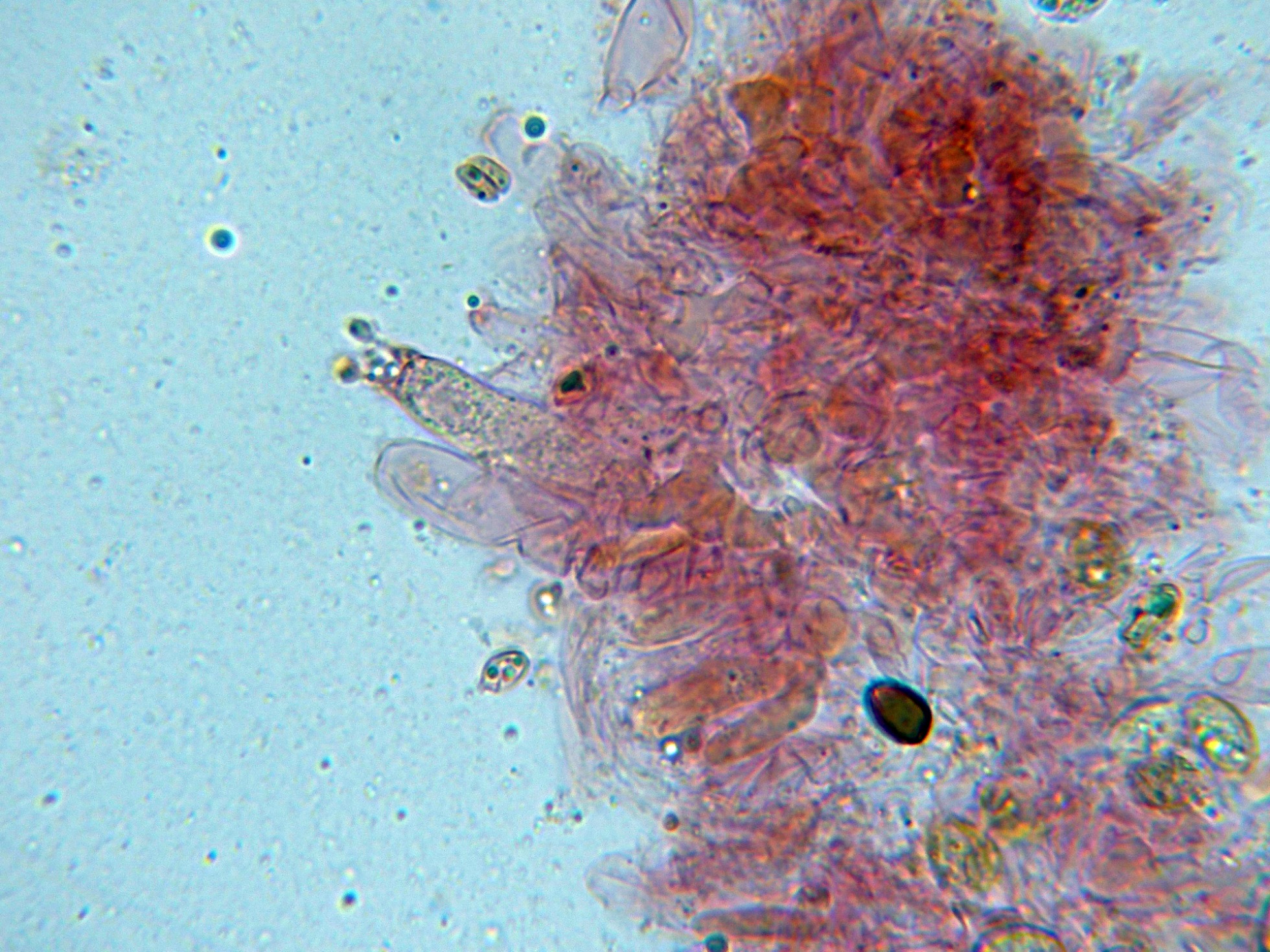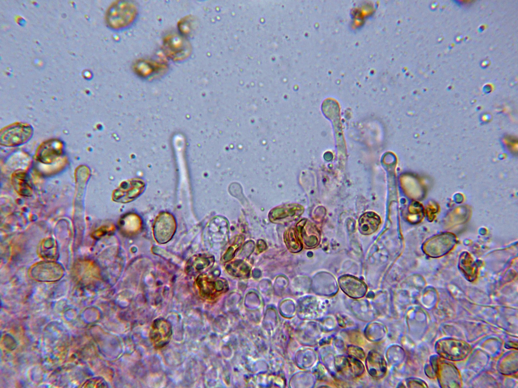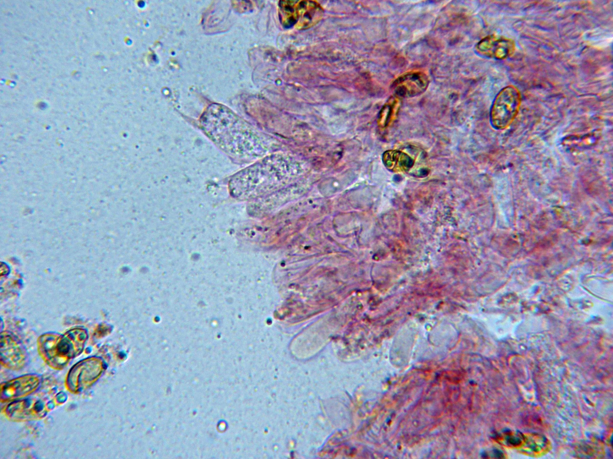 Parte alta del pie con caulocistidios ensanchados en el ápice, con tendencia a capitados.