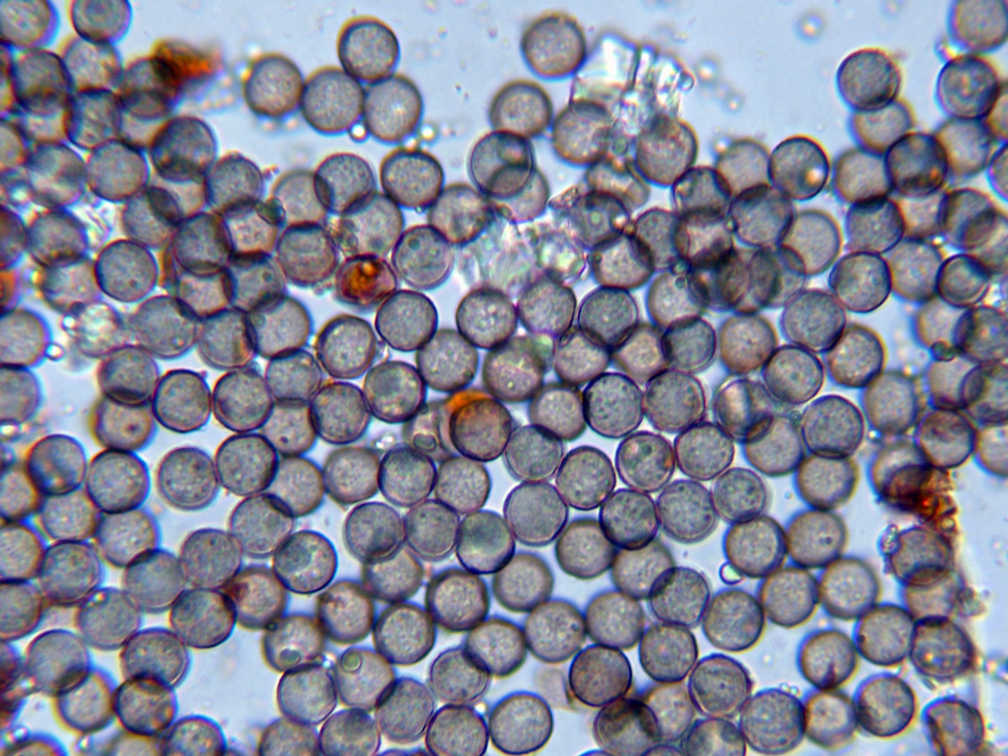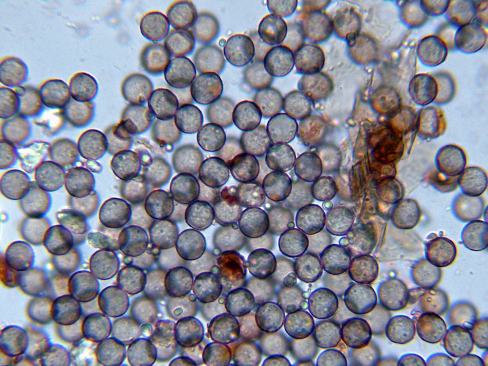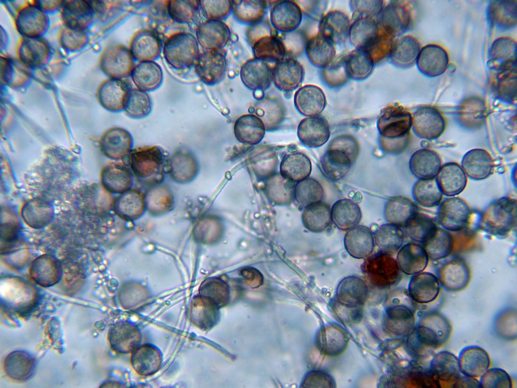 Y sus esporas esféricas moderadamente verrucosas, con algunas verrugas más oscuras: