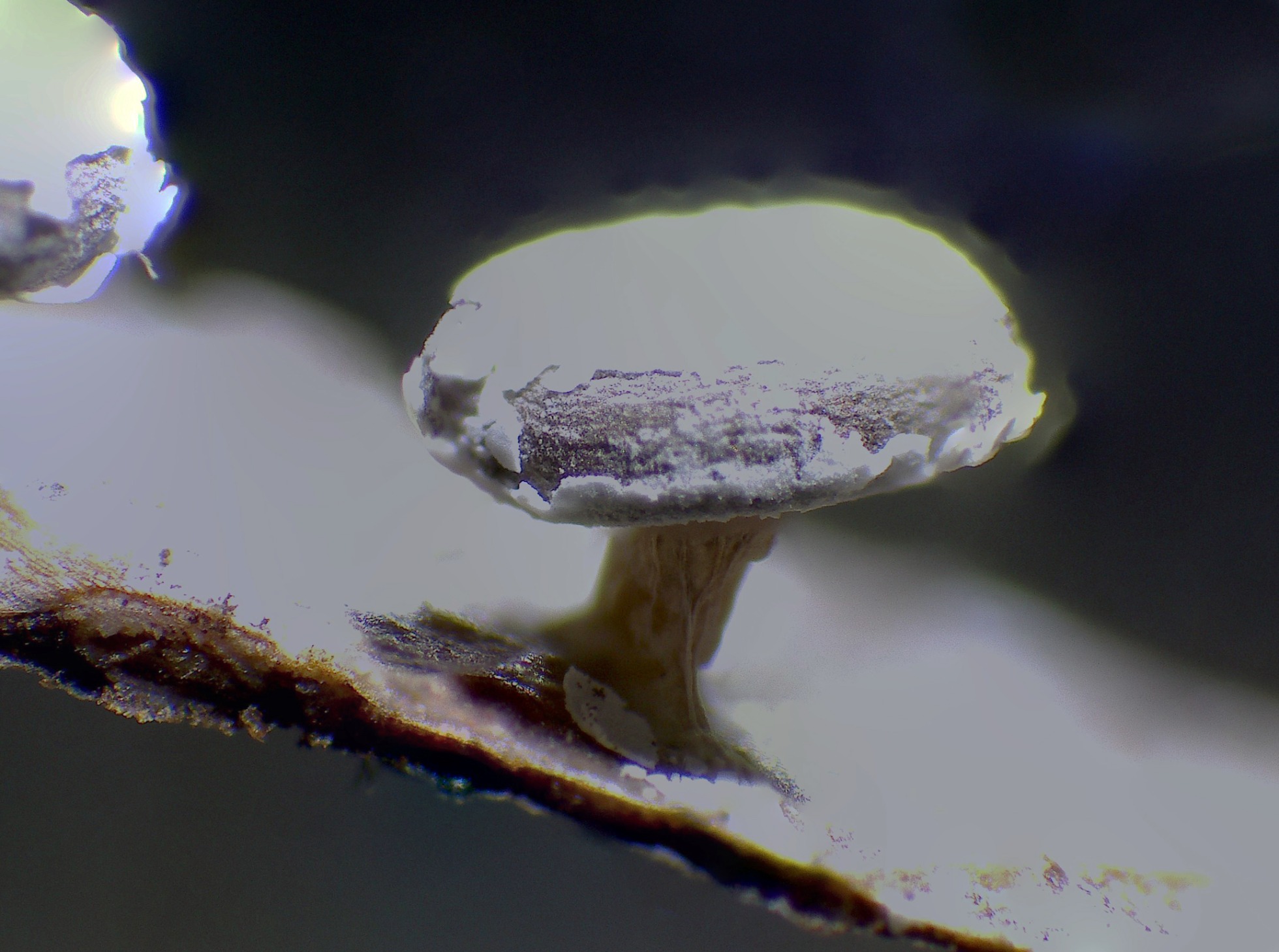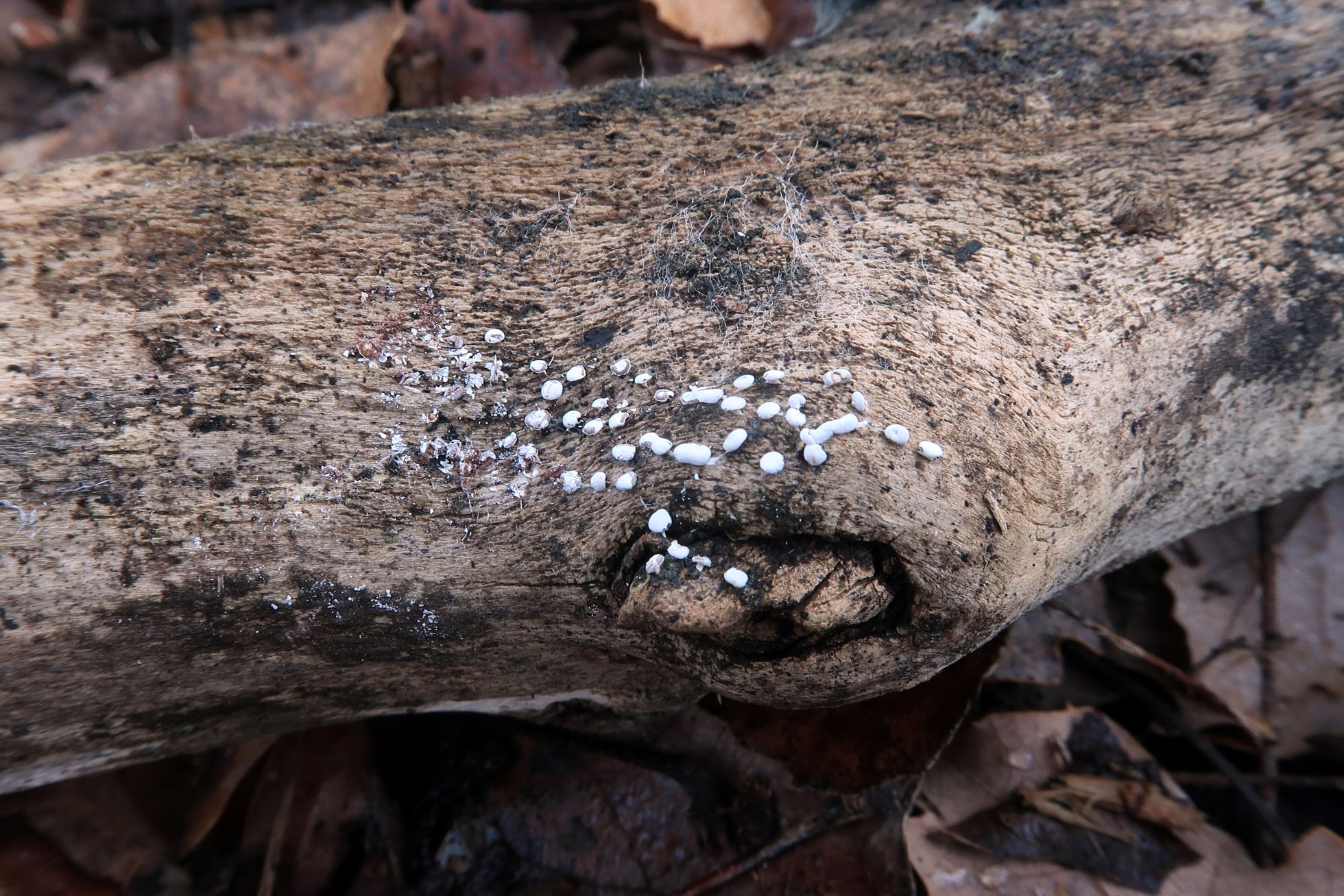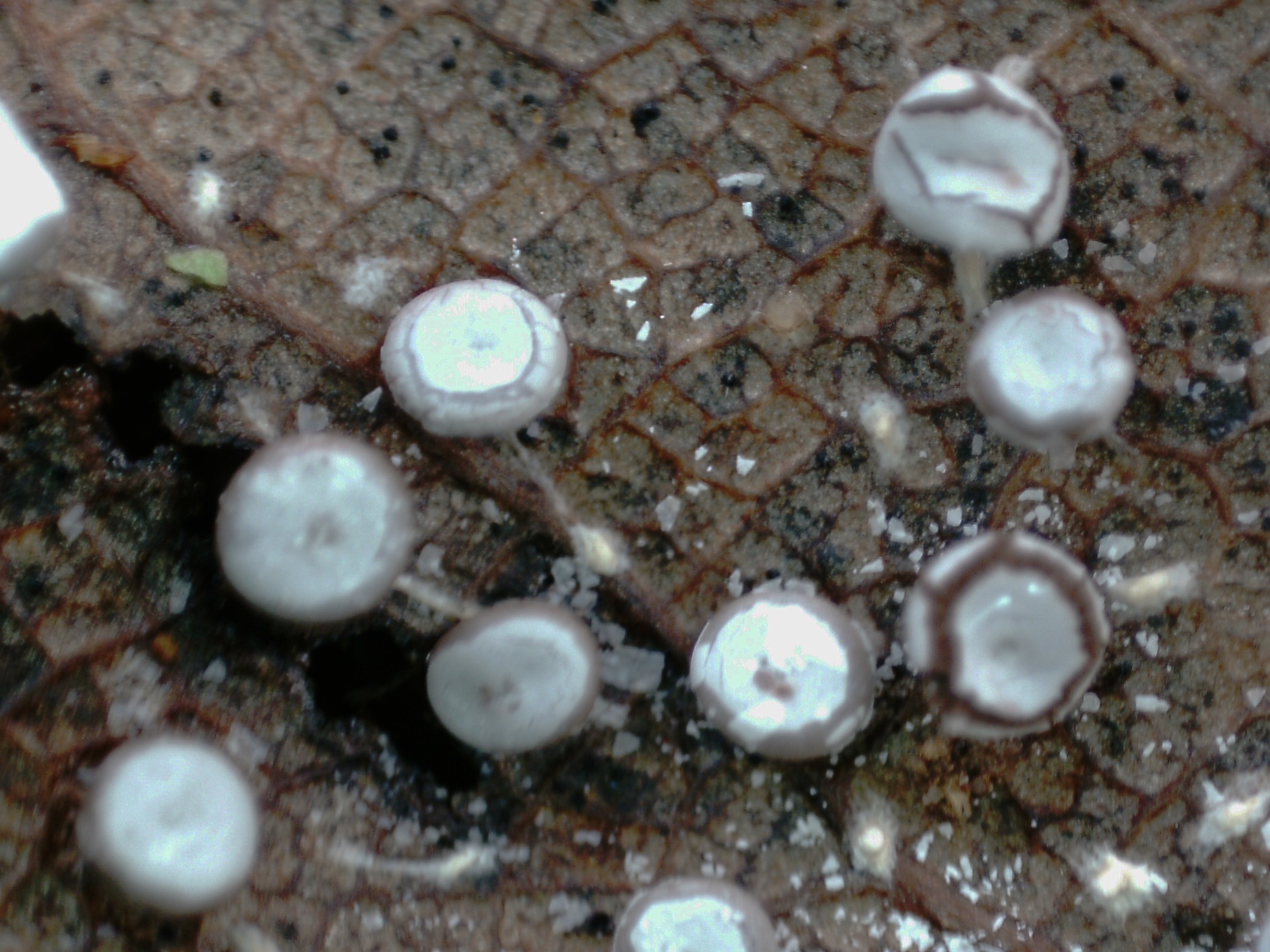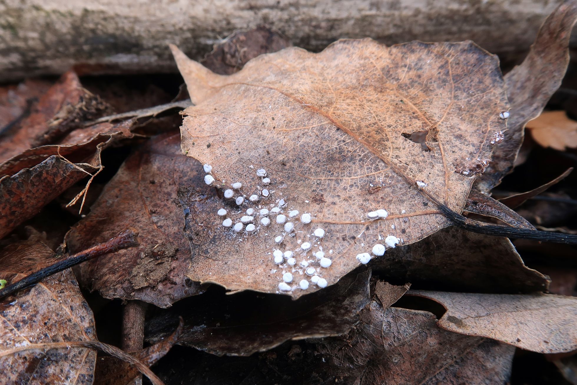 Ejemplares brotando de manera dispersa pero abundante tanto sobre las hojas del suelo, como directamente sobre la madera, de hasta un máximo de 1,5 mm. de diámetro.