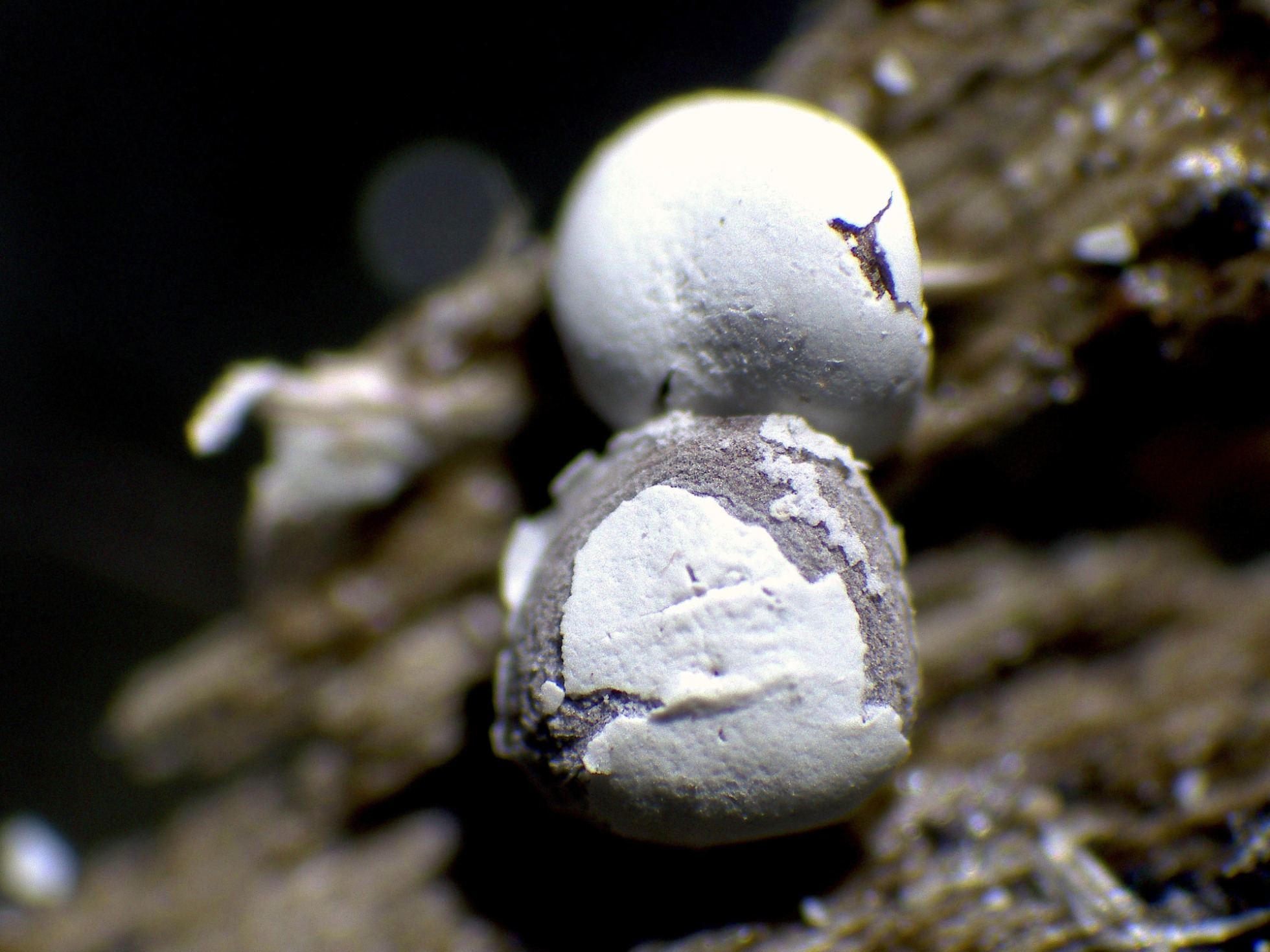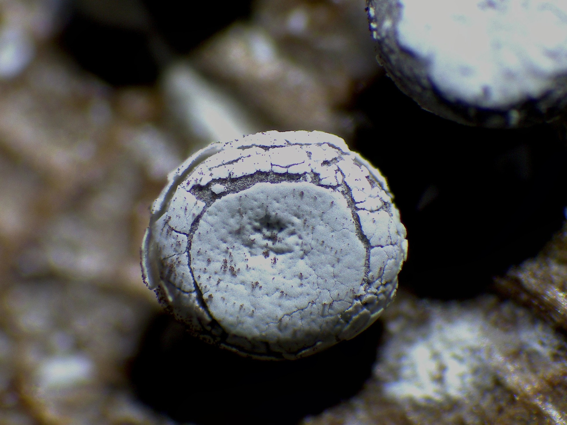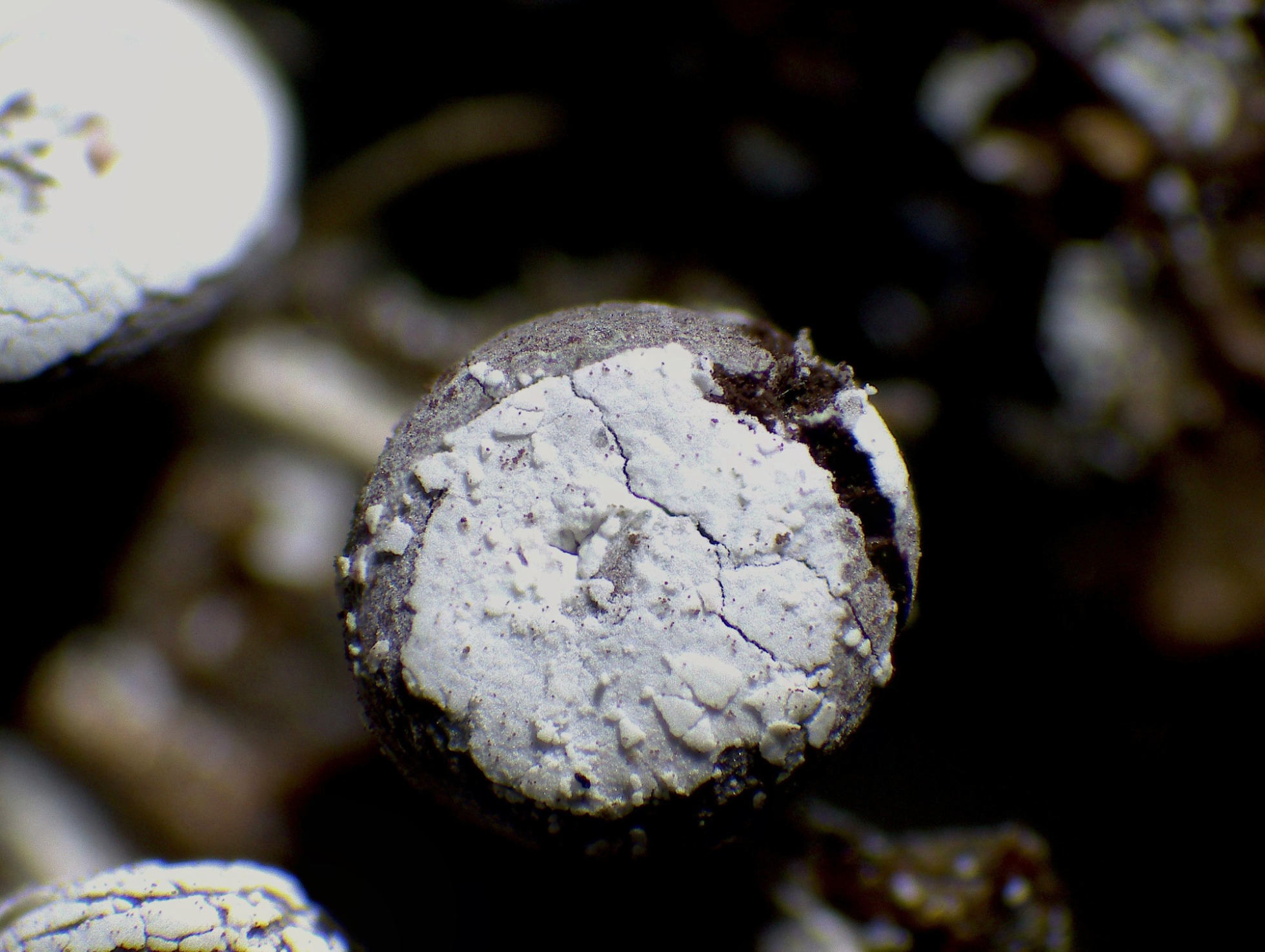 Su superficie a 40 aumentos, con el peridio de la capa externa con dehiscencia circuncisa: