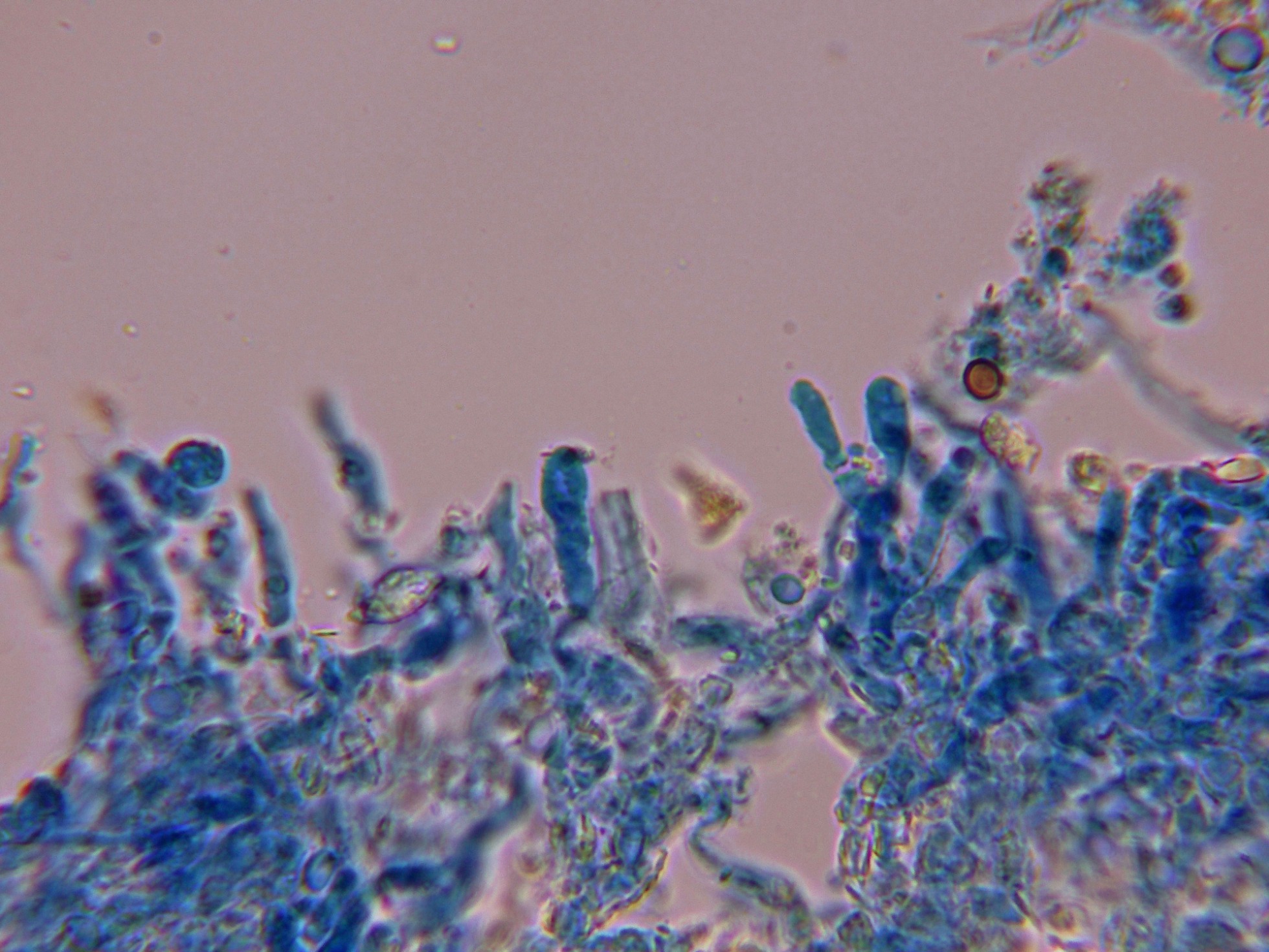 Una de las características de los basidios del género Cristinia, son sus basidios fuertemente cianófilos, que se tiñen de azul con el azul de algodón.