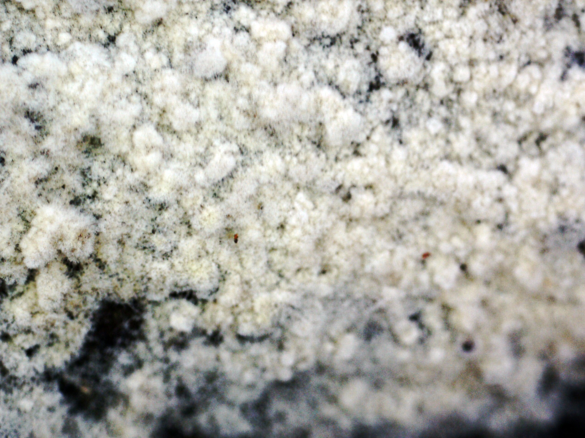 Fructificación completamente resupinada, de poco grosor, de color crema blanquecino, con su superficie muy ligeramente verrucosa - granulosa con el borde de crecimiento plumoso, con finos rizomorfos.