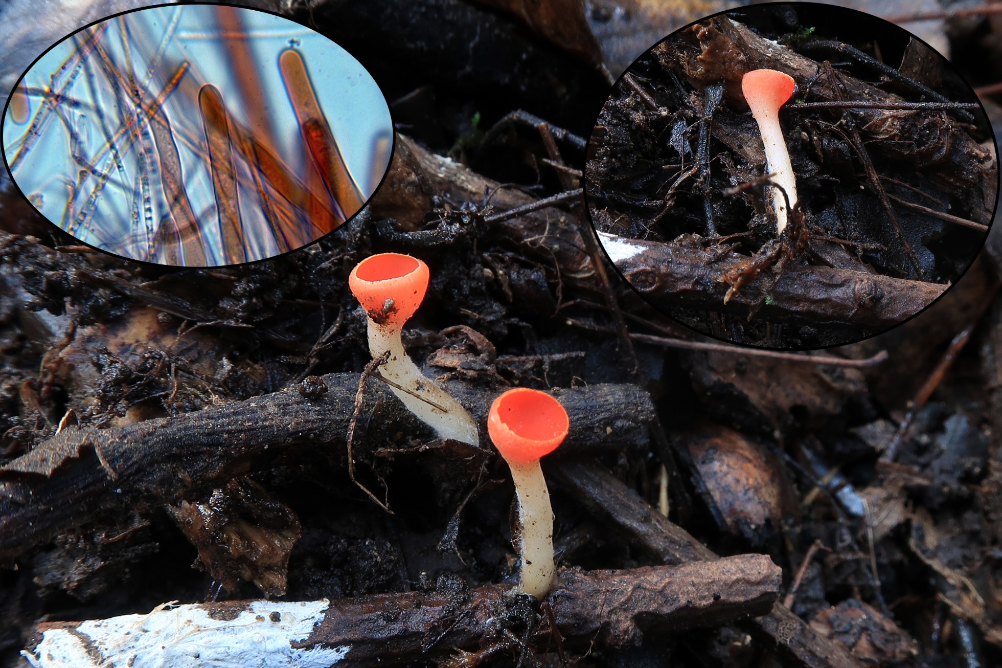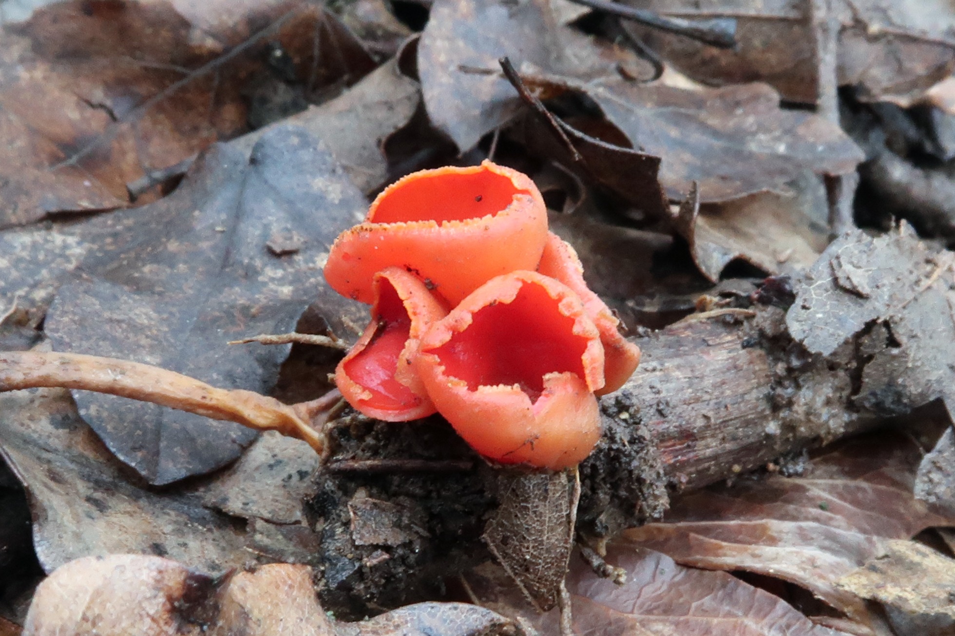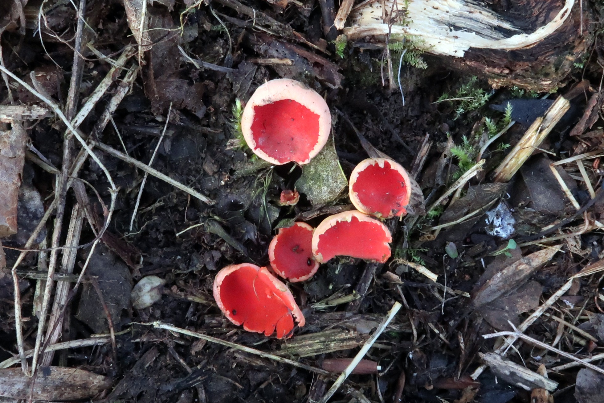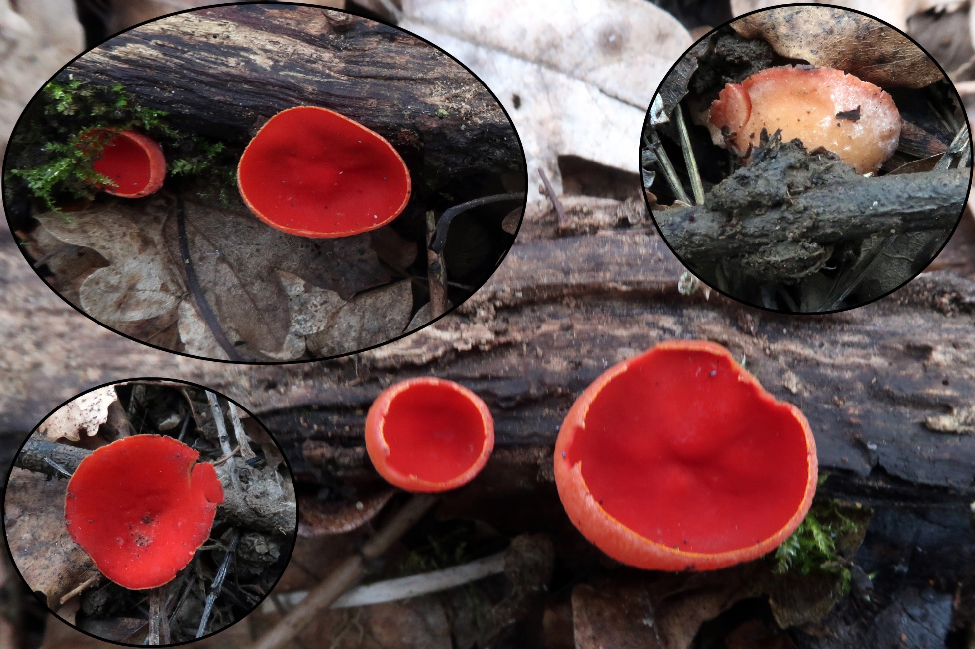 Unos pequeños ejemplares inmaduros de la muy vistosa Sarcoscypha coccinea.