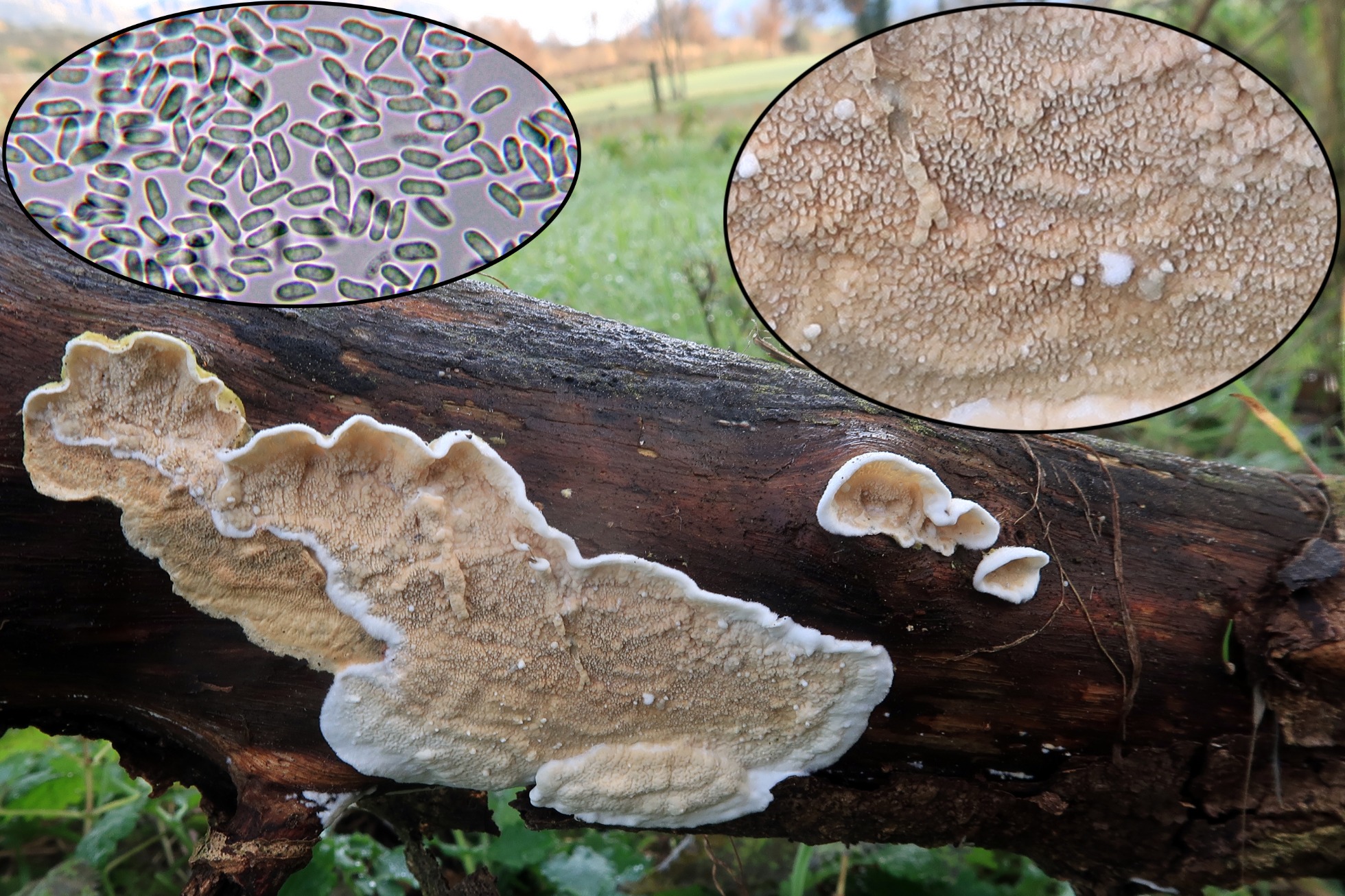 En plena forma, tan fino como el mismo papel, con himenio meruloide, de nuevo el Byssomerulius corium.