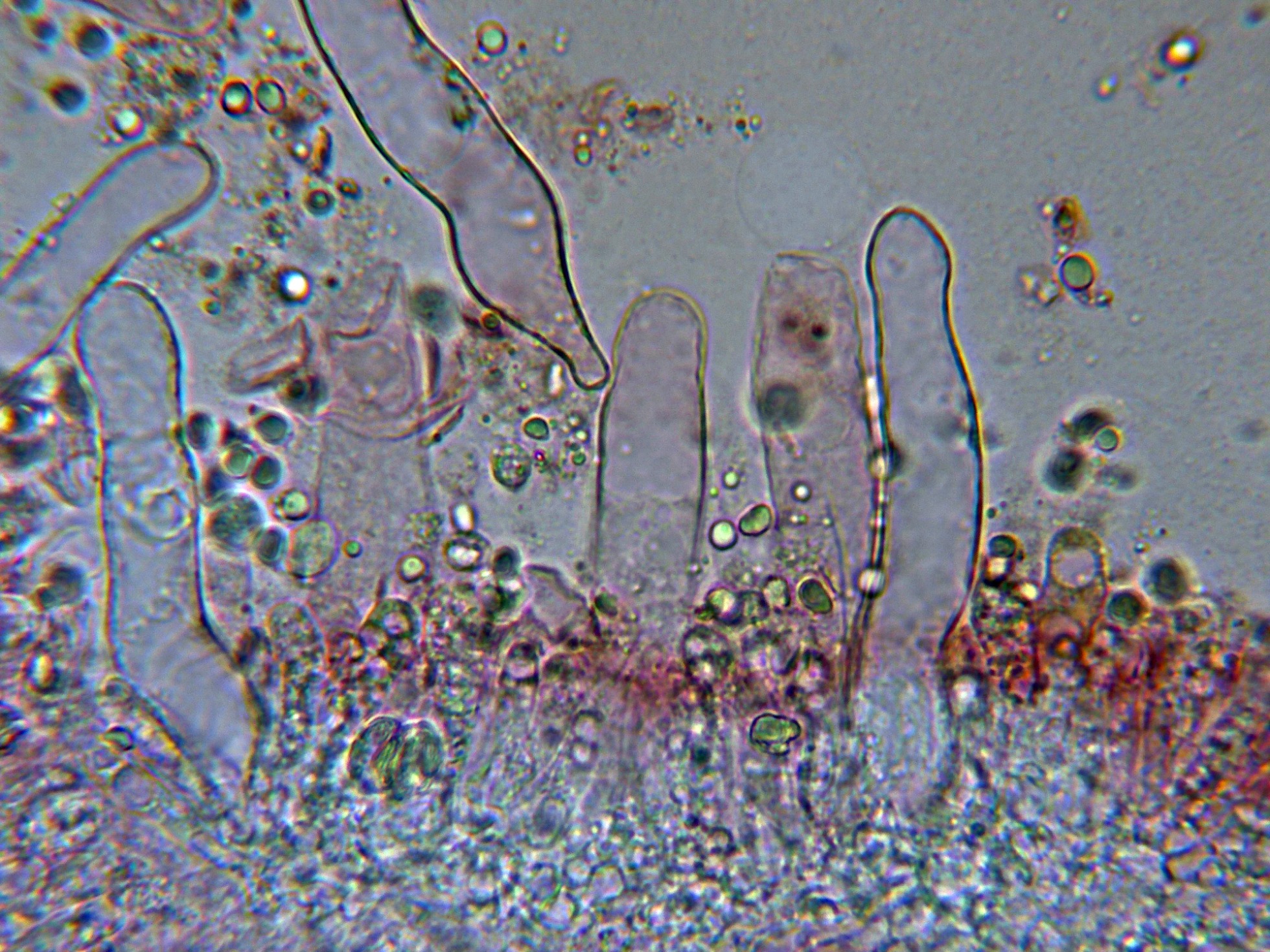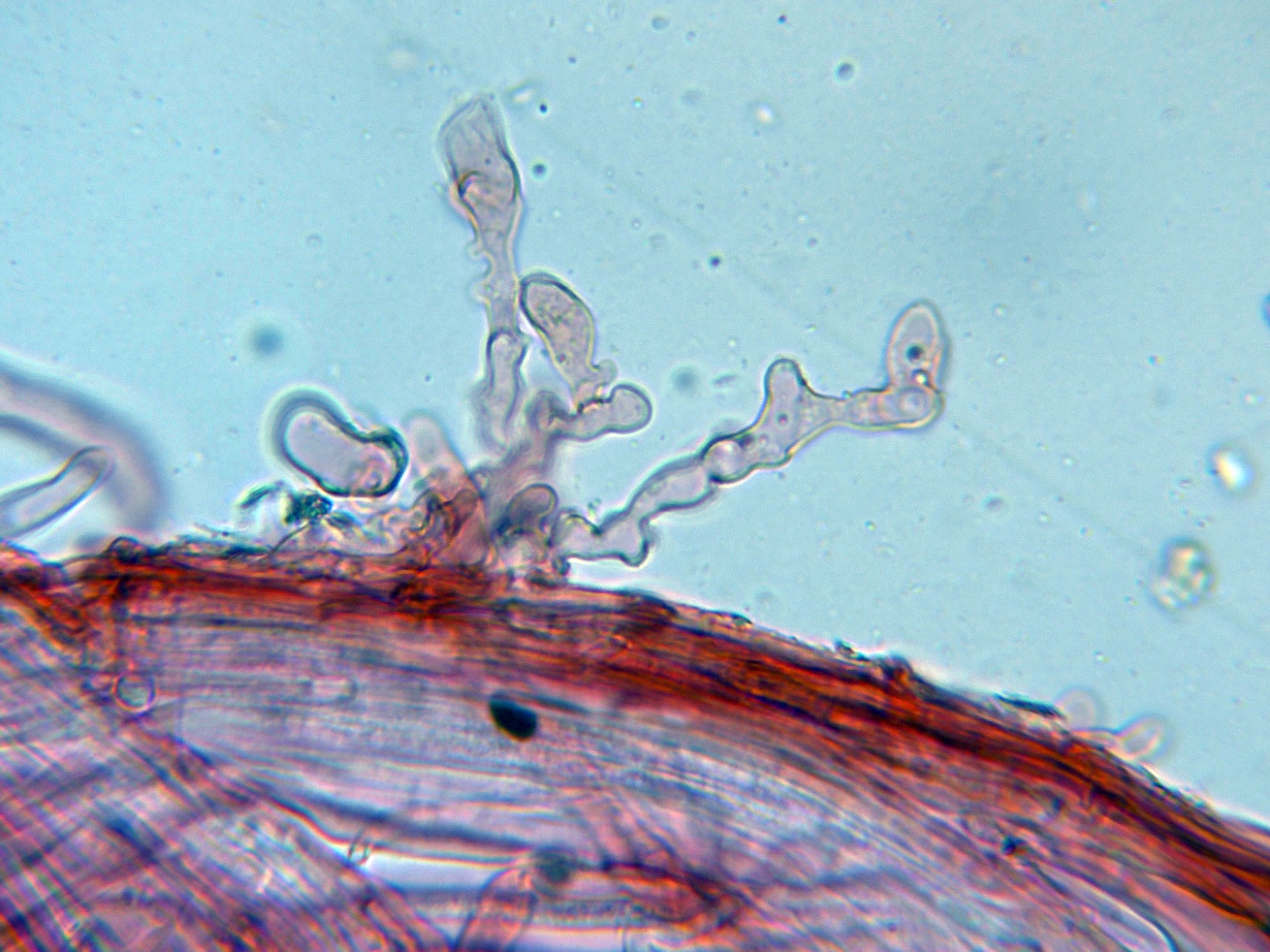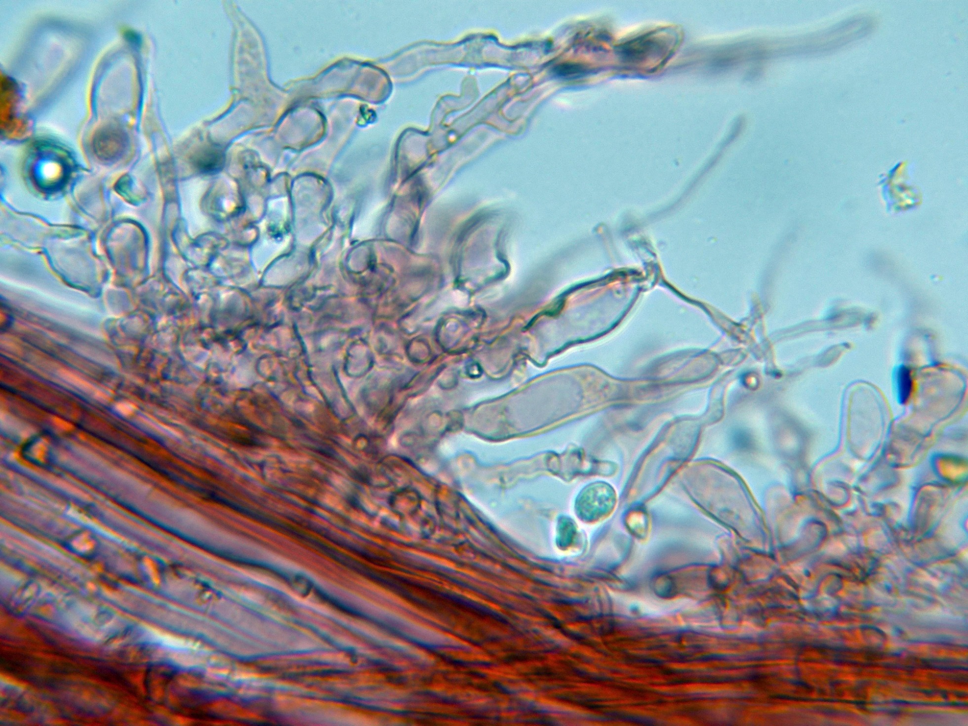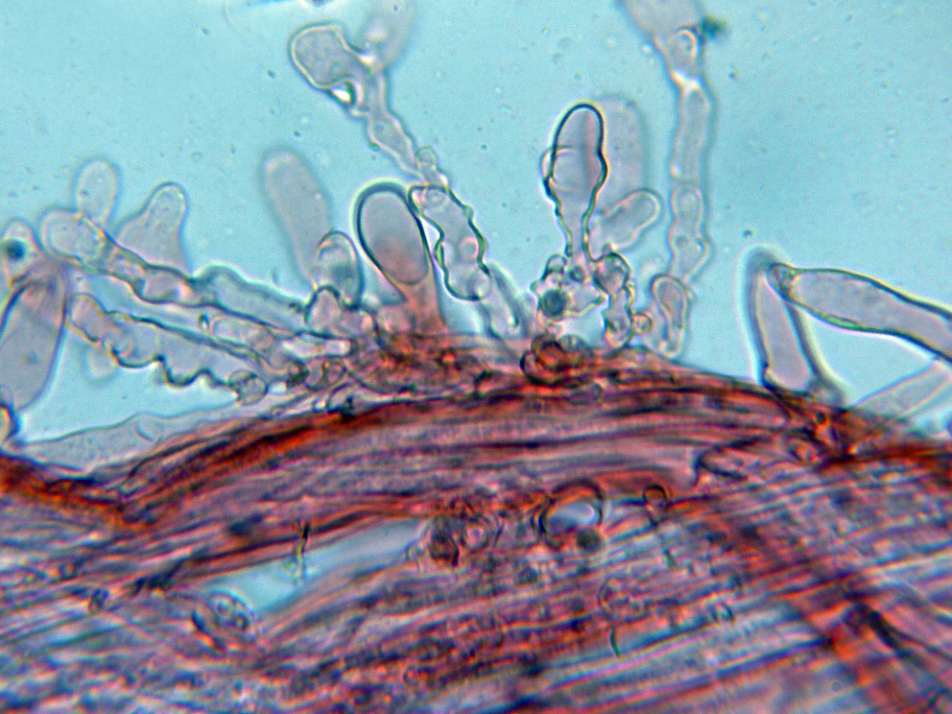 Caulocistidios muy numerosos en la parte alta del pie, cilíndricos sinuosos, muy irregulares y hasta algunos ramificados.