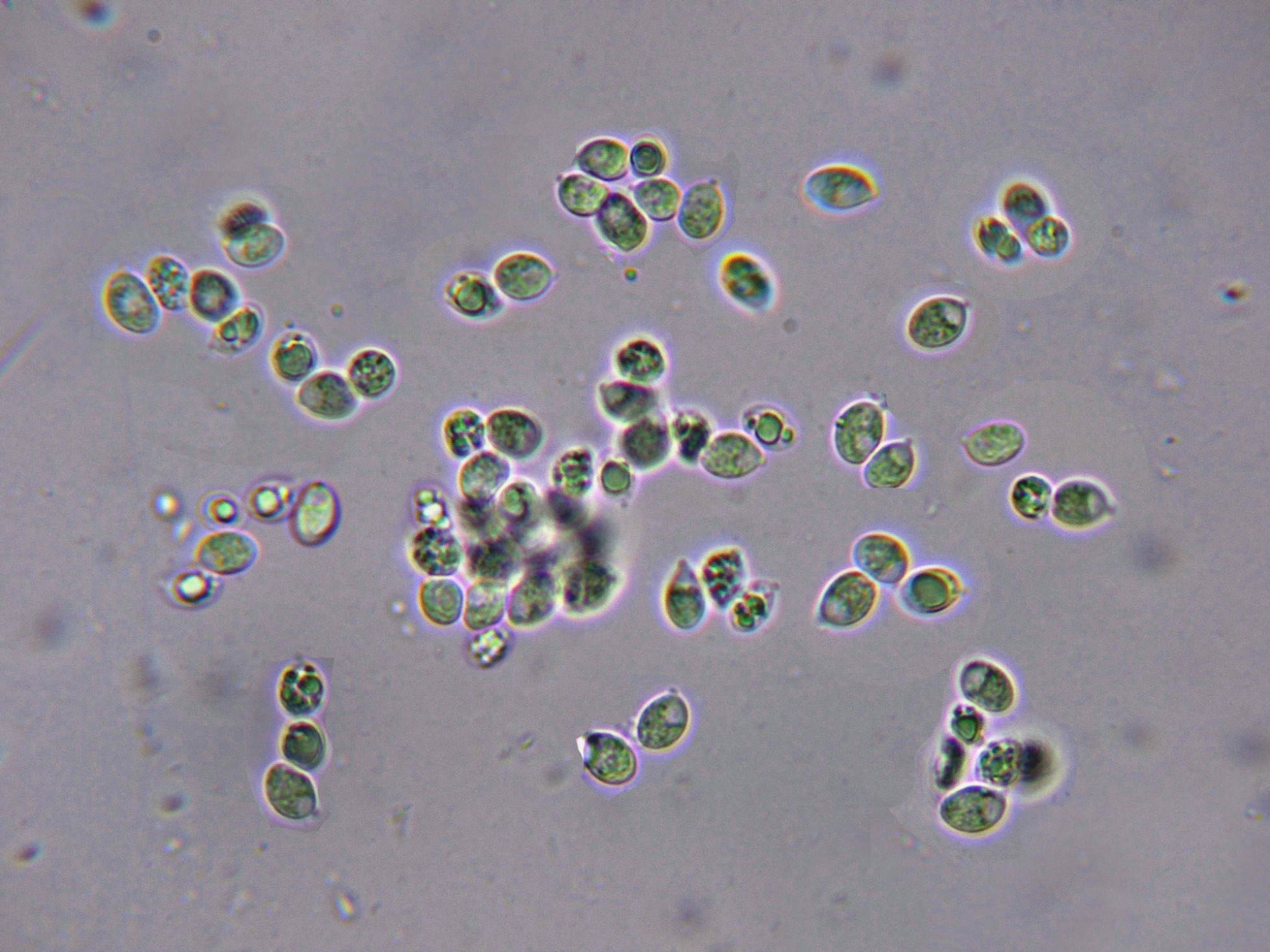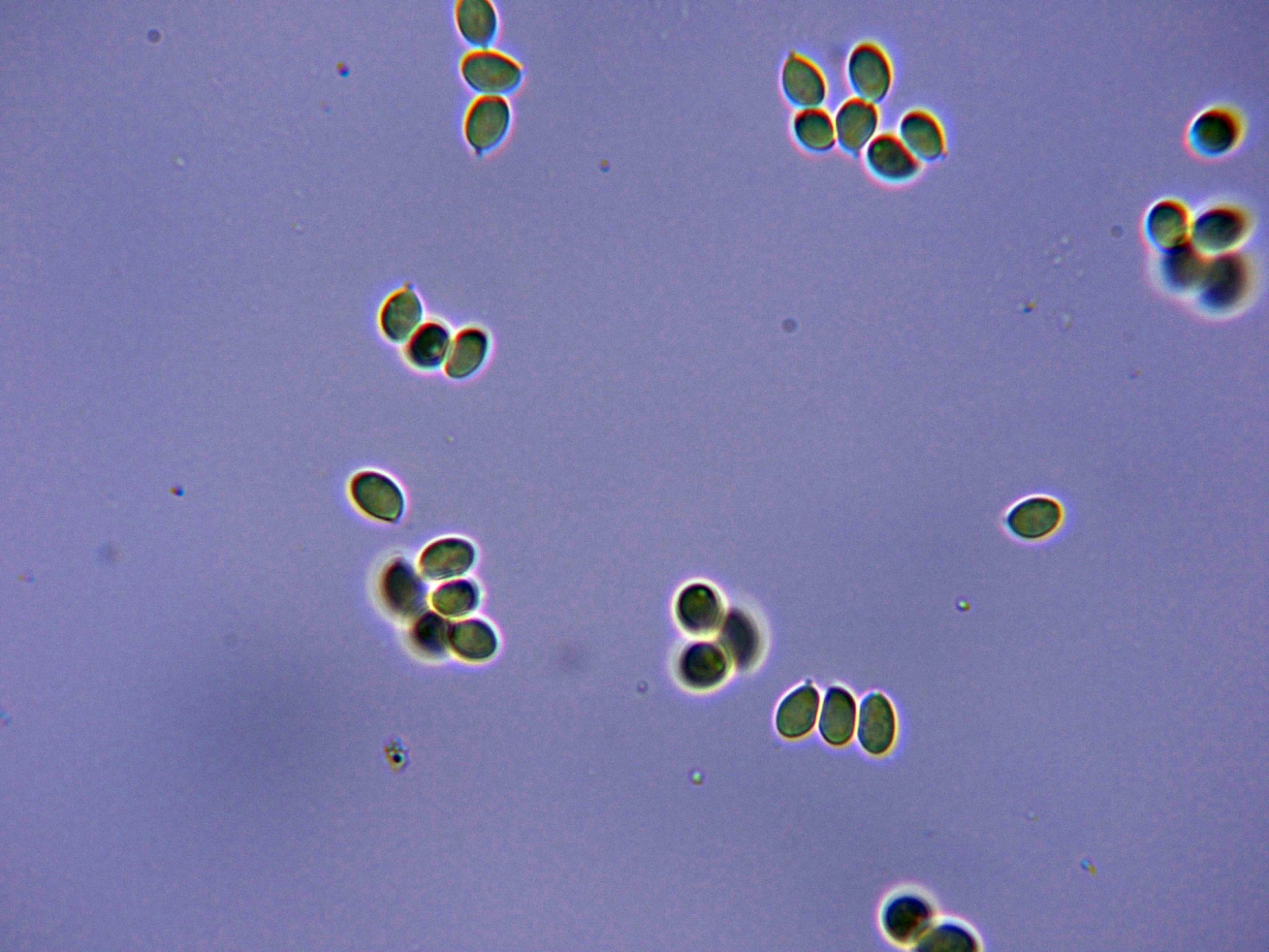 Una imágen de las esporas en Reactivo de Melzer, con reacción amiloide del aparato apical.