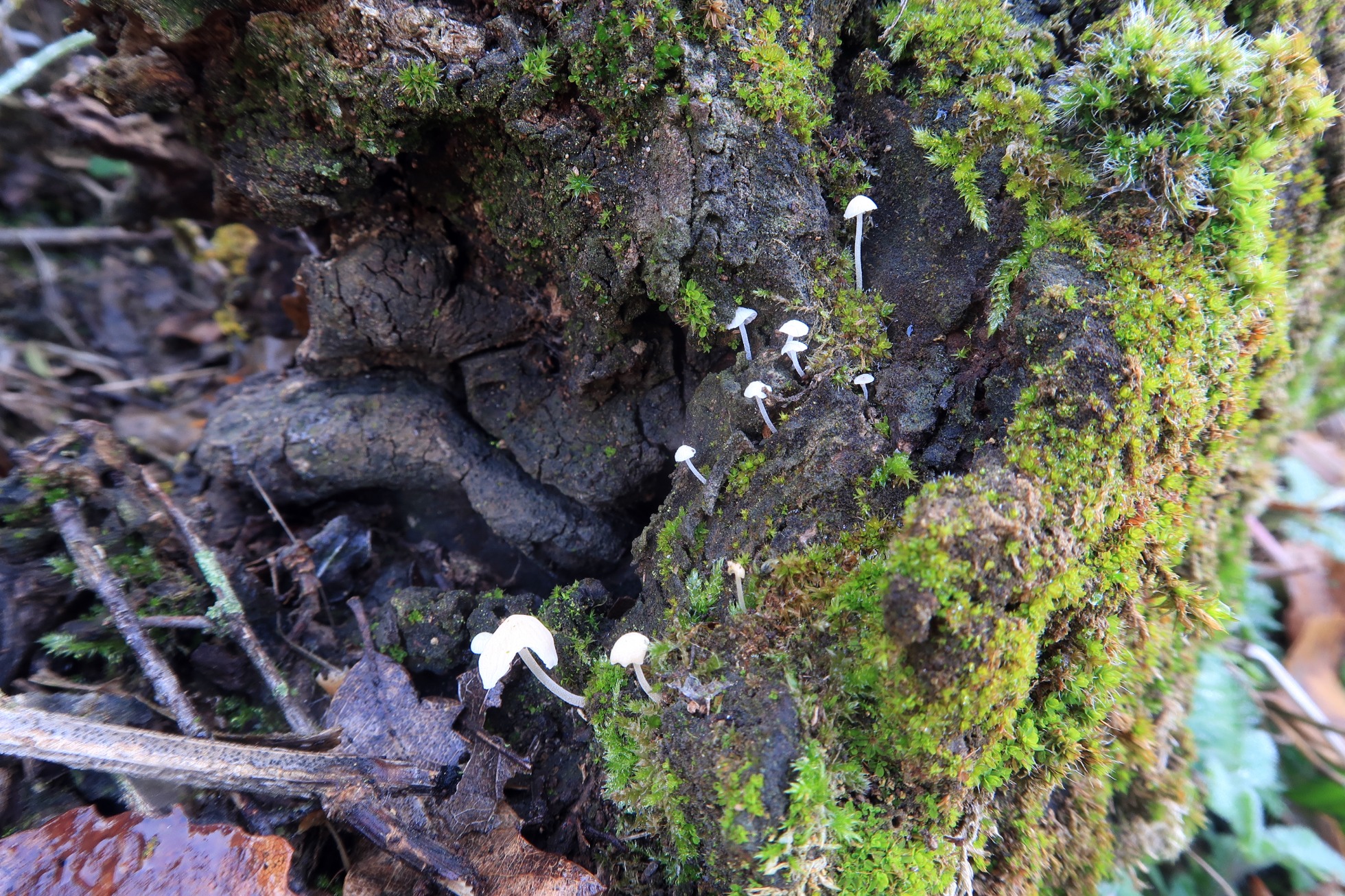 Un grupito de Mycenas de pequeño tamaño brotando sobre la corteza de un tronco de roble.