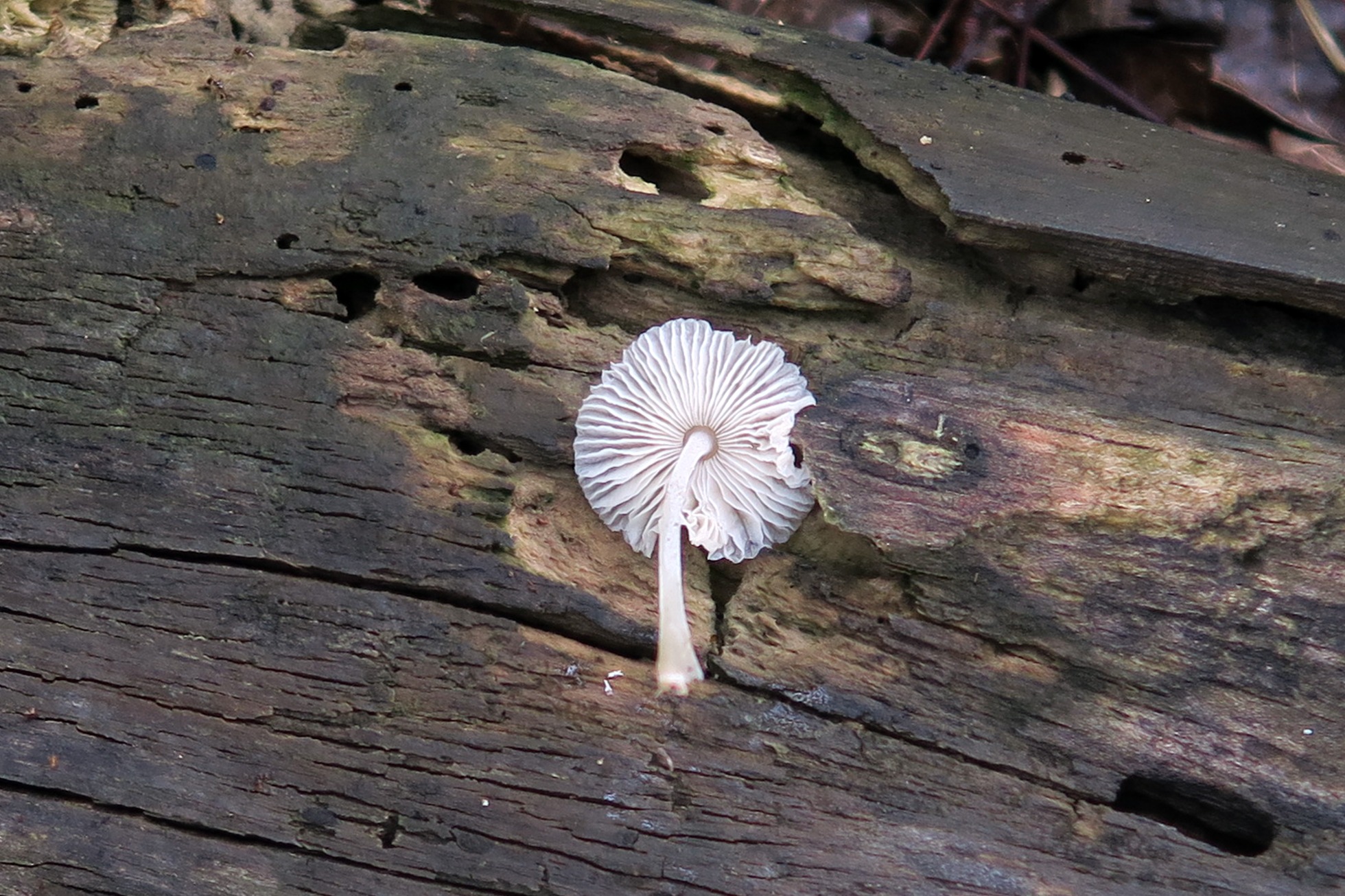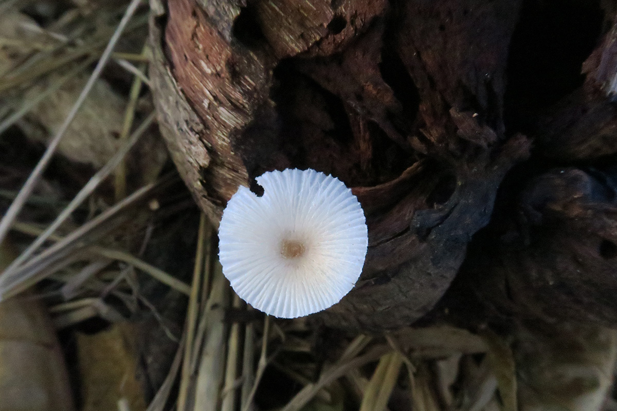 Sombrero blanquecino con el centro de color pardo marrón, de pequeño tamaño, a lo sumo unos 2 cm. de diámetro el mayor, con aspecto de Parasola o paraguas chino, con pliegues radiales y carne prácticamente inexistente.