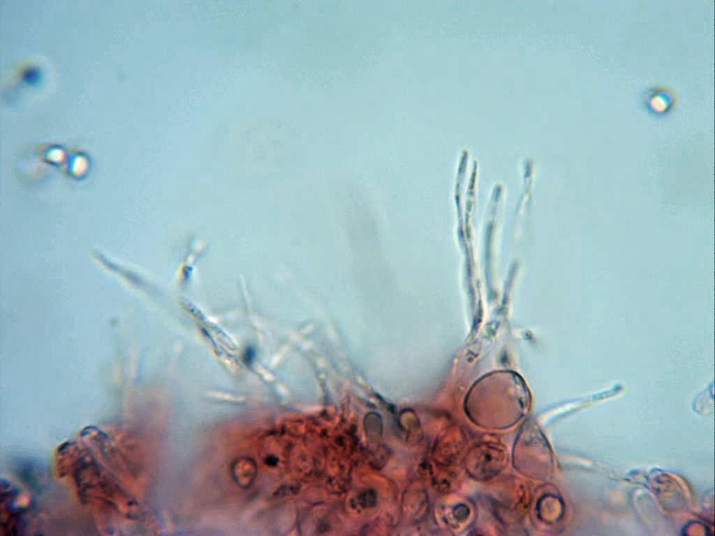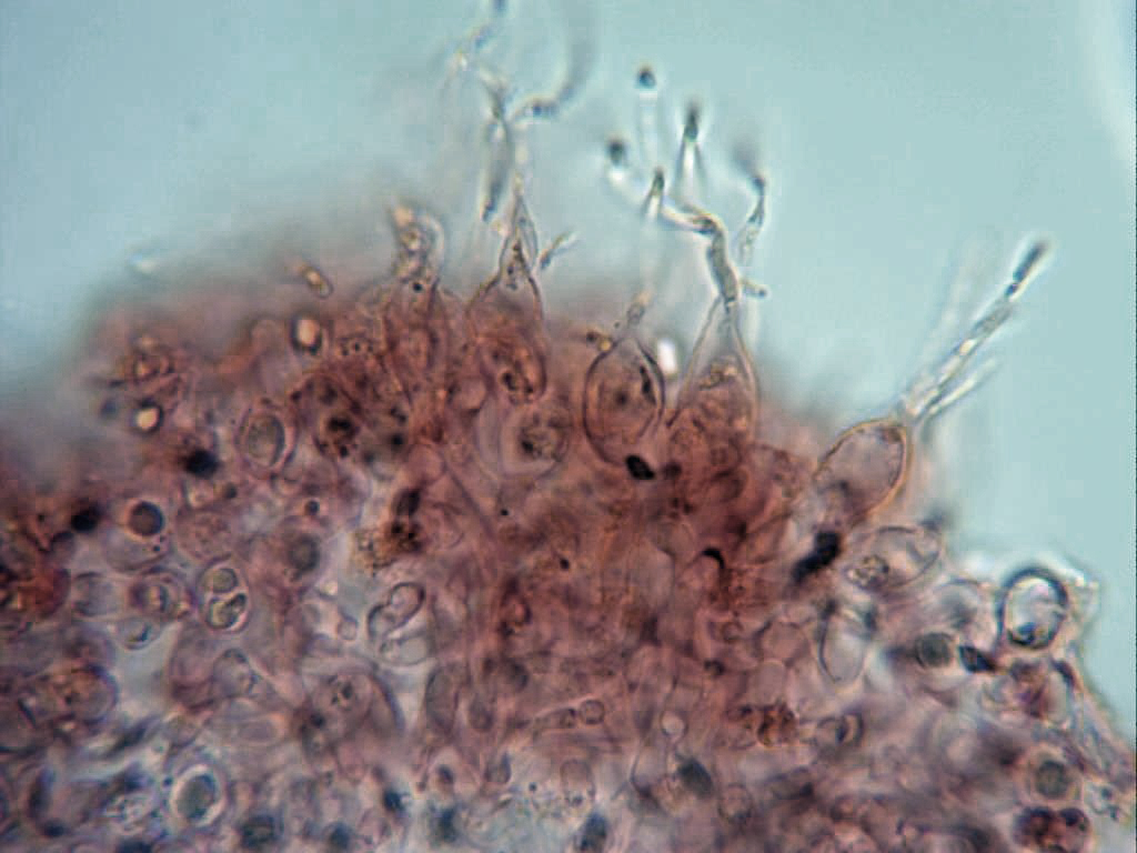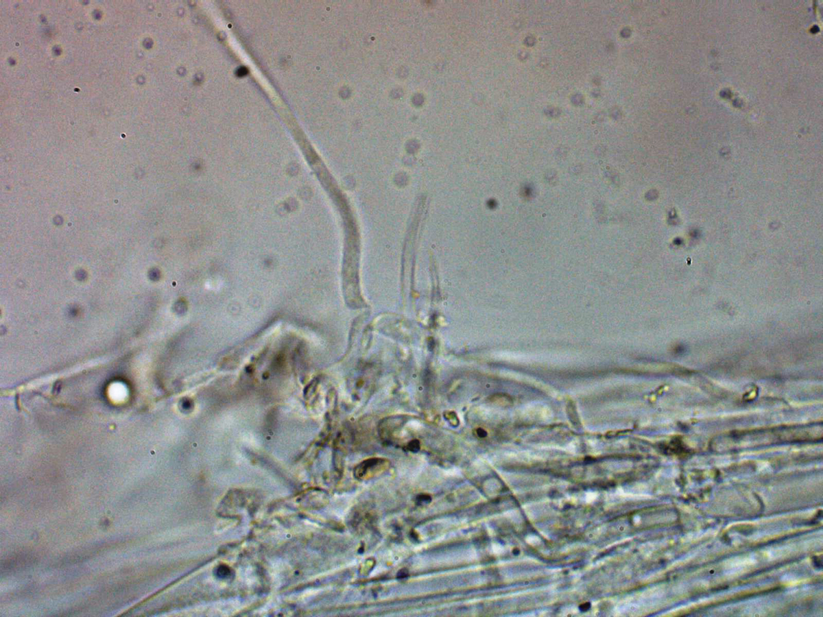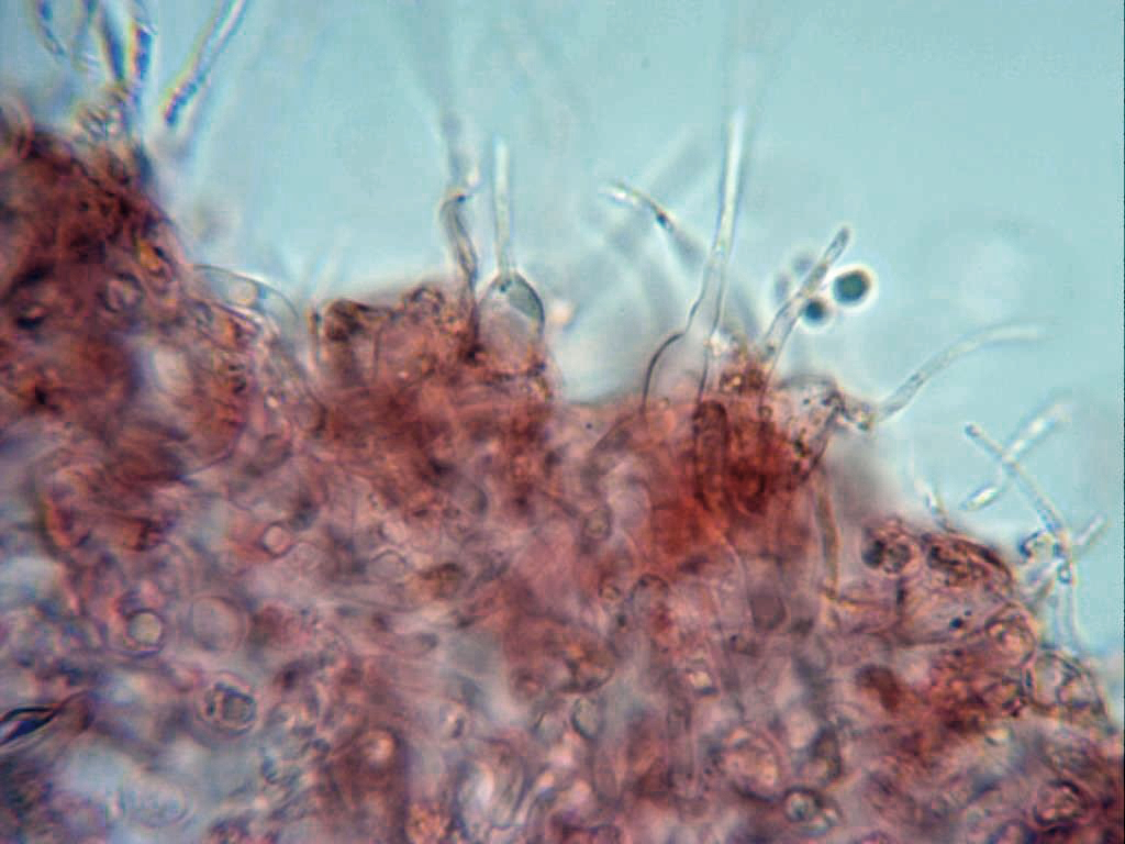 Parte alta del pie con excrecencias abundantes y con algunas hifas terminales muy alargadas y filamentosas en ramilletes a modo de caulocistidios.