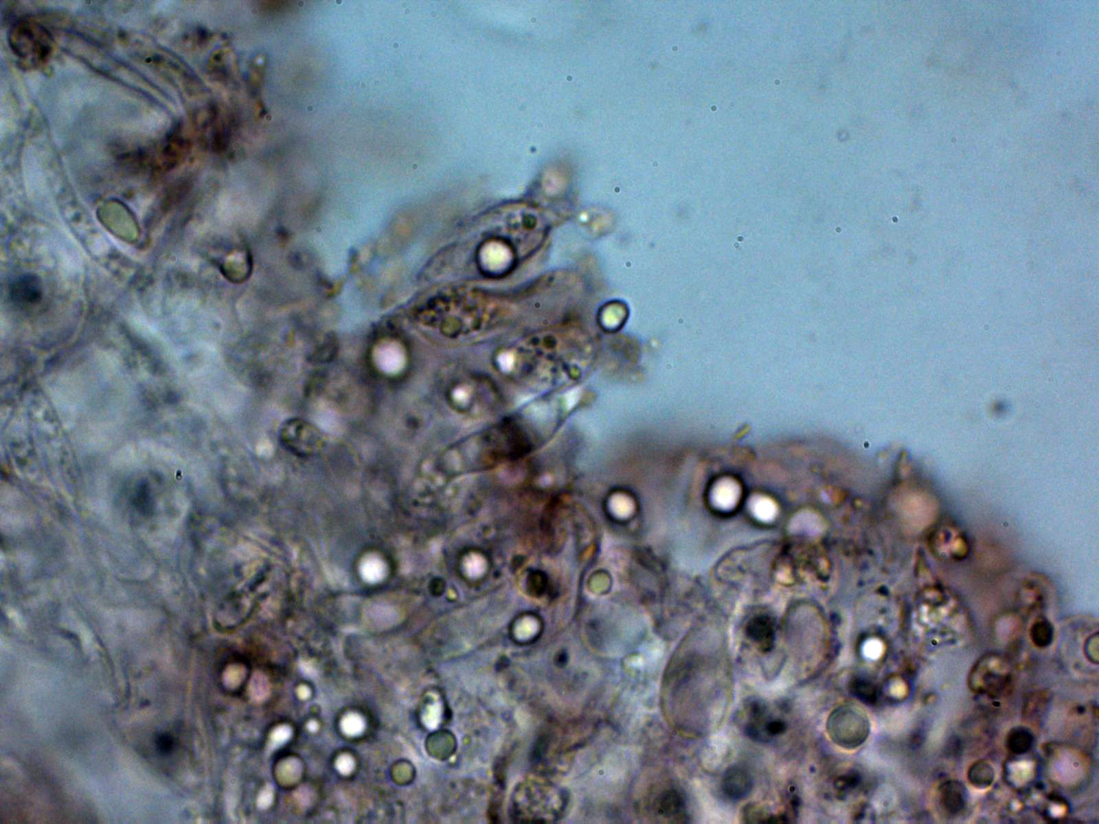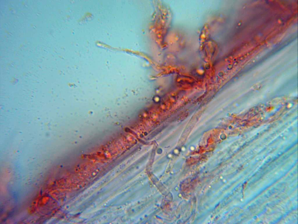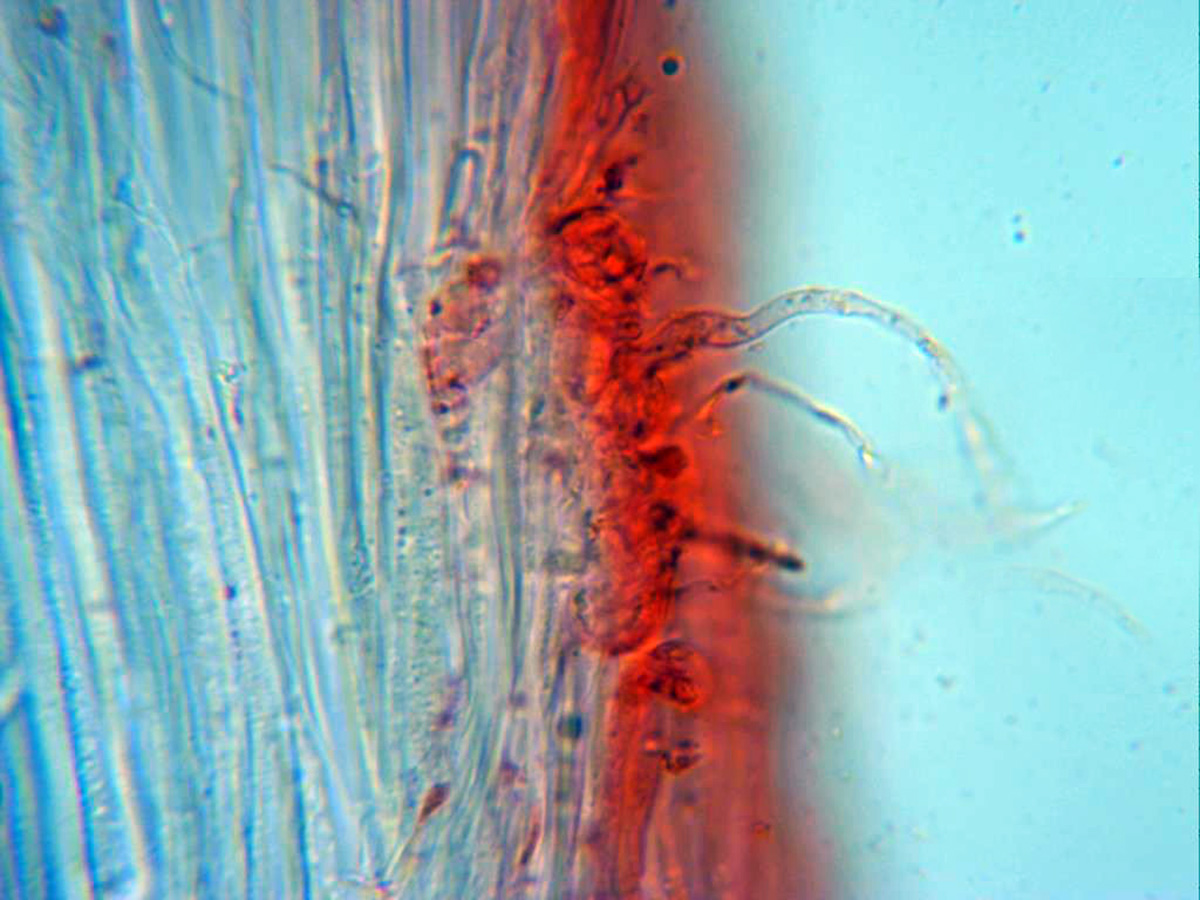 Parte alta del pie con excrecencias abundantes y con algunas hifas terminales muy alargadas y filamentosas en ramilletes a modo de caulocistidios.