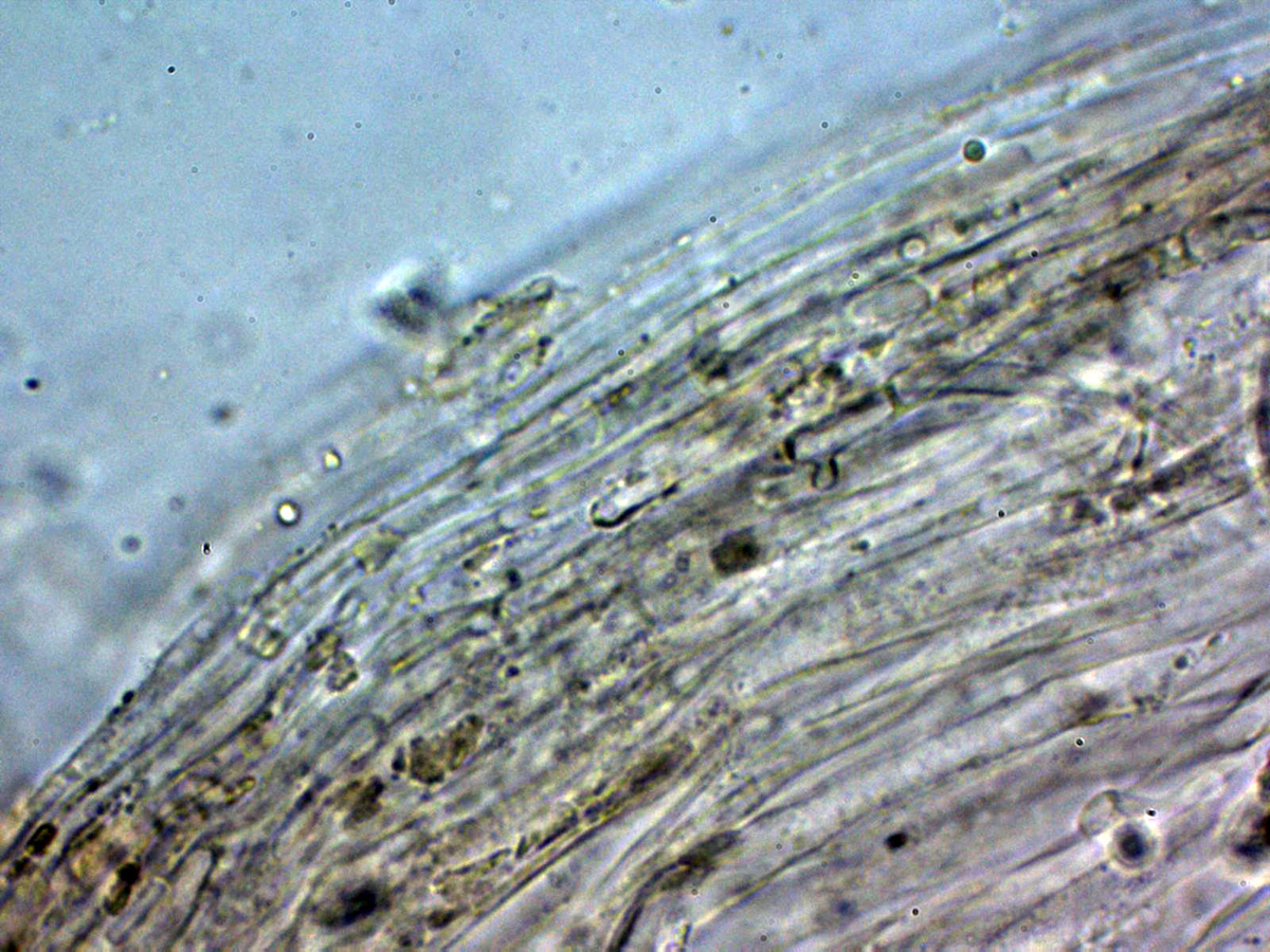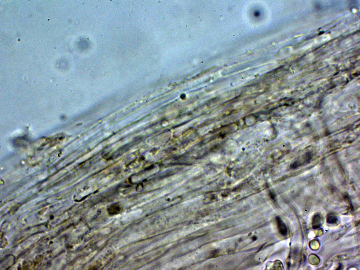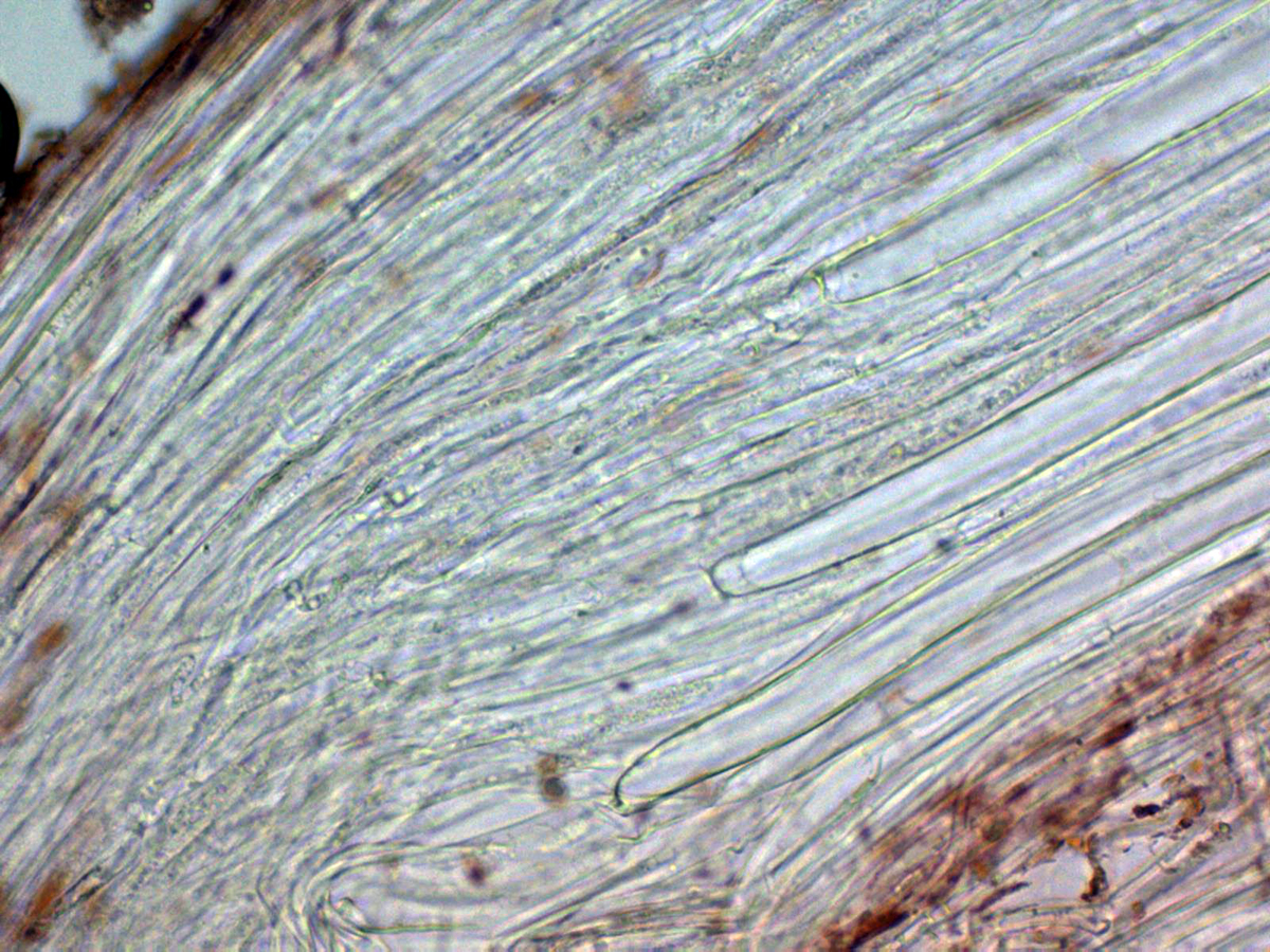 Hifas de la pileipellis dispuestas más o menos paralelamente, con tenues excrecencias a modo de suciedad y alguna que otra digitación corta.