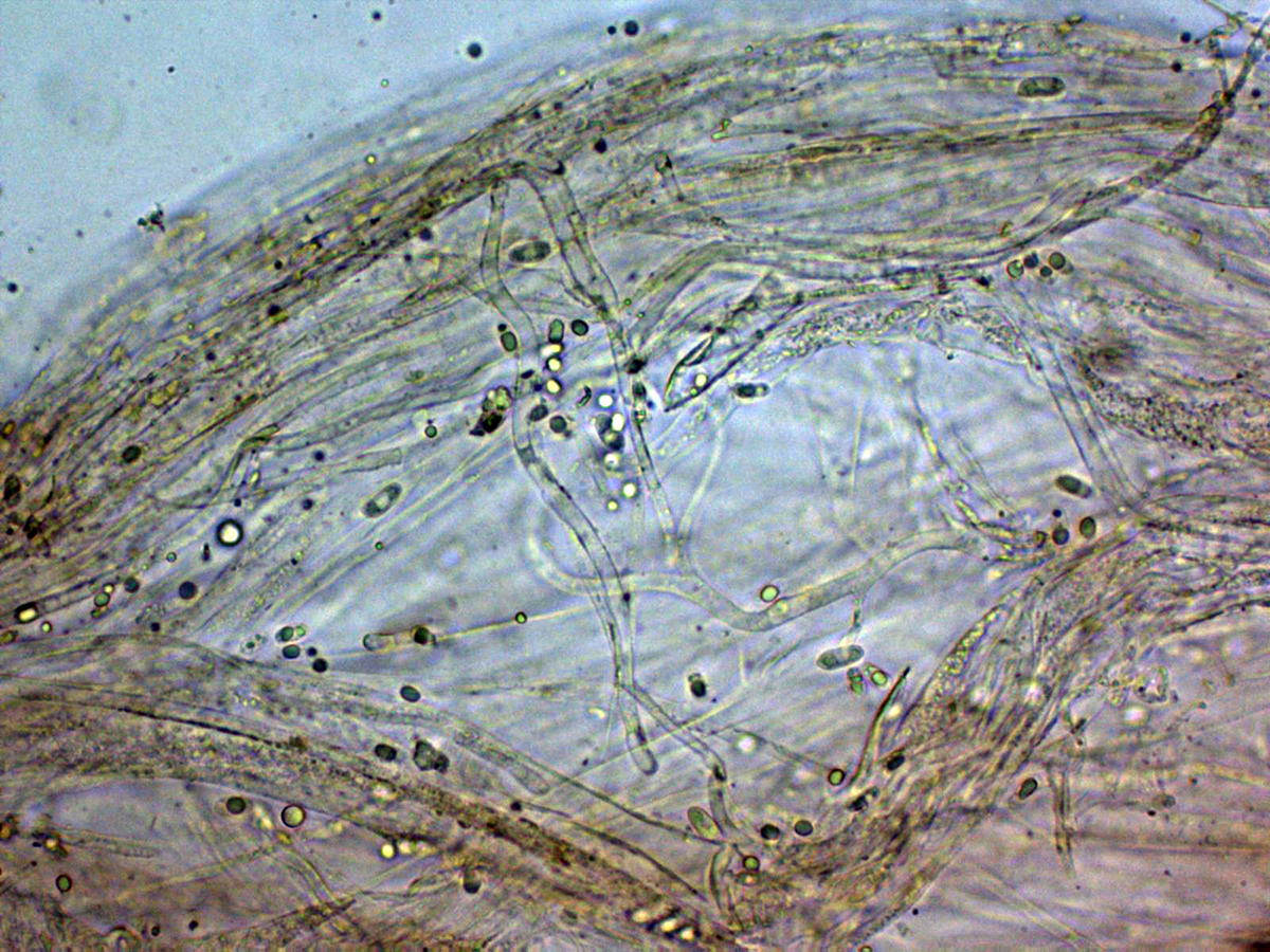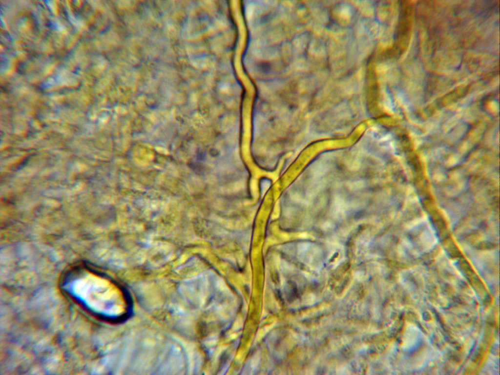 Aunque al fracturar el pie no me pareció observar látex, en la microscopía pude observar algunas hifas que podrían corresponderse con hifas laticíferas, estas hifas serían más visibles en reactivo de Melzer.