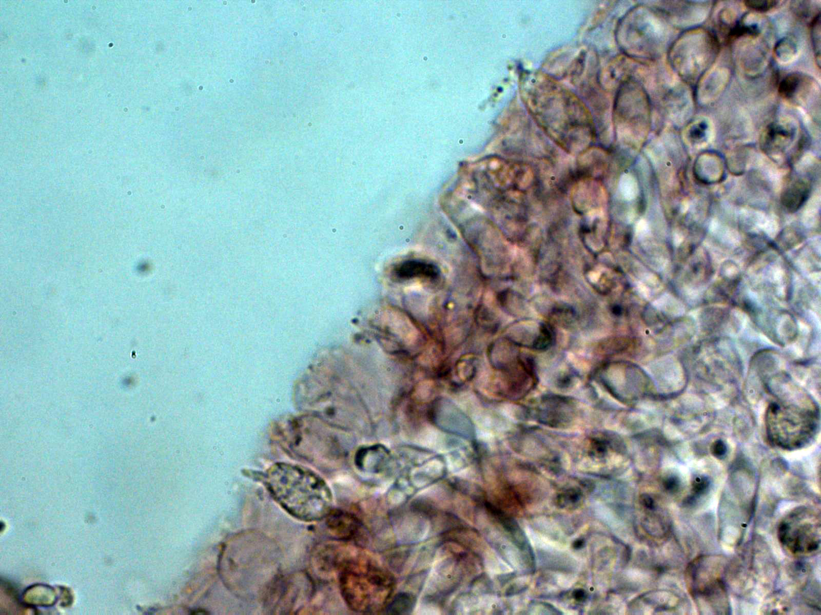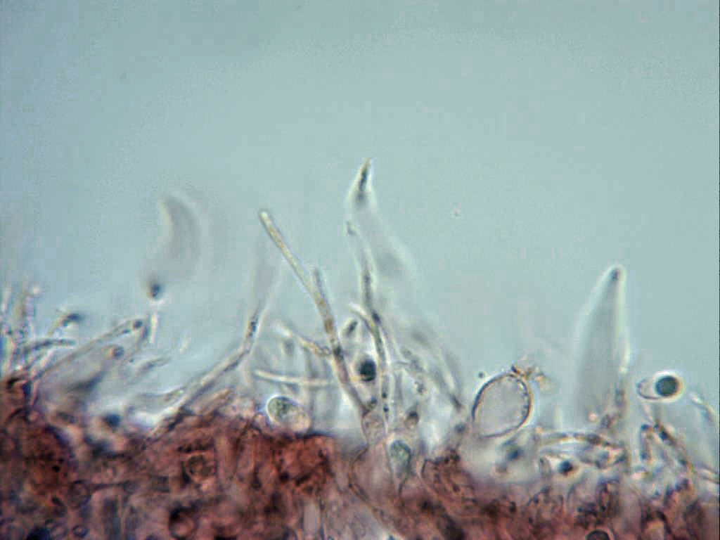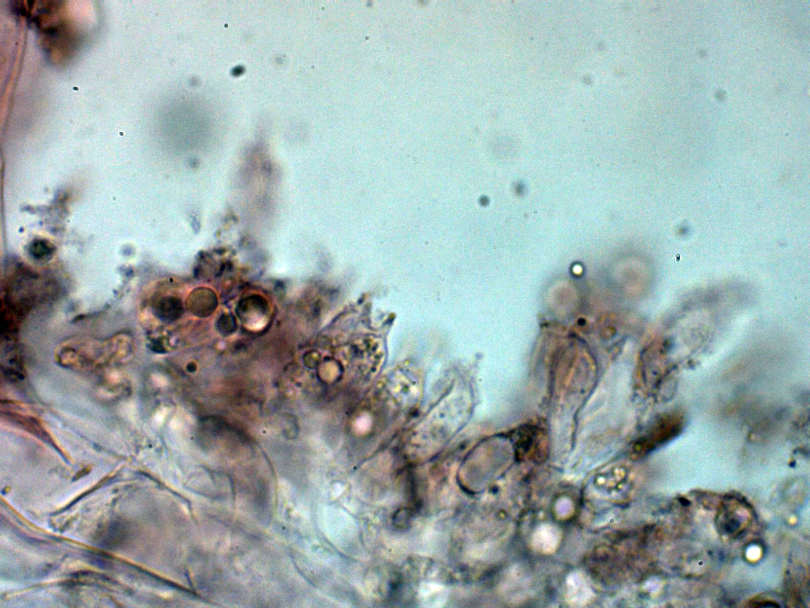 Queilocistidios en un par de estudios muy abundantes, en el otro más bien discretos, esta característica sería bastante variable dentro de la especie, pero en todos los casos con un largo cuello sinuoso y filiforme, con una base entre elipsoide y fusiforme muy ensanchada.