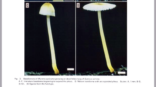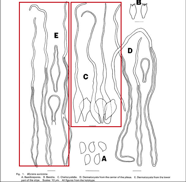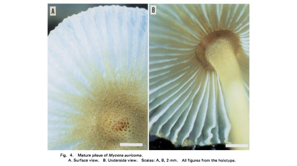 Buscando información sobre la Mycena auricoma, me encuentro con el documento de Mycoscience 40: 73-80, 1999, con el título de "Mycena auricoma, a new species of Mycena section Radiatae from Japan, and Mycena spinosissima, a new record in Japan" de Haruki Takahashi, con bastantes elementos concordantes con la Mycena = Leucoinocybe del presente estudio, dejo unas imágenes del mismo documento.