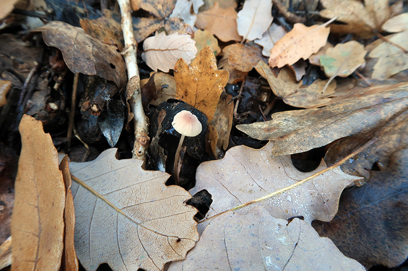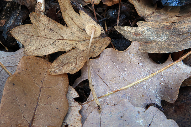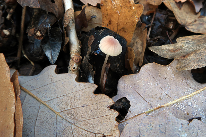 Una Mycena aparentemente brotando del suelo, del pasado día 1 de Enero, en soto fluvial en una zona donde predominaban los robles y las encinas.