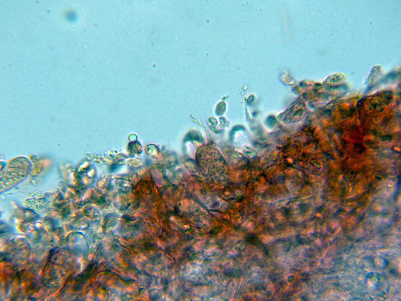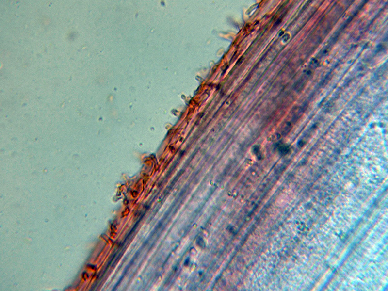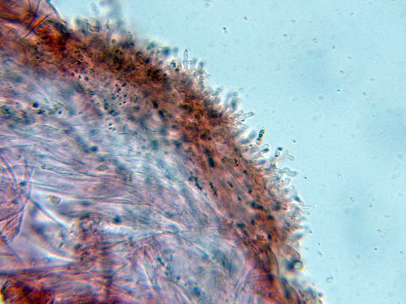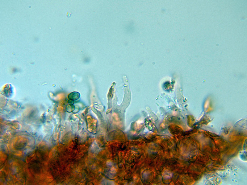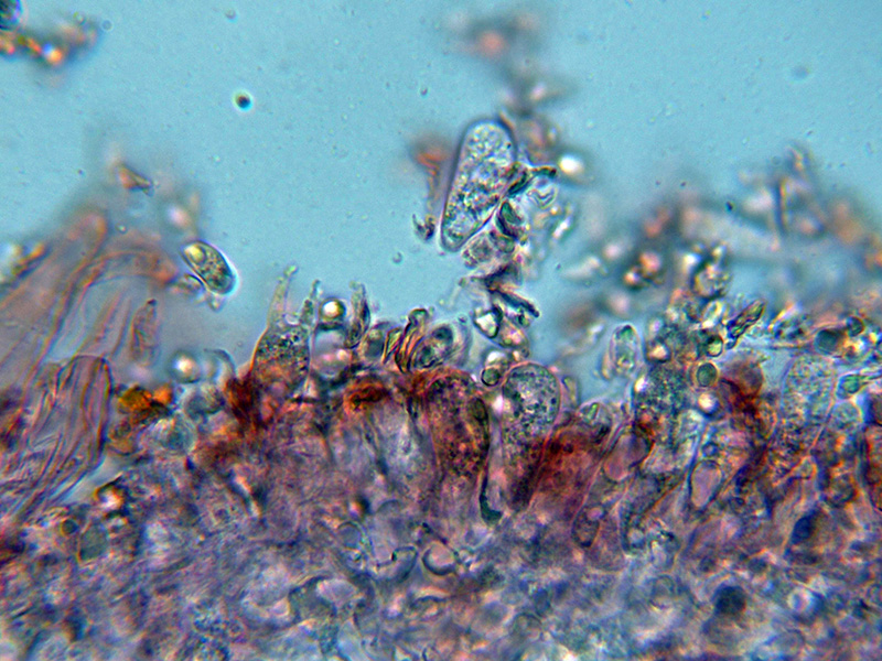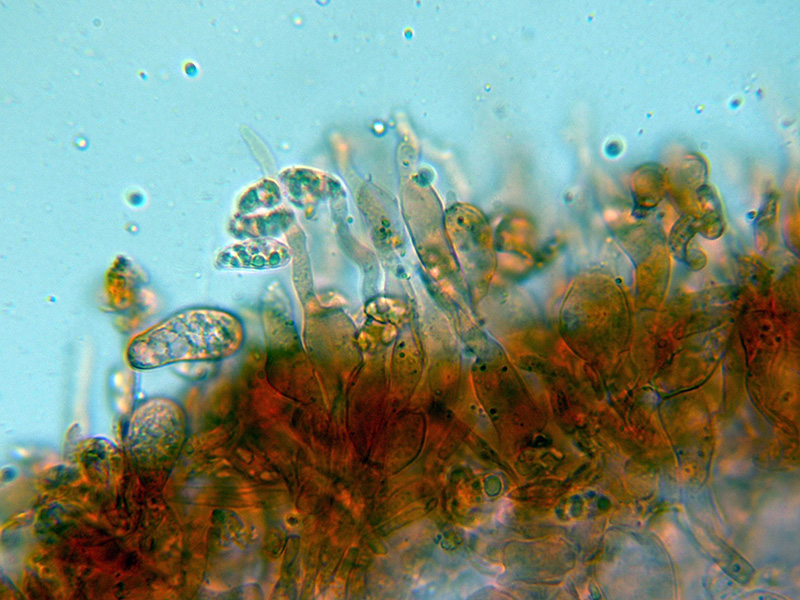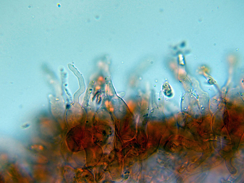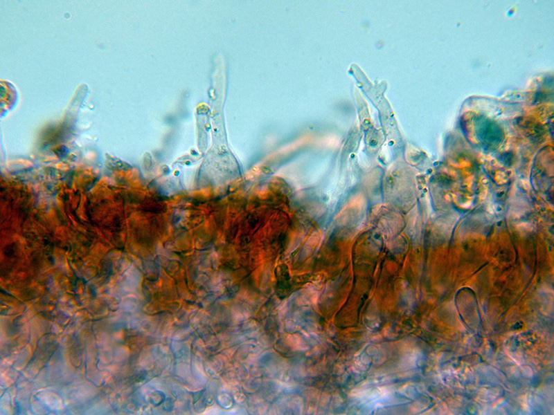 Queilocistidios muy abundantes con una base ancha y un largo cuello sinuoso, con pigmento en su interior. alguno de estos queilocistidios ramificado