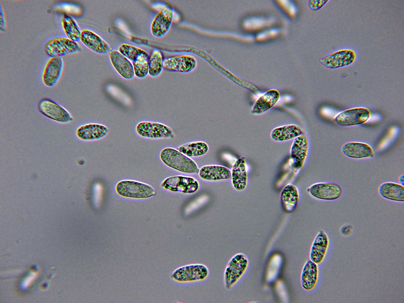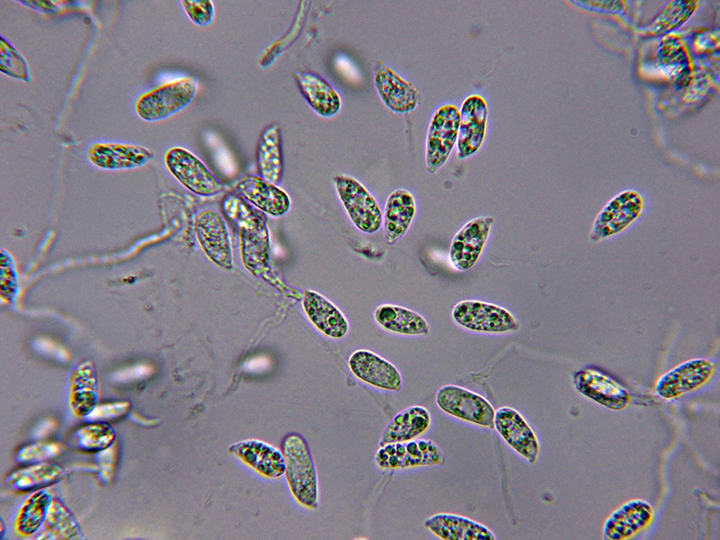 Esporas muy alargadas, en forma de pepita, de pared fina, con contenido granuloso en su interior y unas medidas en agua de: