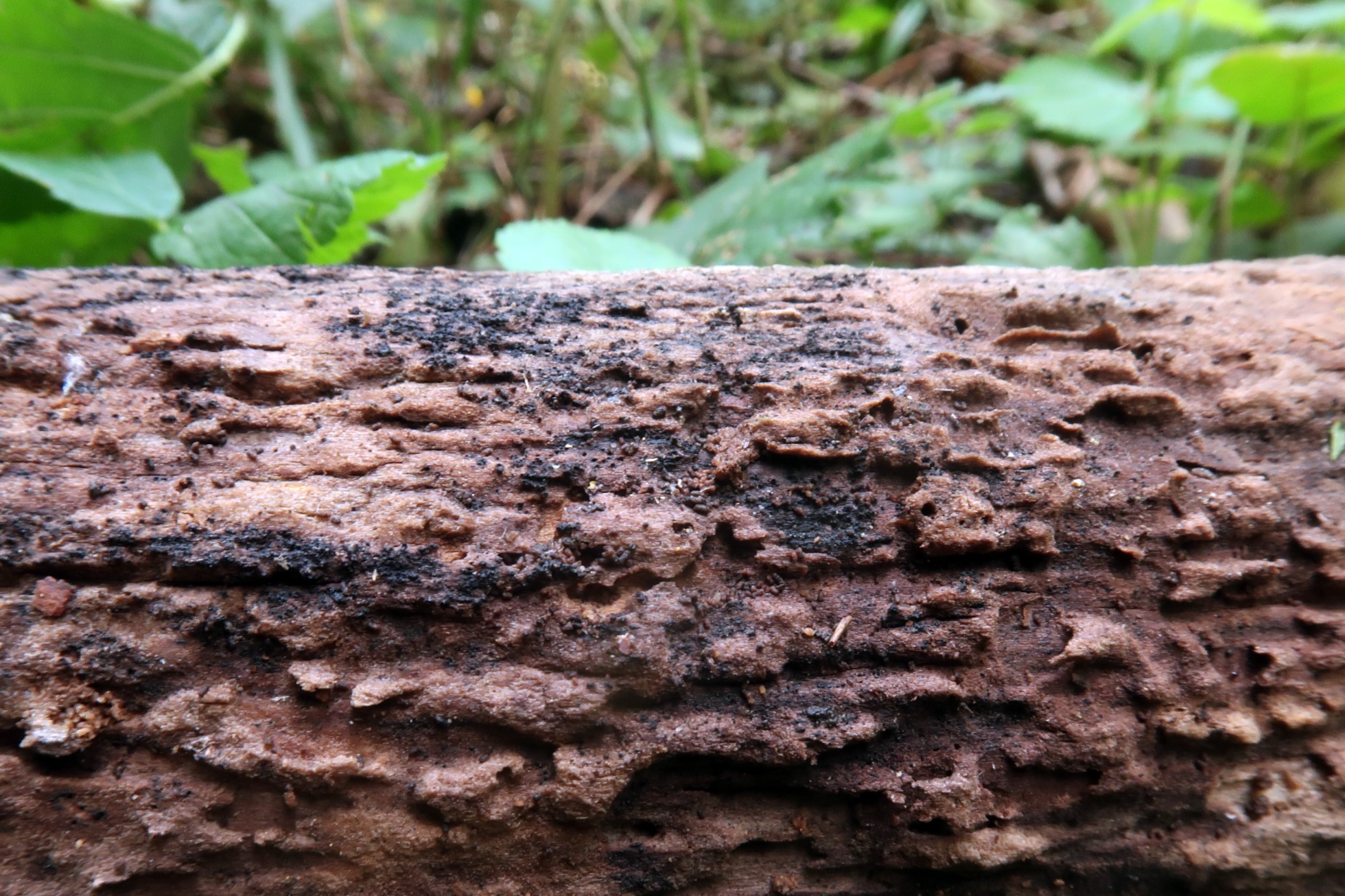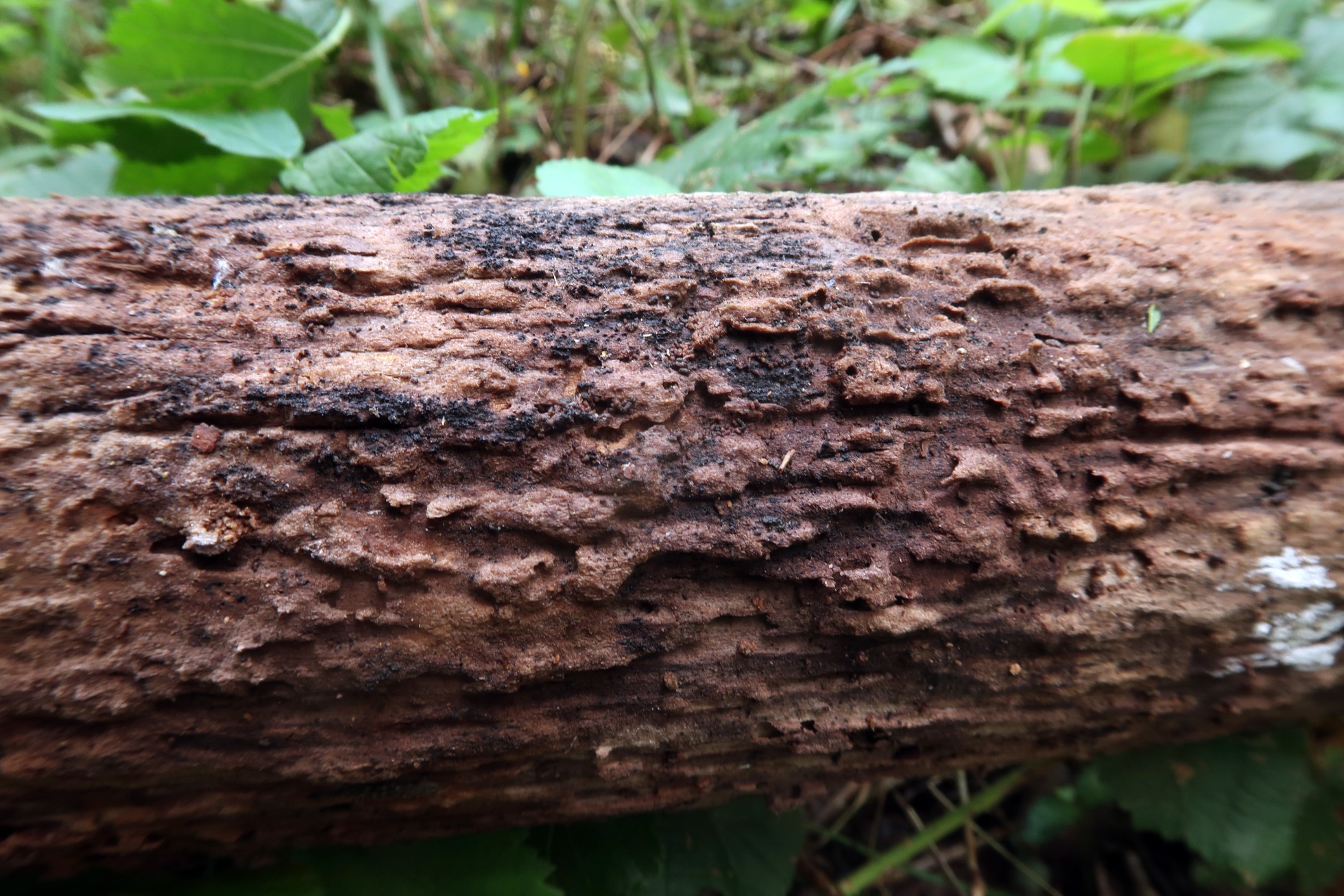 A destacar como característica los tonos púrpura violáceos que adquiere la madera en la zona afectada por el hongo.