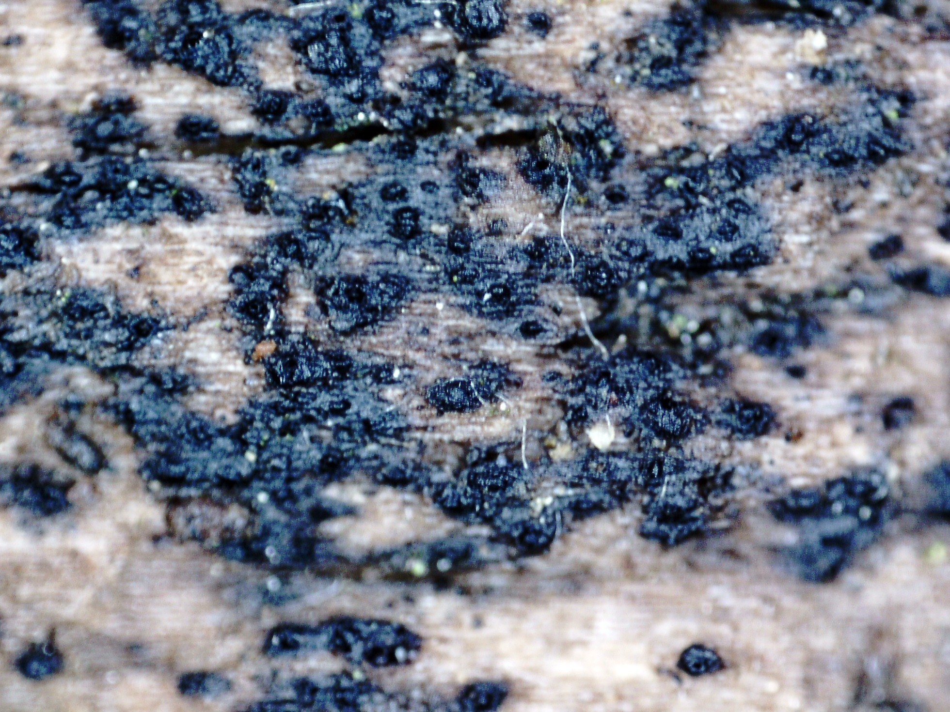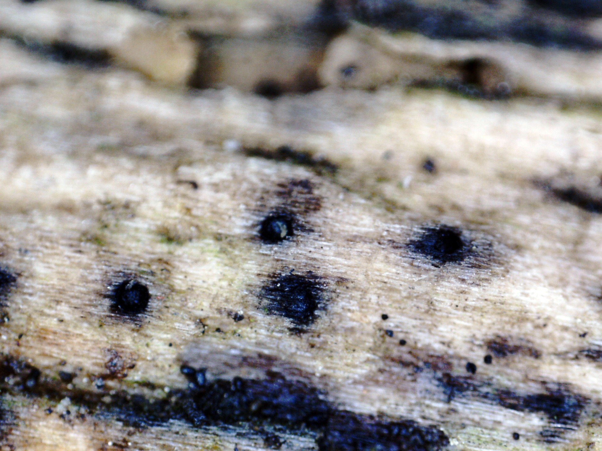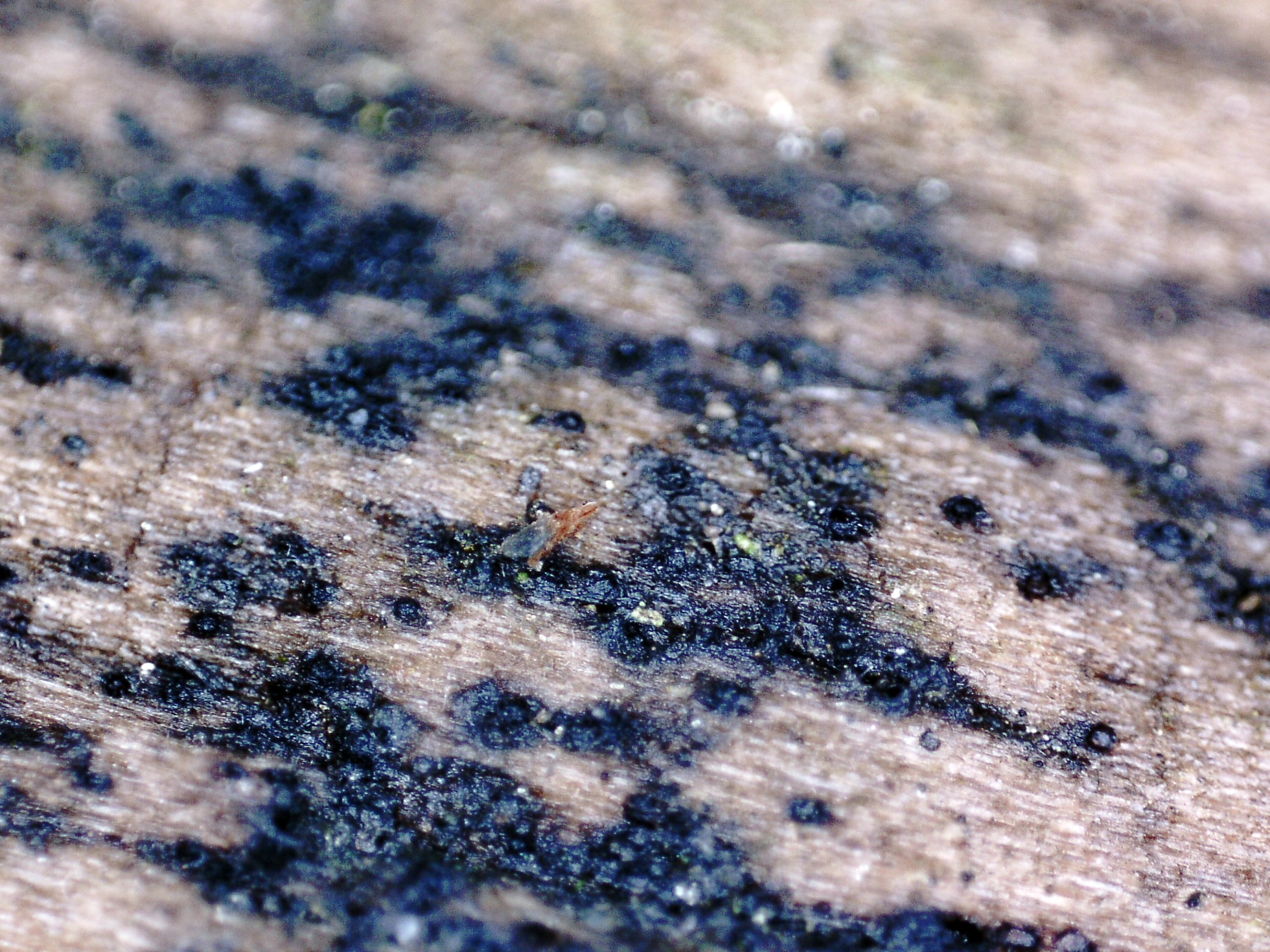 Pequeños apotecios de menos de 0,5 mm, brotando de manera dispersa, con forma de granos de color negro.