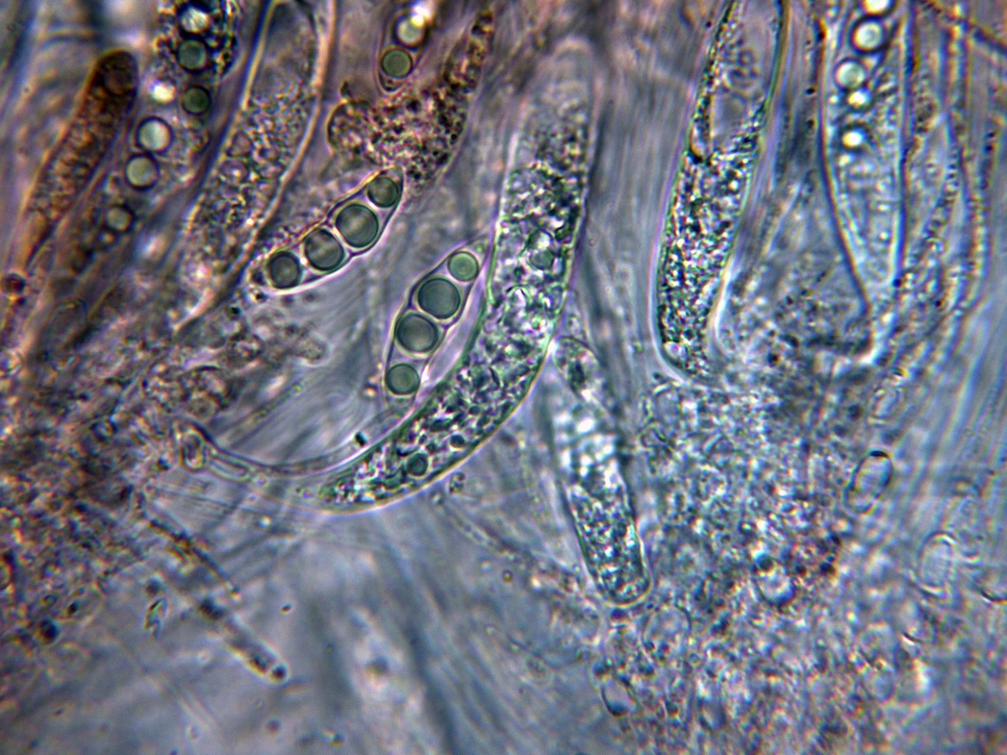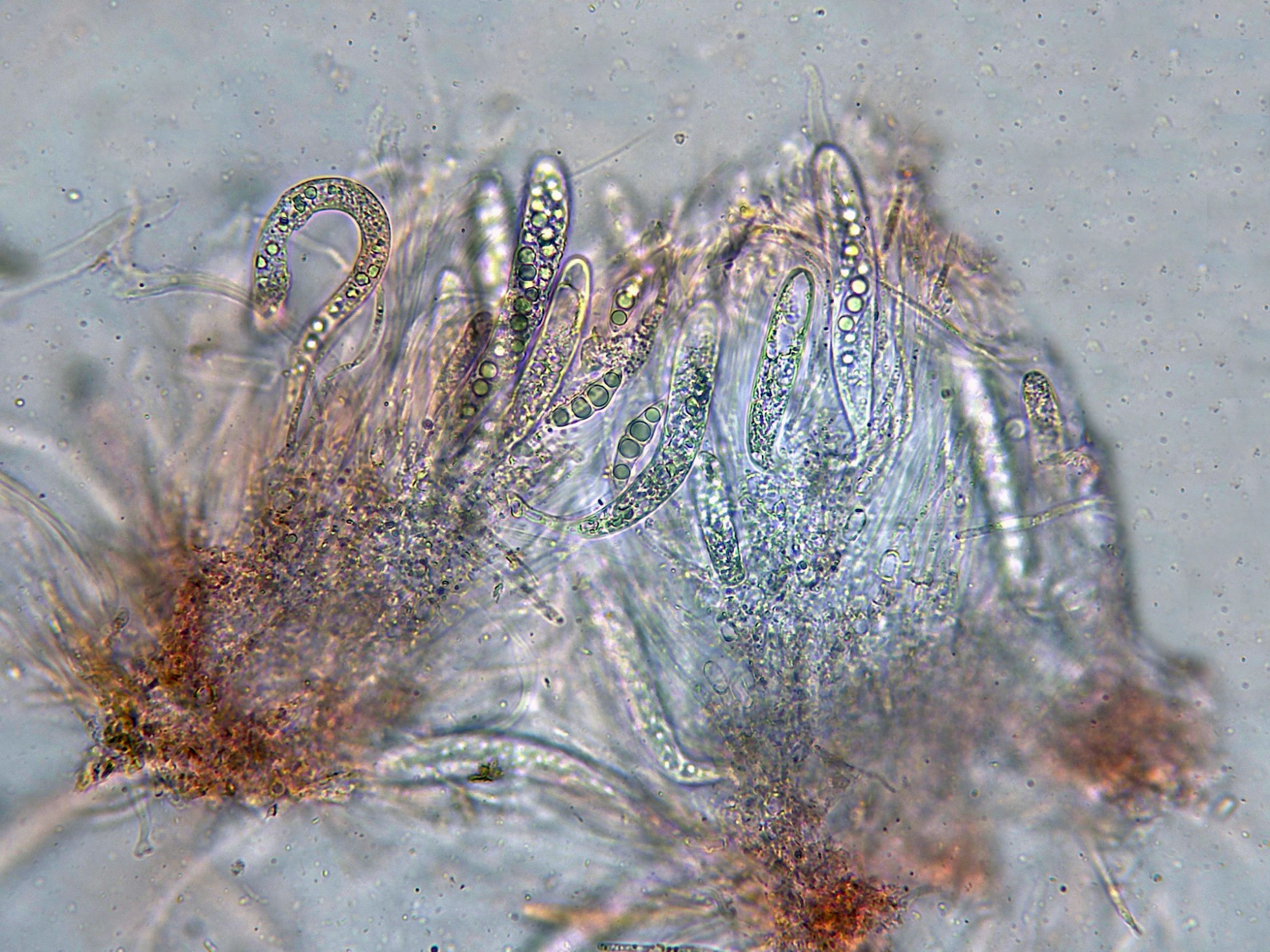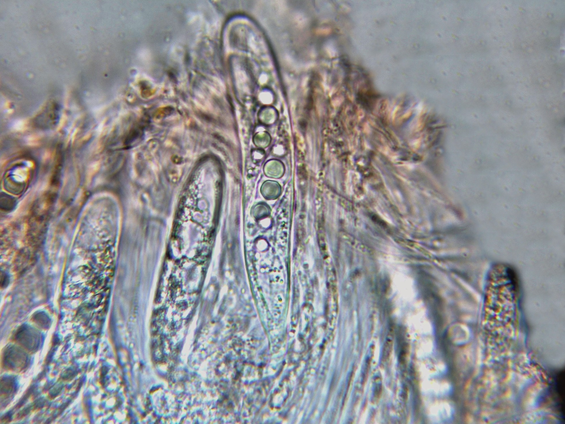 Himenio con los ascos y pseudoparáfisis a 400 aumentos.