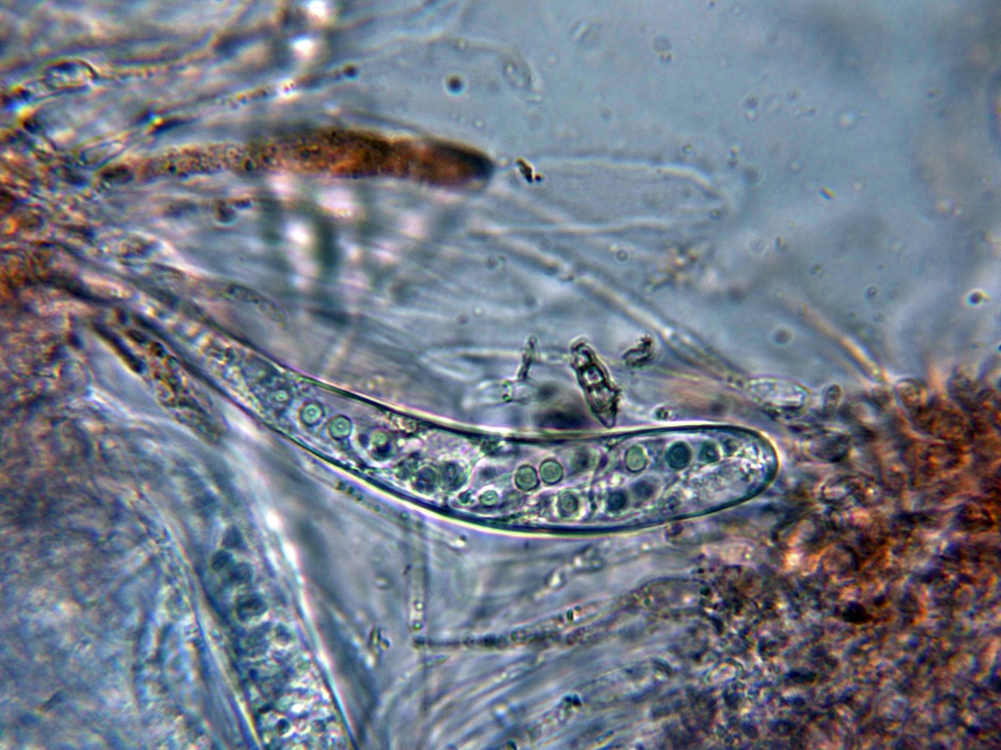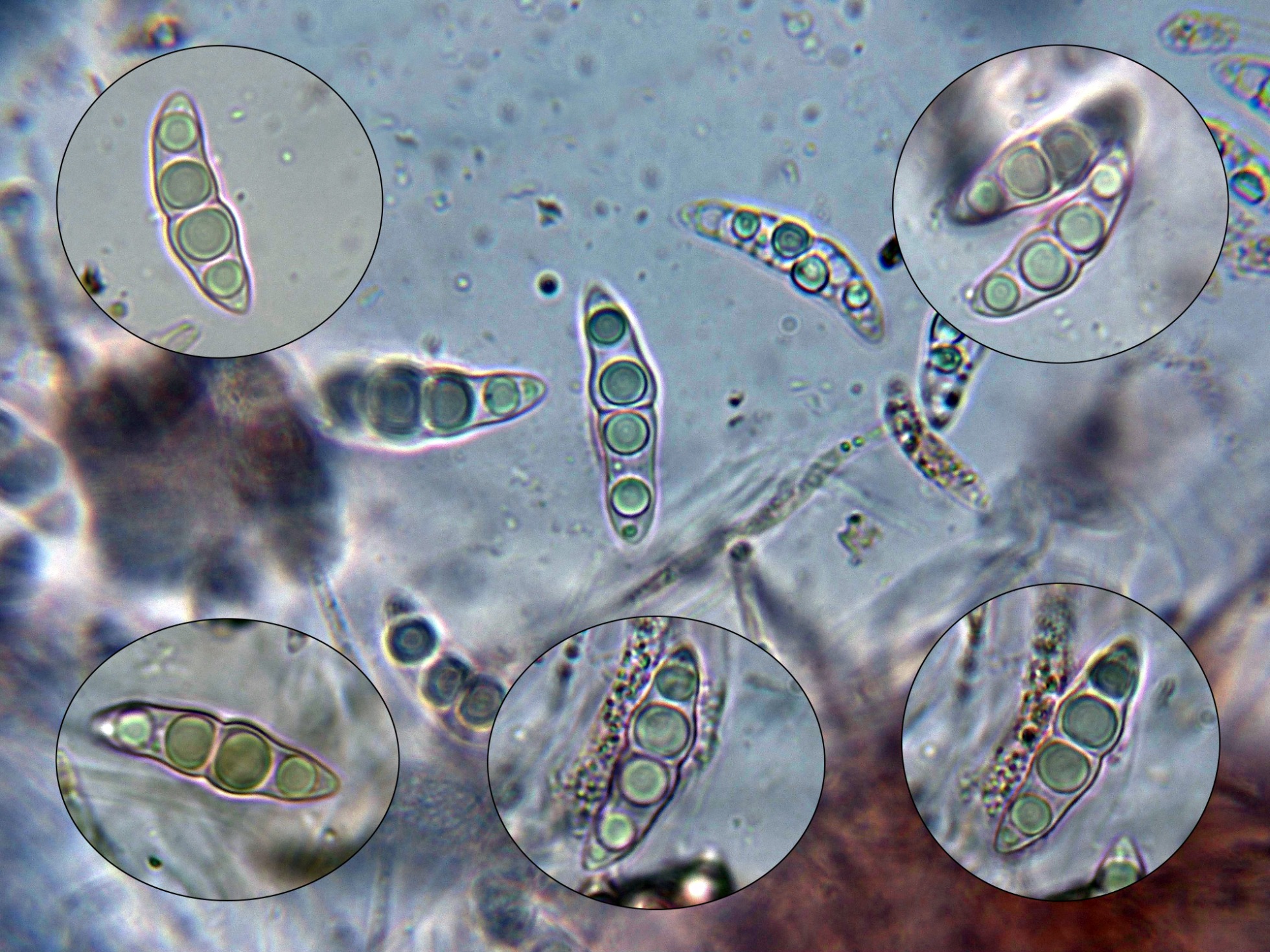 Ascosporas oblicuamente uniseriadas, parcialmente superpuestas en el asco, fusiformes, redondeadas en los extremos y con un muy marcado constreñimiento central, asimétricas con la celda de un extremo más corta.