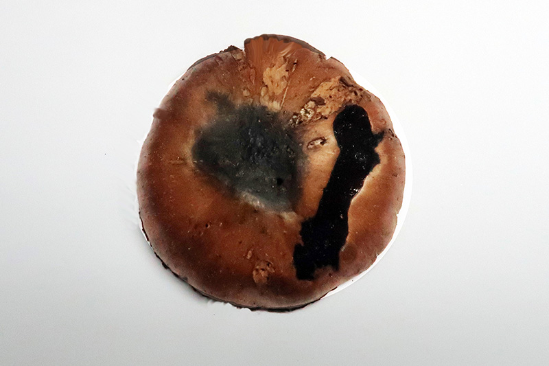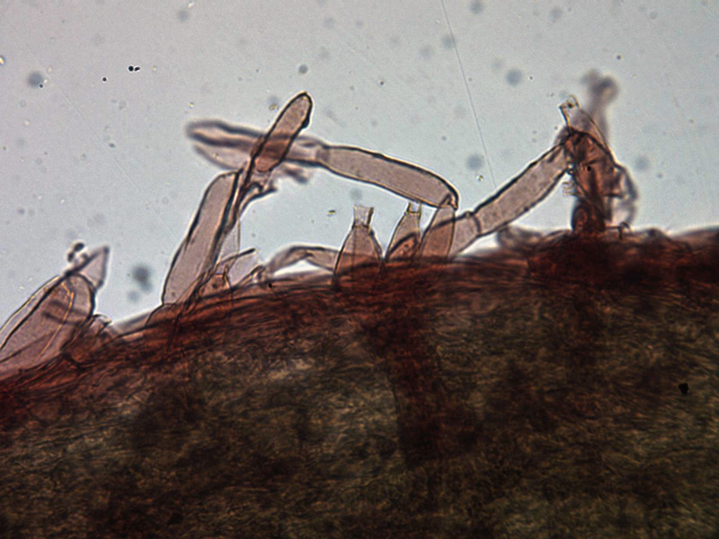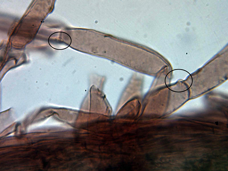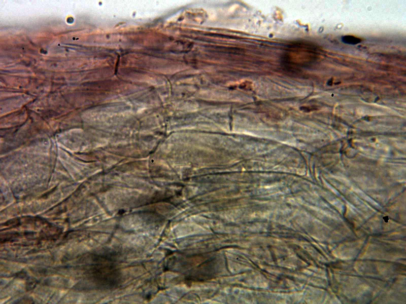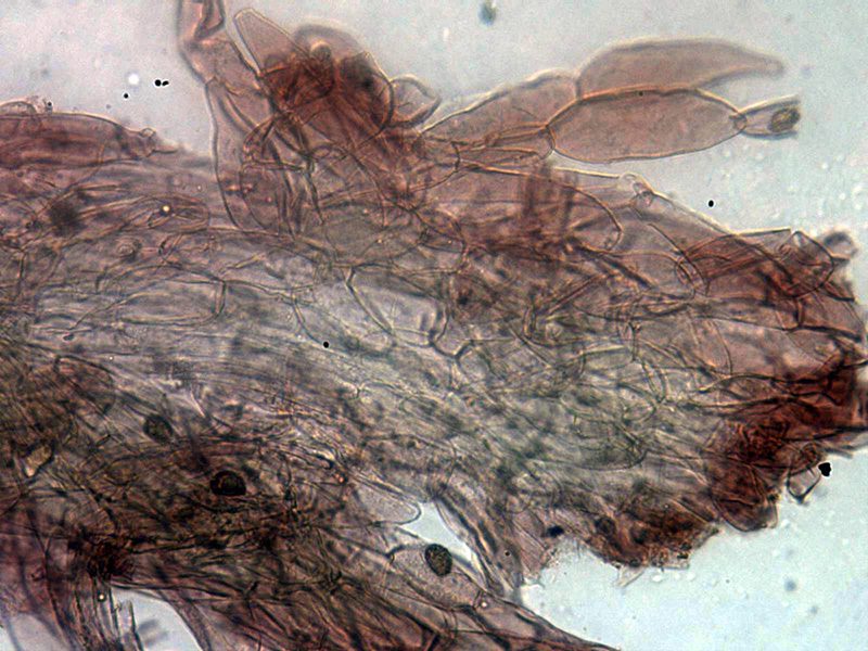 Pileipellis compuesta por hifas anchas poco pigmentadas, con septos cortos con una anchura de entre 16,8 a 26,9 µm. al parecer sin fíbulas, en la parte más superior de la misma se observan unas hifas mas alargadas de entre 9,5 a 11 µm. con unas muy diminutas fíbulas.