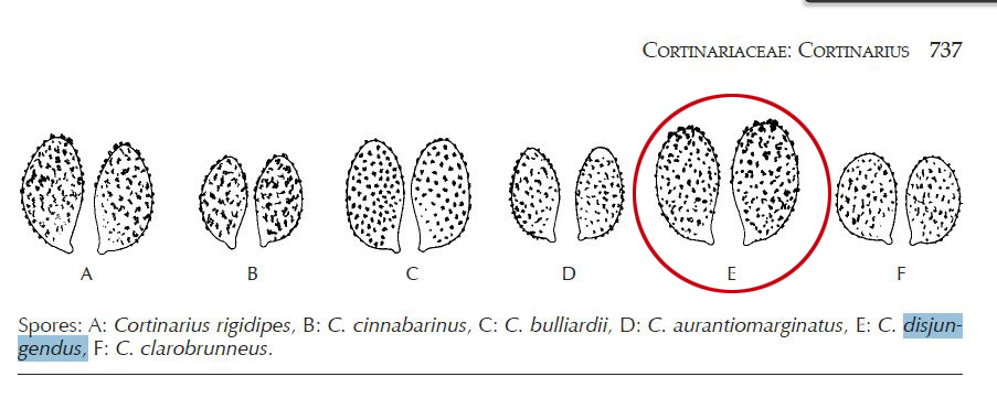 Observaciones: Aunque dentro de los Telamonias por sus características parecía coincidir perfectamente con la descripción de Funga Nordica, y además dentro de los de su Sección el Cortinarius disjungendus sería el que presentaría el mayor tamaño esporal, aun así las medidas esporales de mi estudio se encontrarían considerablemente por encima de las citadas en las Claves, las que otorgan al Cortinarius disjungendus unas medidas esporales de 9,5-10,5 x 6-6,5(-7) μm. (en mi caso de (9) 9.3 - 11.2 (11.9) × (6) 6.4 - 7.6 (8) µm.), dejo una imágen de la morfología esporal extraída de Funga Nordica.