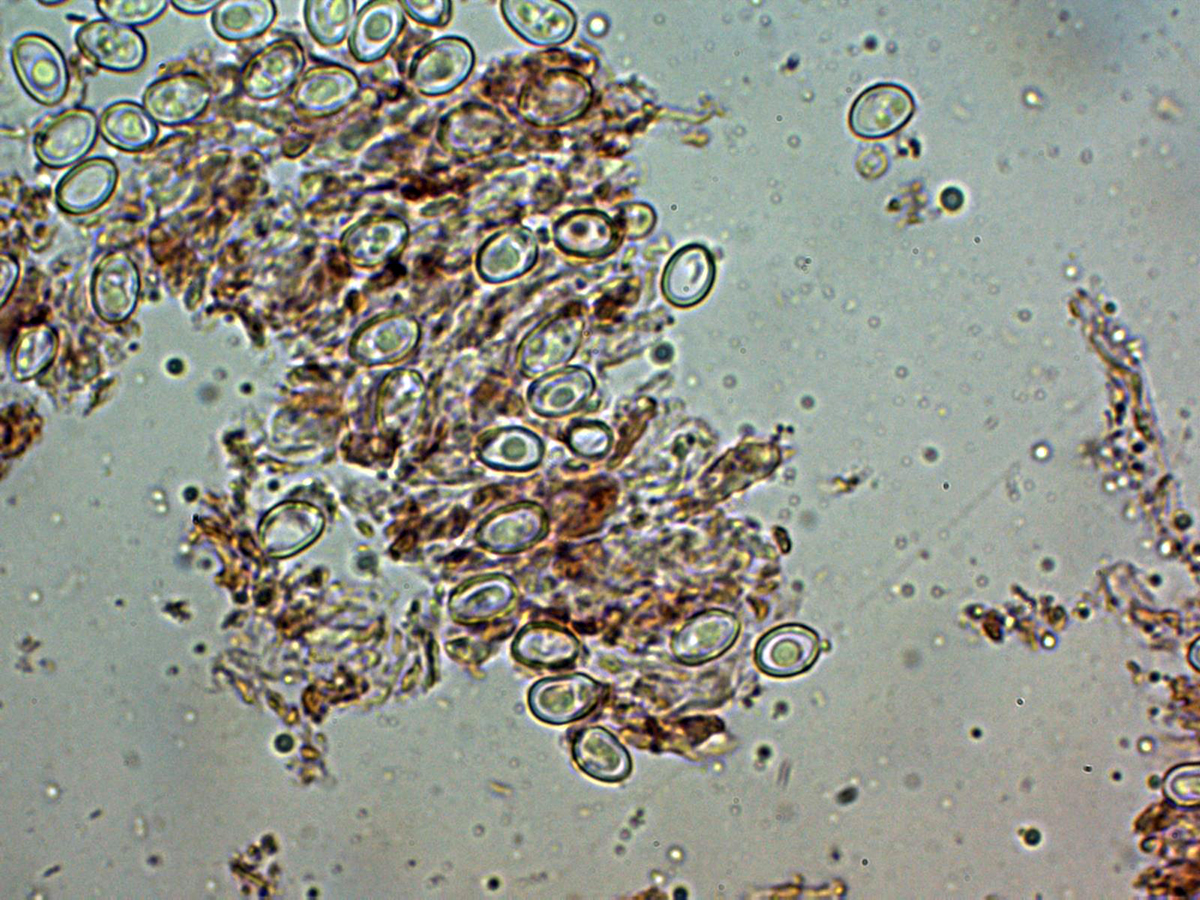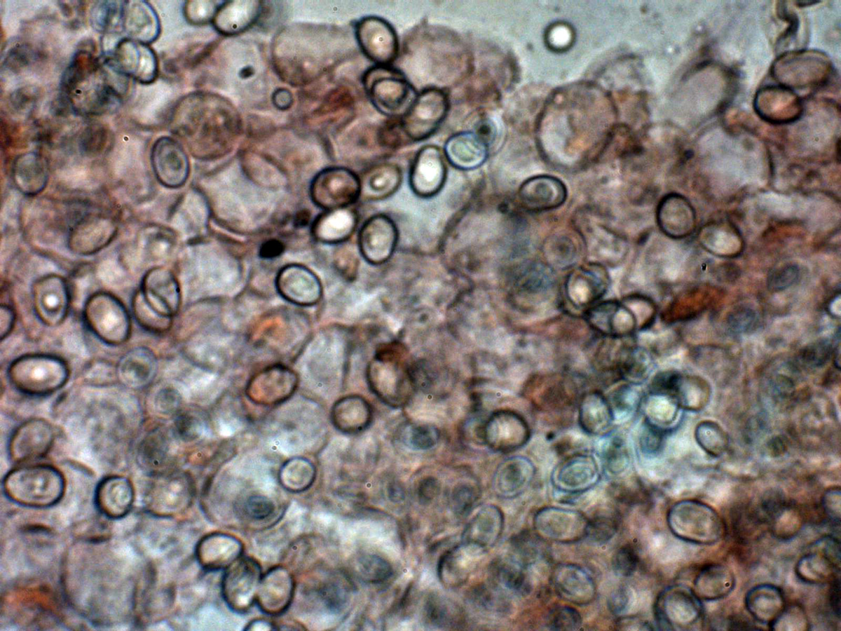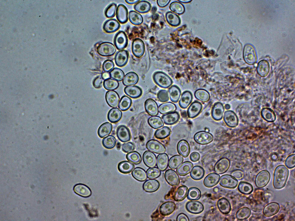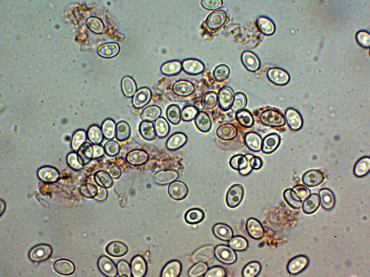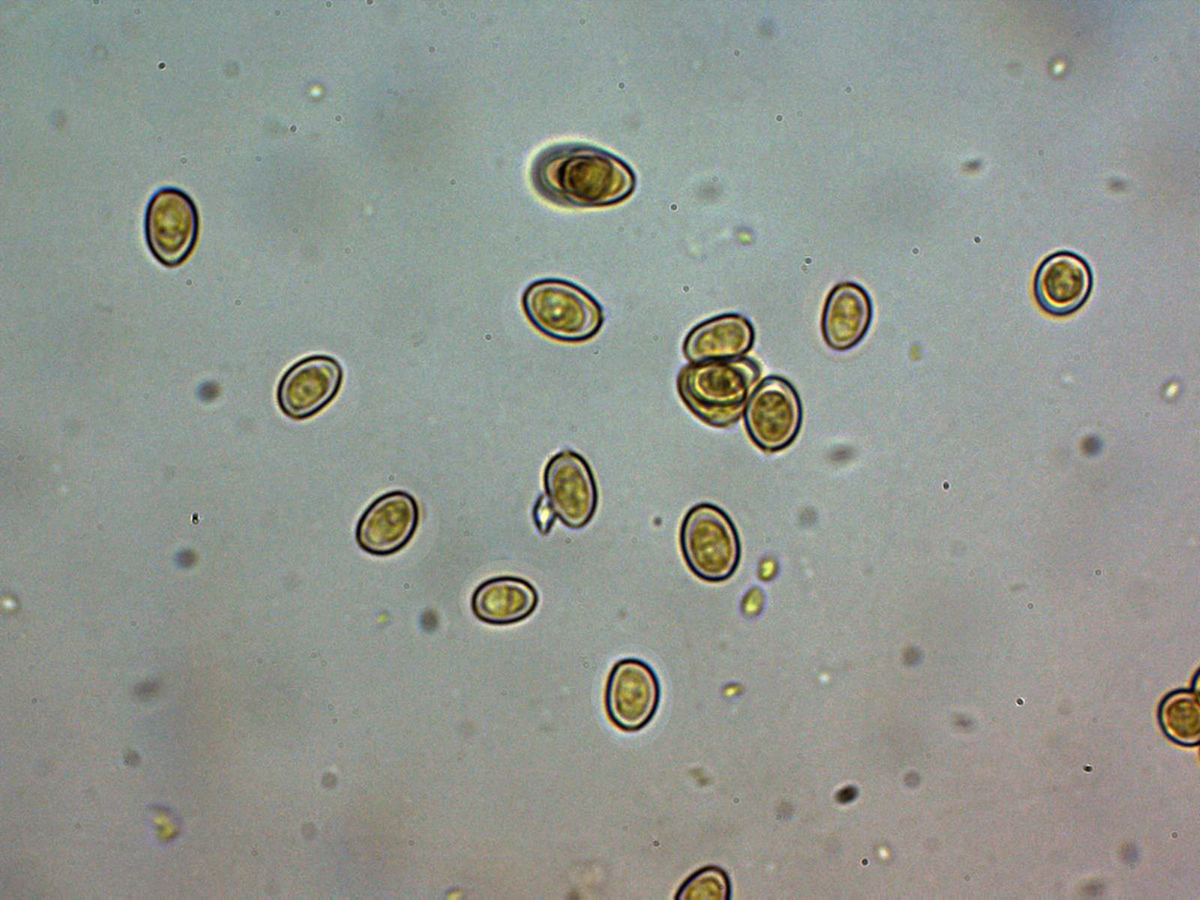 Las esporas entre ovoides y eslipsoidales cortas, de pared gruesa y con una o más gotas lípidas en su interior.