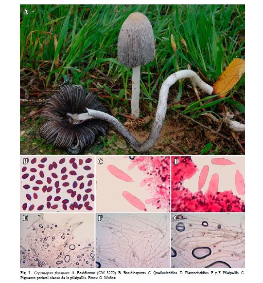 También parece encajar bien con la opinión del documento de Muñoz González, G. & A. Palazón Peman de 2019, con el título de "DIEZ ESPECIES RARAS O POCO CONOCIDAS DE AGARICALES RECOLECTADAS EN LA PENÍNSULA IBÉRICA", en el que se indican unas medidas esporales para la Coprinopsis fusispora de 9,4–10,5–11,6 × 5,4–6,1–6,8 μm, Q = 1,6–1,7–1,9.