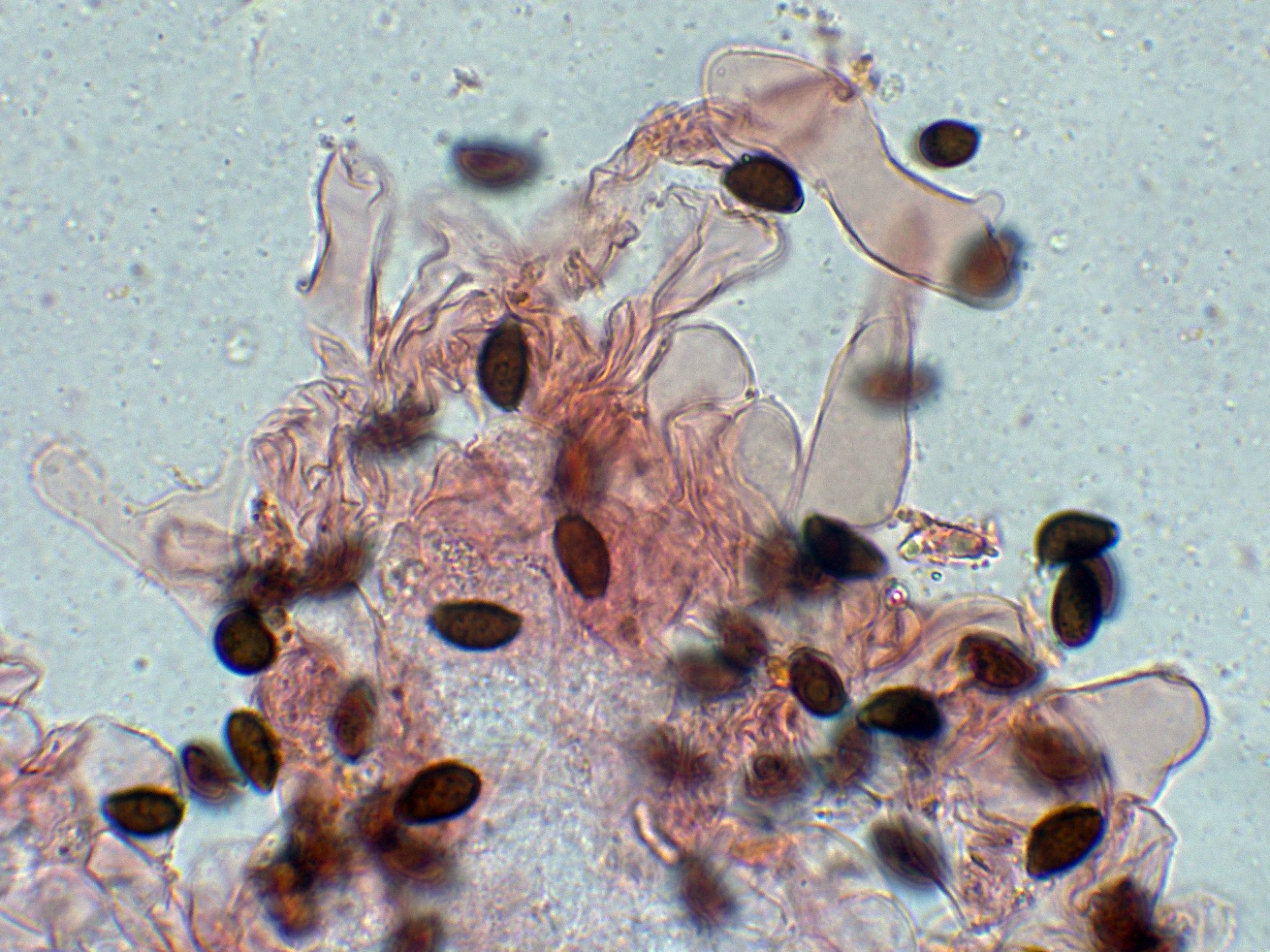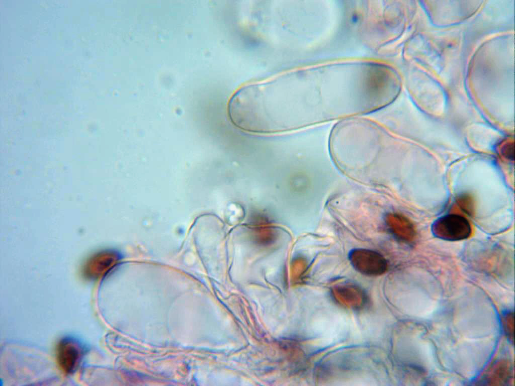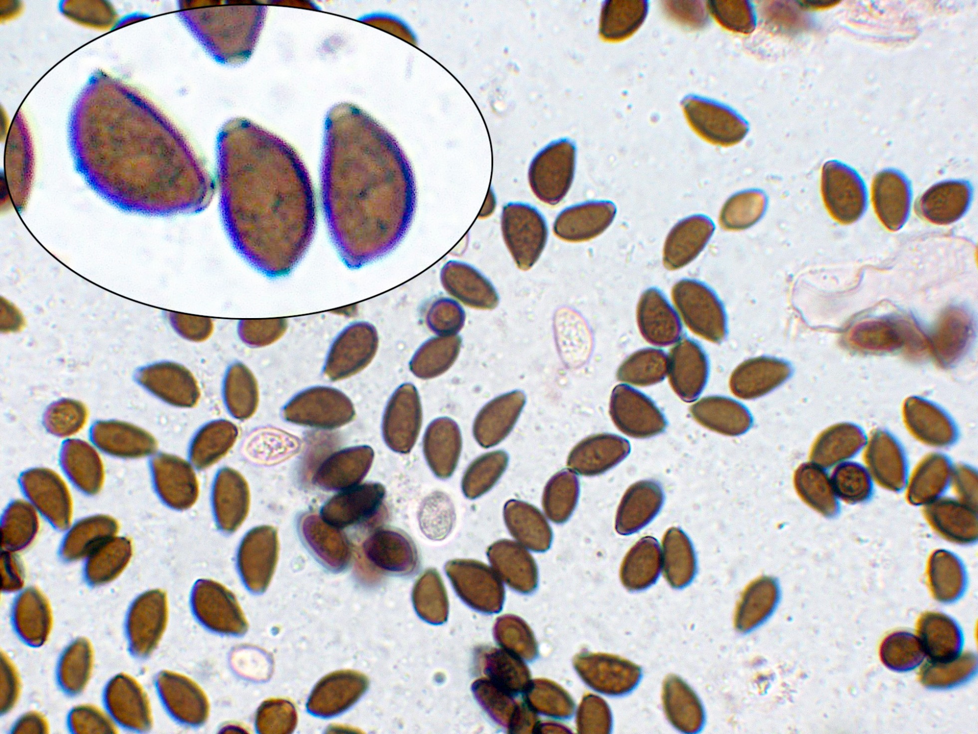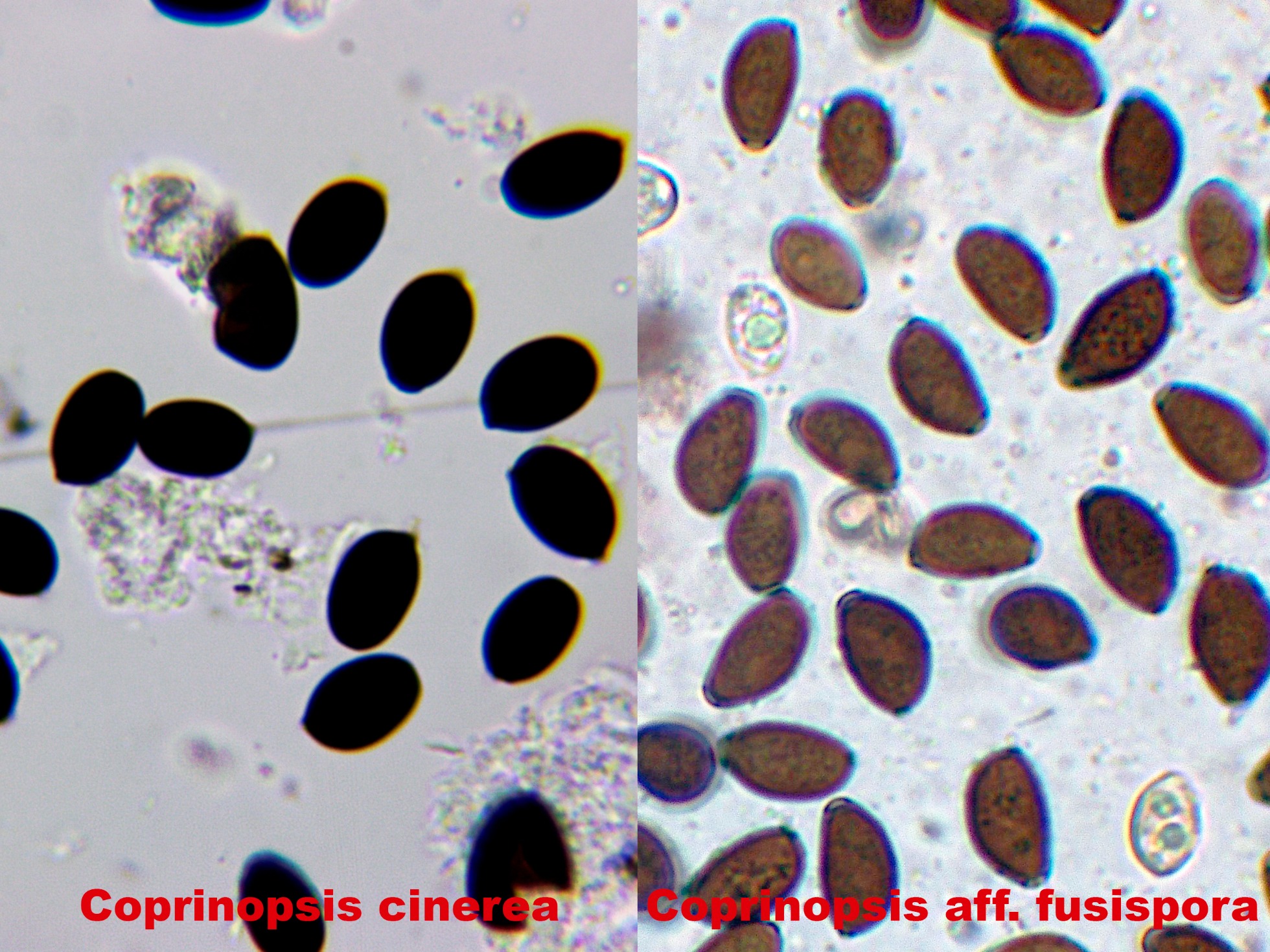 Añado una comparativa de sus esporas con las de la Coprinopsis cinerea, donde se observa bien su distinta morfología y pigmentación.
