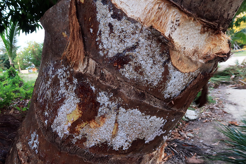 Una pruína blanquecina con aspecto de un Corticial resupinado, sobre la superficie del tronco de una palmera viva.