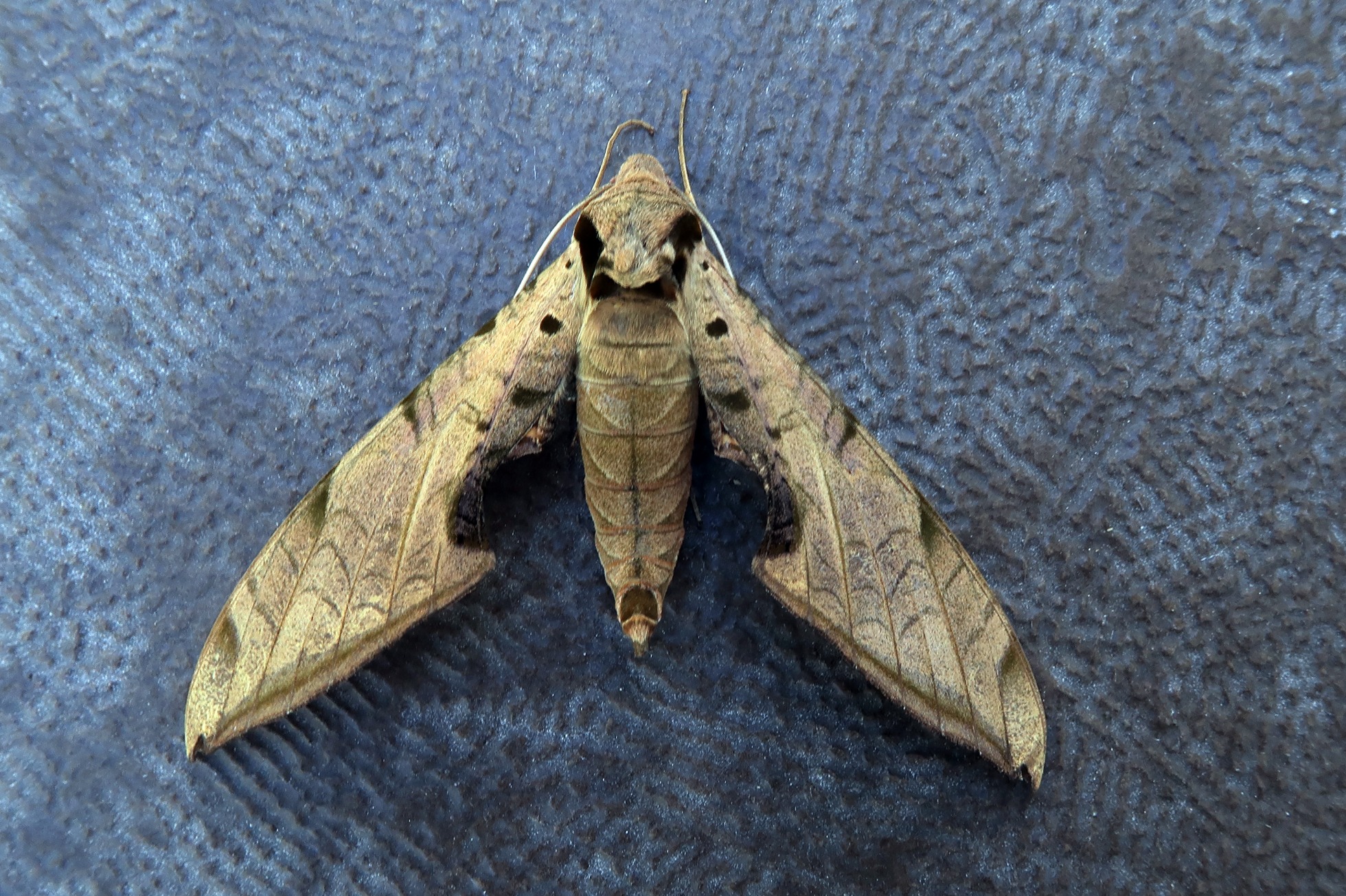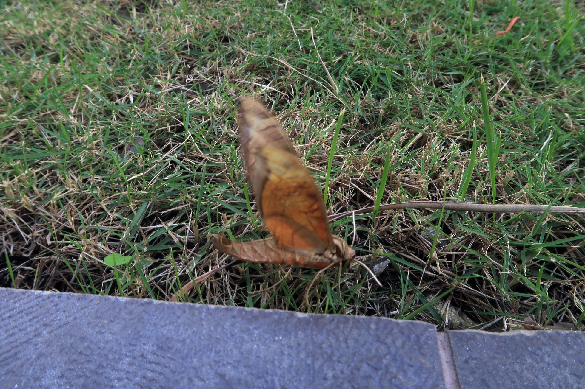 Y ya puestos en el reino animal, una polilla gigante (unos 10 cm.) fotografiada ayer mismo, que representa un buen ejemplo de mimetismo, en el suelo parecía una hoja seca.