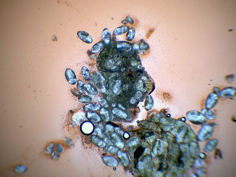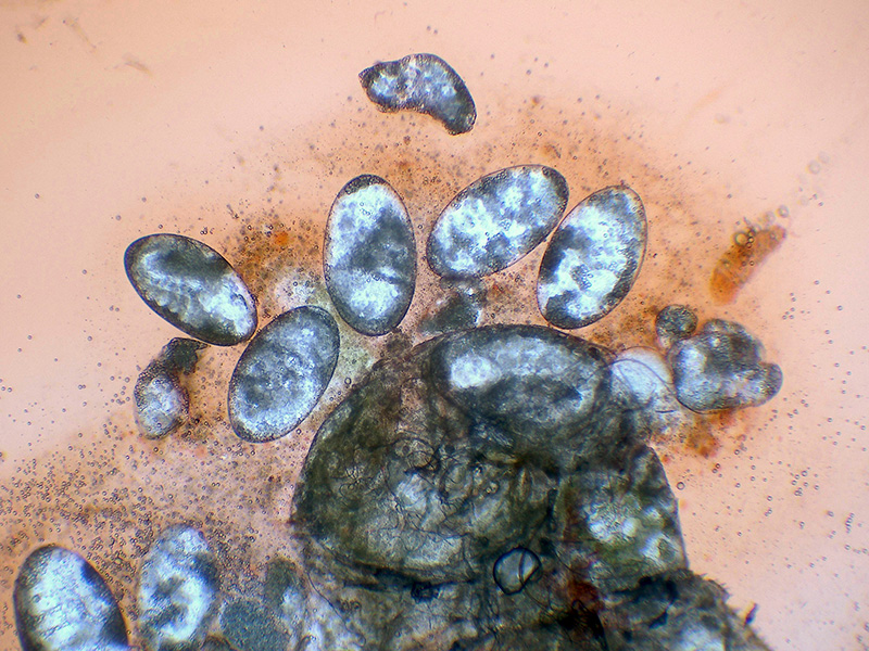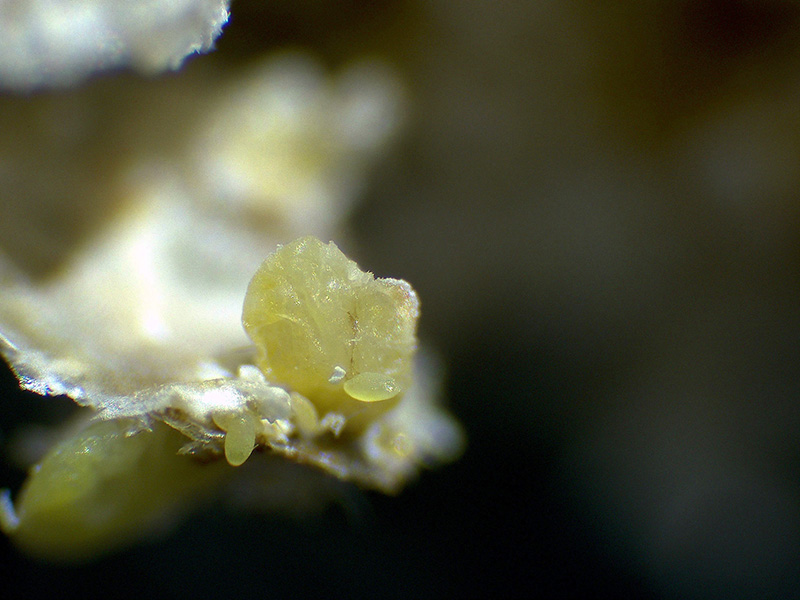 En su superficie unas estructuras irregulares amarillentas de una masa mucilaginosa que albergaba en su interior los huevos.