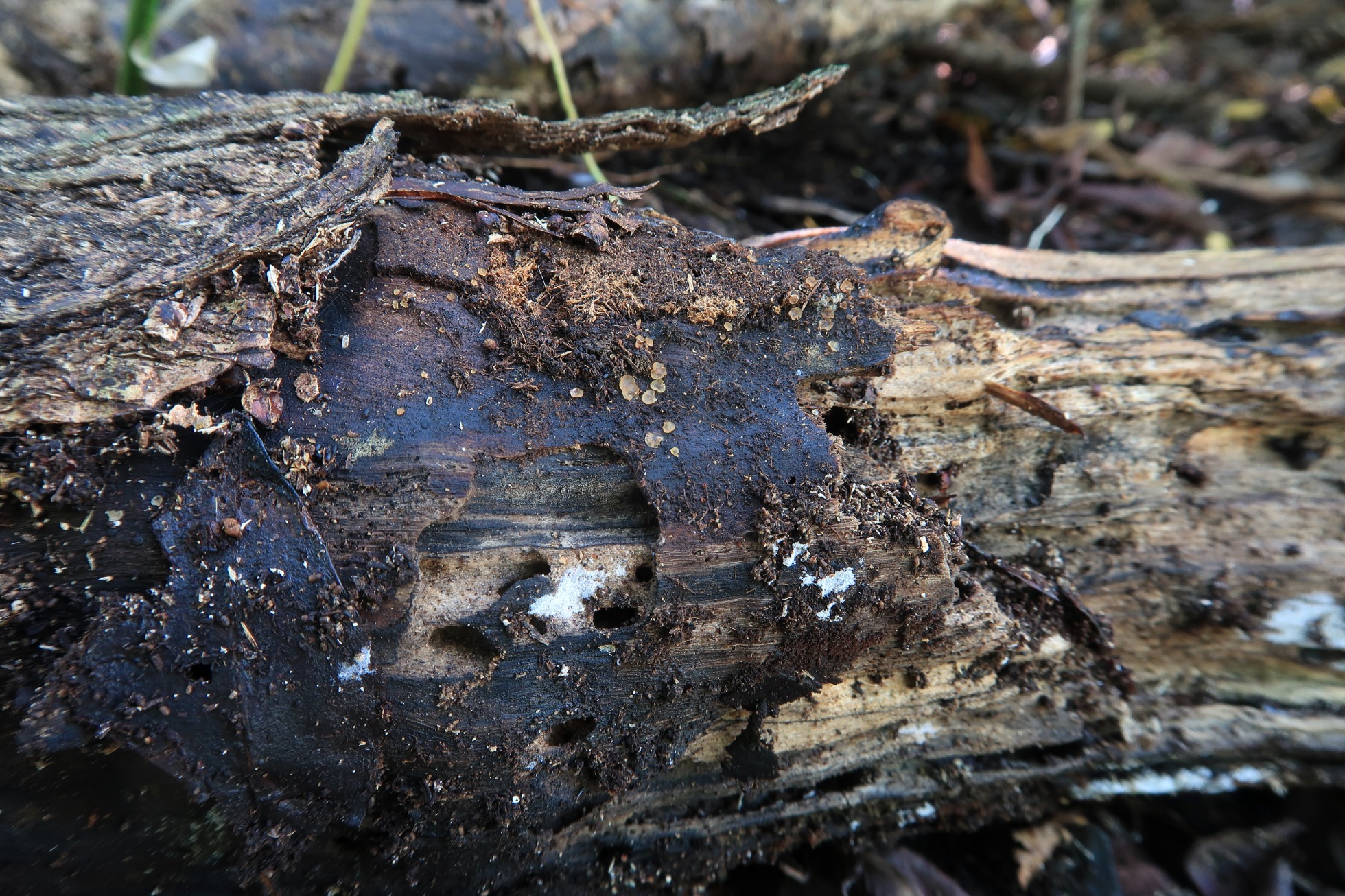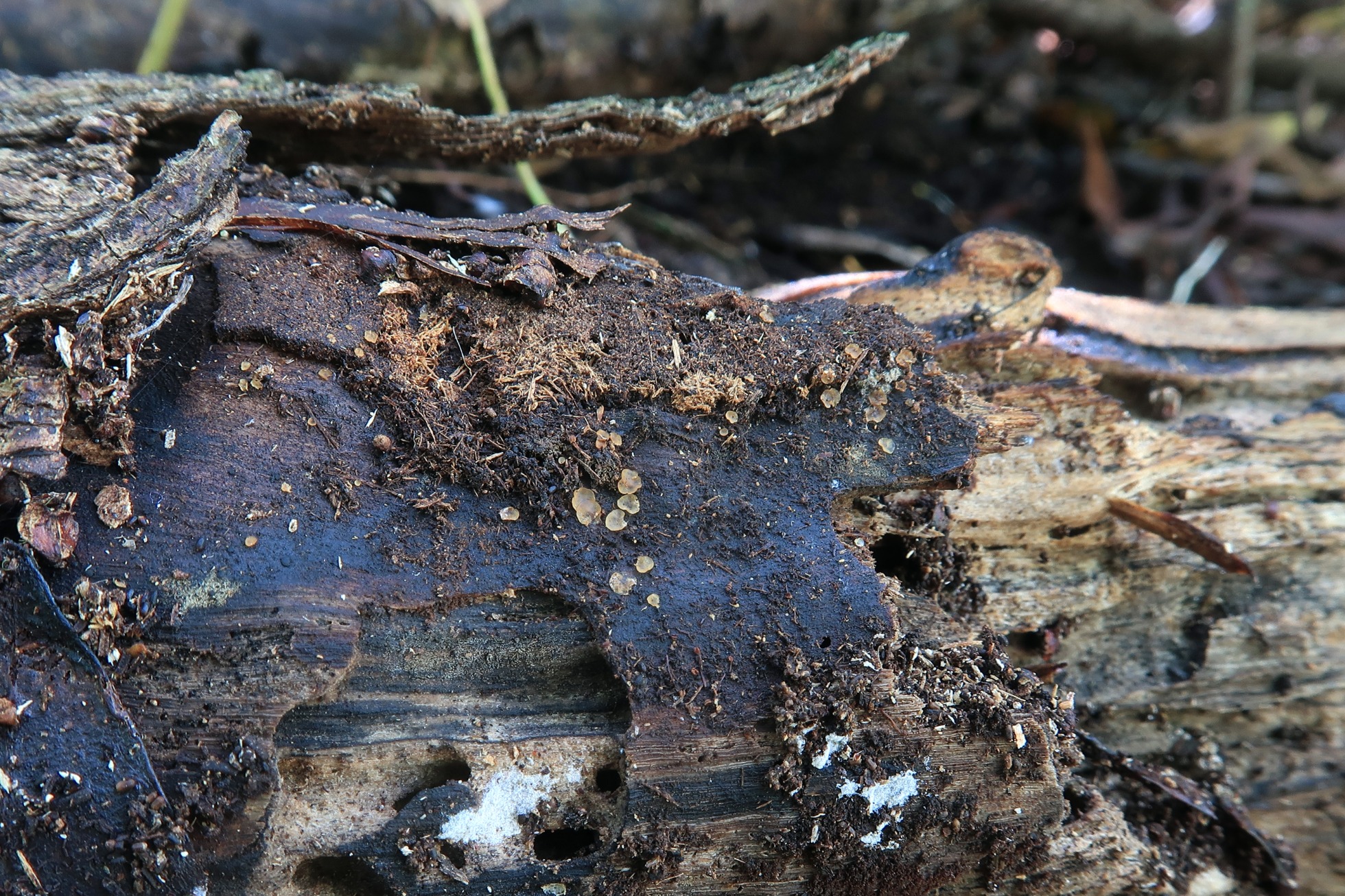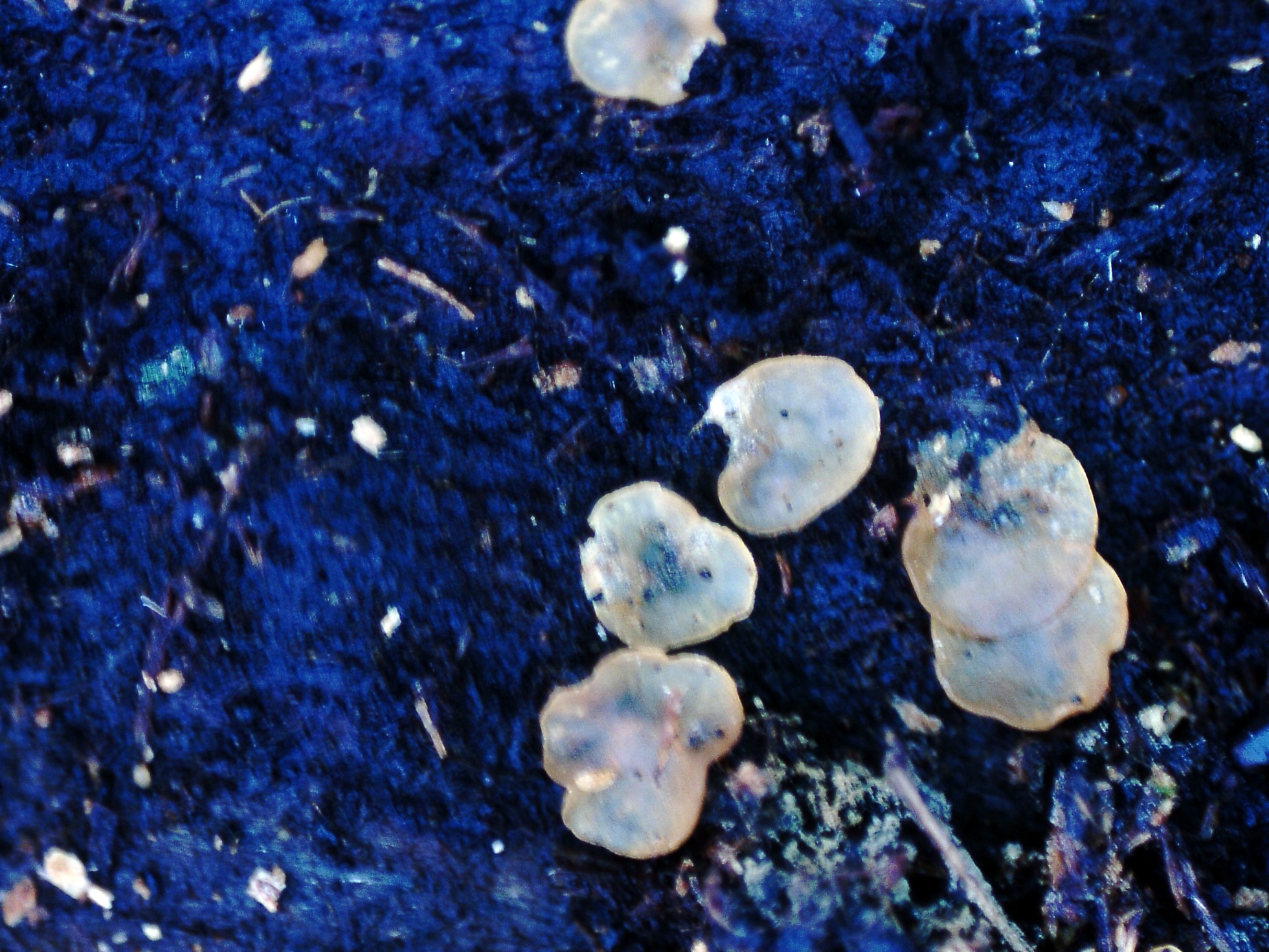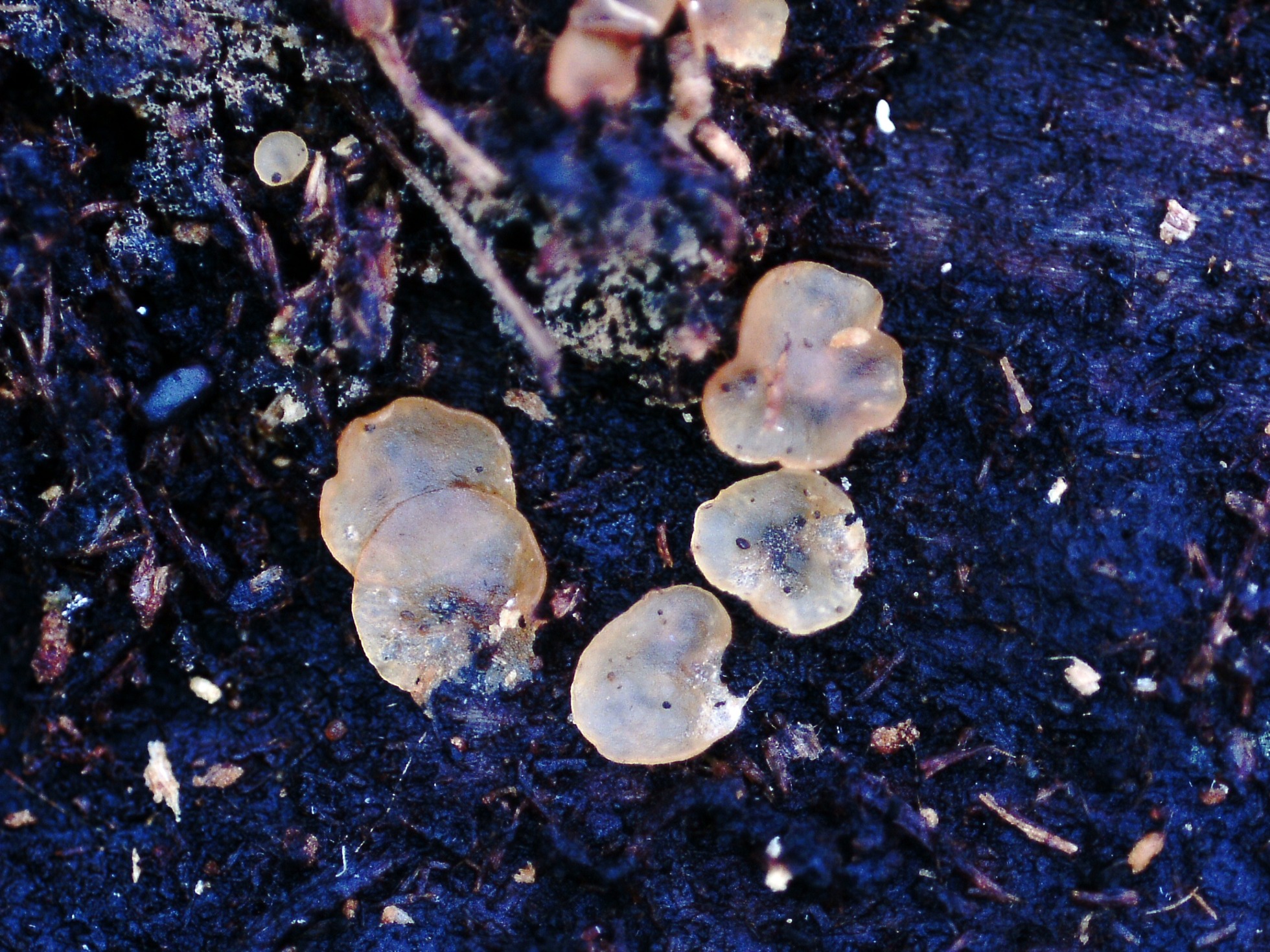 Diminutos apotecios en forma de disco deformado, de pequeño grosor de entre 0,6 a 1,4 mm. de diámetro.