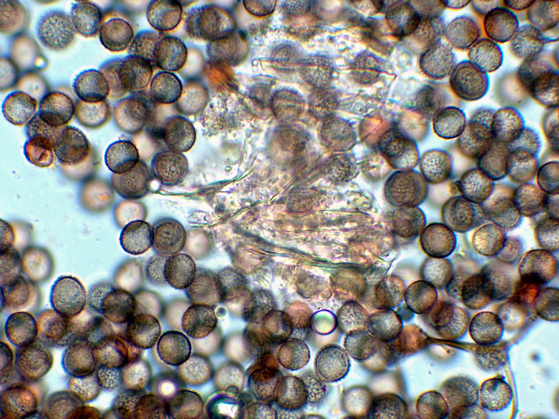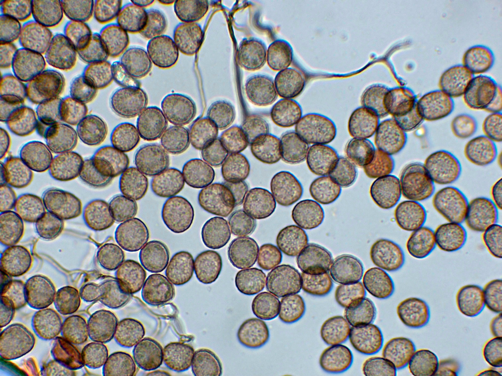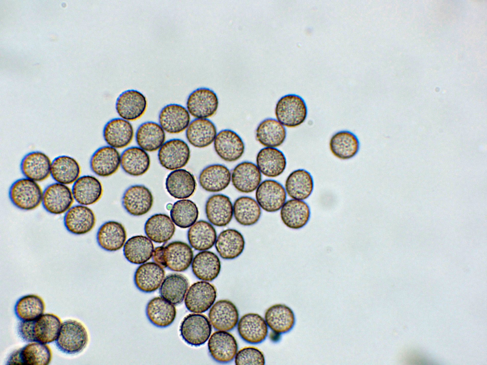 Esporas de color marrón violáceo al microscopio, verrucosas, pero que no llegan a formar un retículo, con unas medidas de: