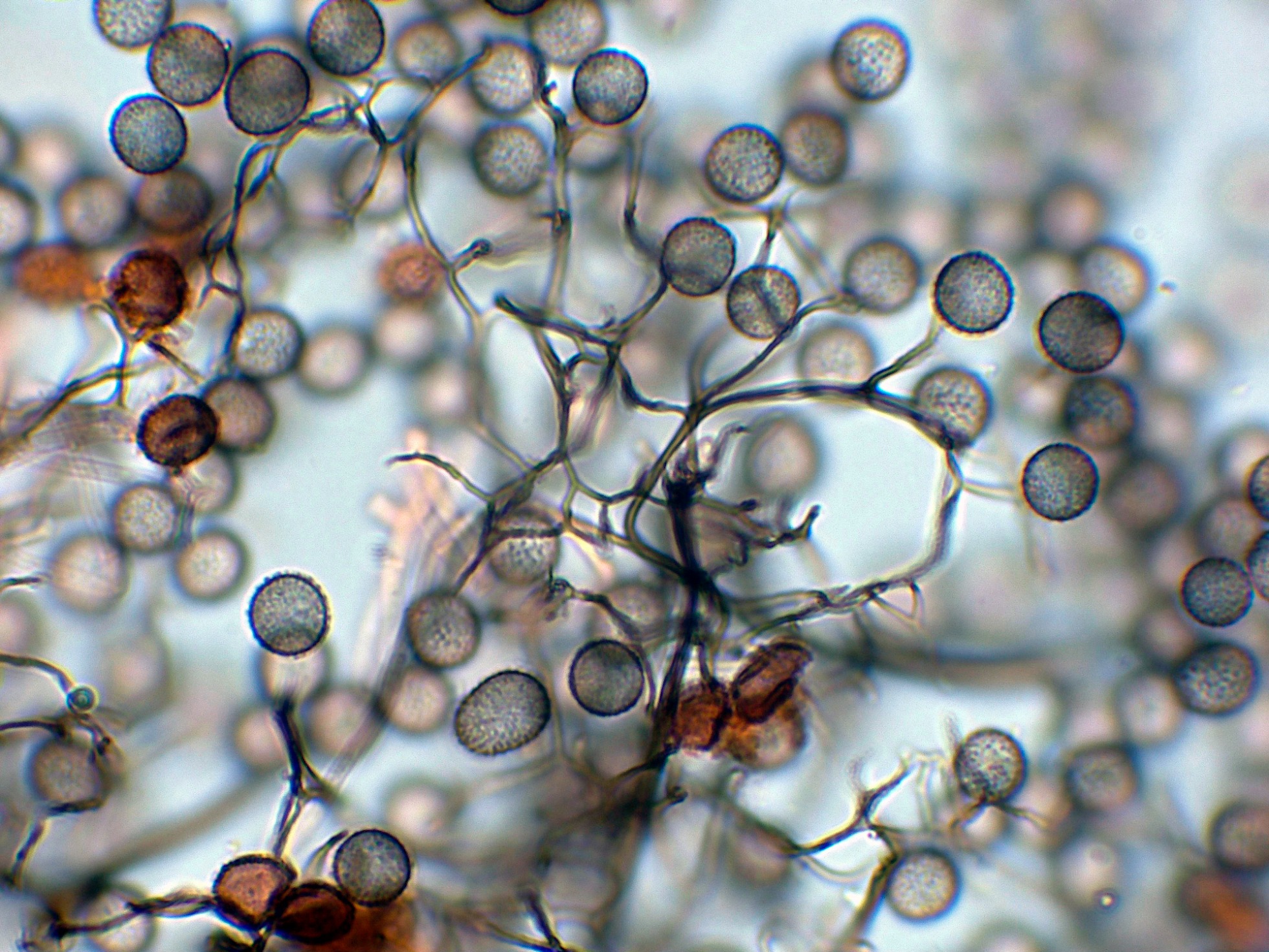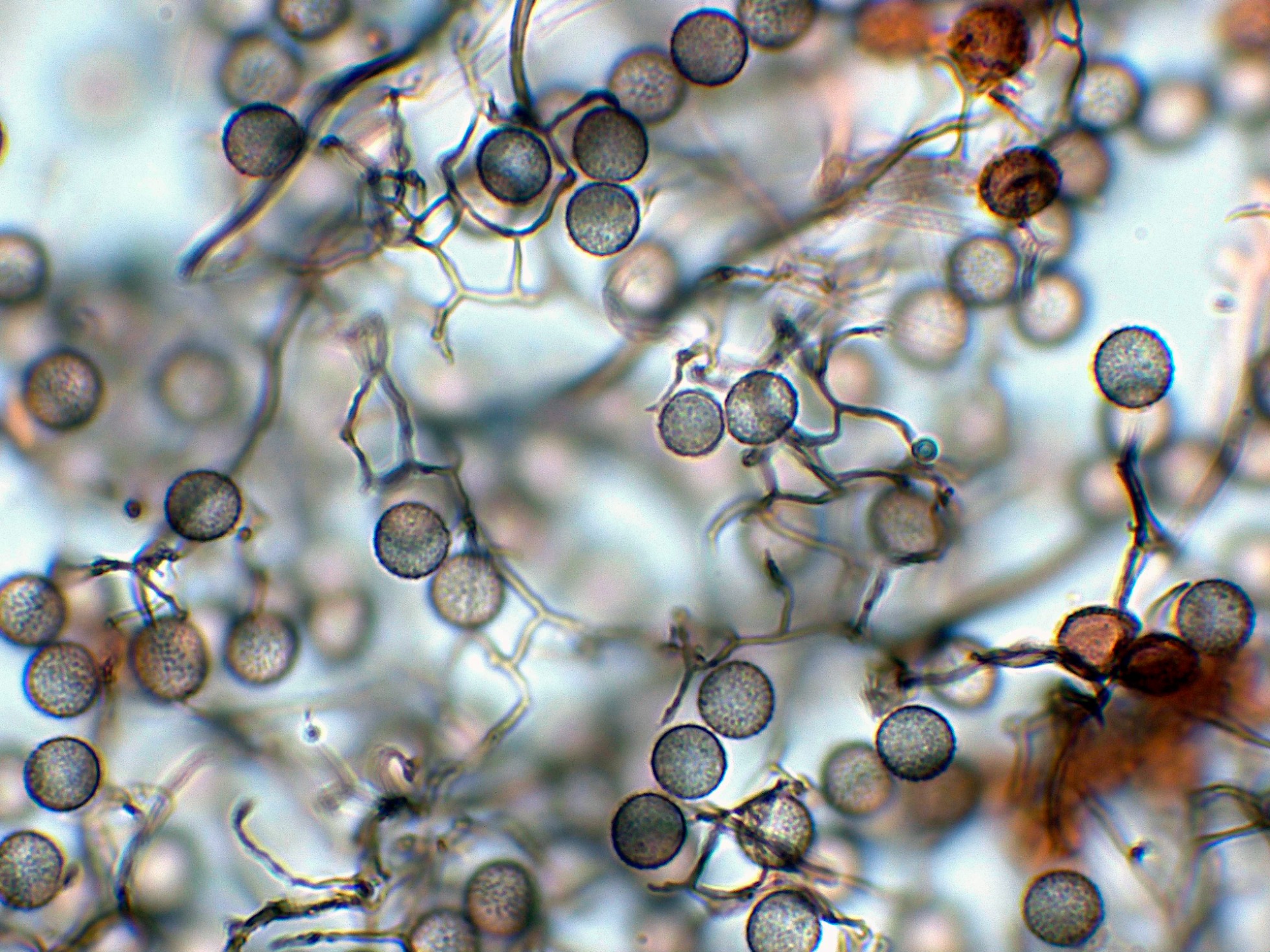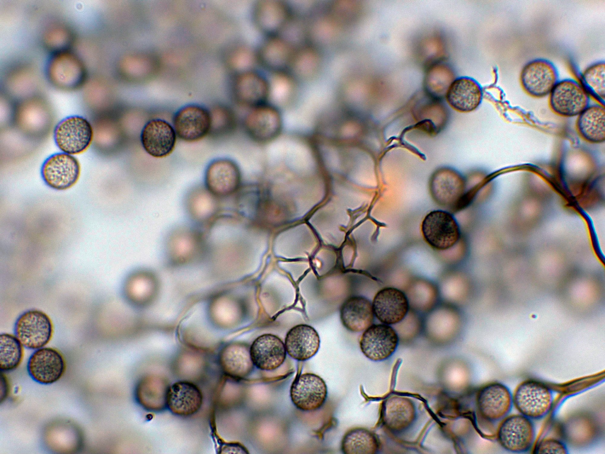 Esporas de color marrón violáceo al microscopio, verrucosas, pero que no llegan a formar un retículo, con unas medidas de: