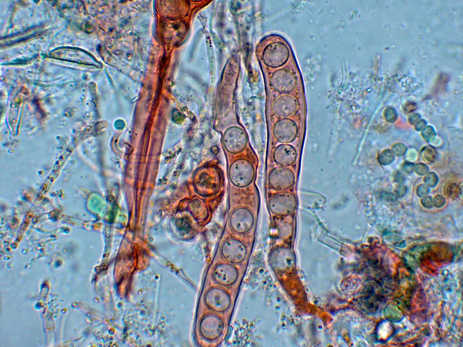 En mi caso atendiendo al dato de las esporas elipsoidales y su tamaño, todo apunta a una Boubovia cercana a la Boubovia ascoboloides, pero resulta que tanto la Boubovia ascoboloides como la Pseudobovia benkertii, a ambas las sitúan sobre agujas de coníferas, preferentemente Cupressus y en mi caso se encontraban sobre unas hojas de manglar.