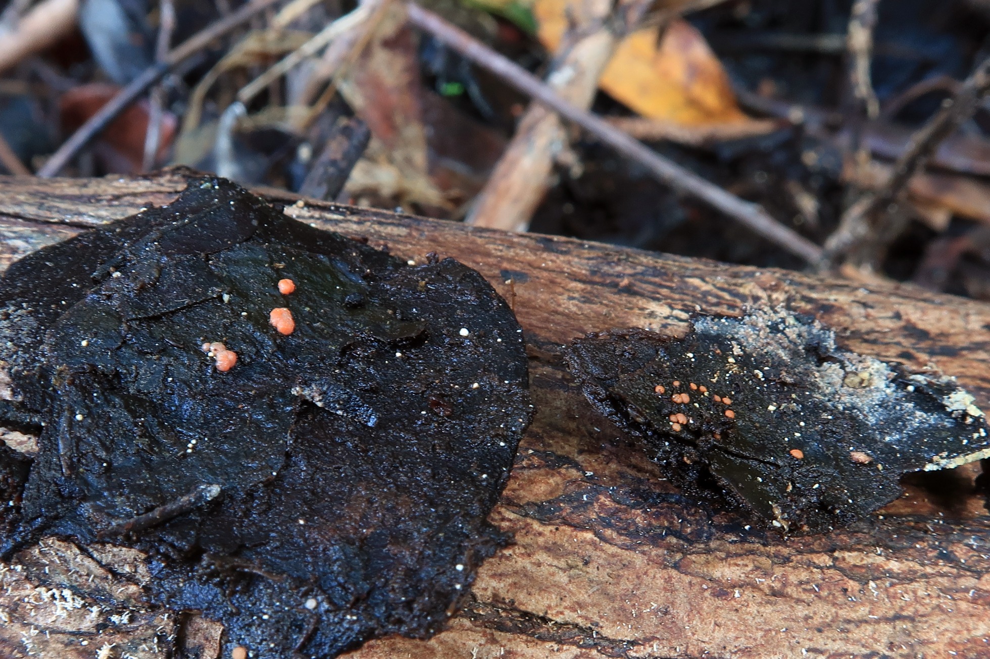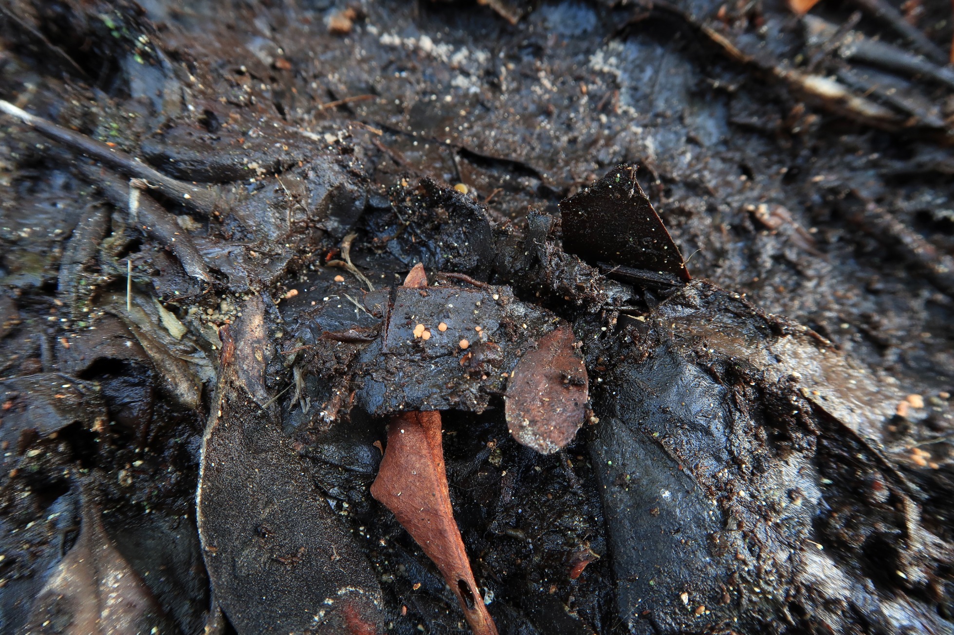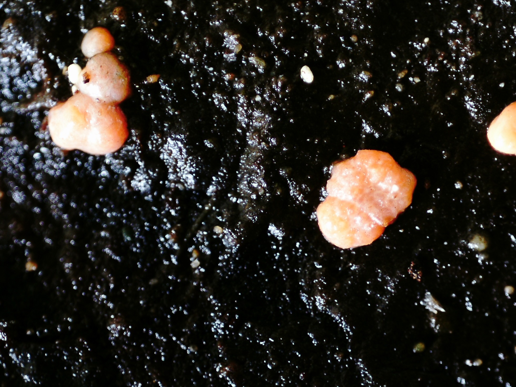 Unos diminutos apotecios fotografiados el pasado 11 de Febrero sobre suelo pantanoso, brotando sobre unas hojas del suelo en estado avanzado de descomposición, de muy presumiblemente Rhizophora mangle (Manglar rojo).