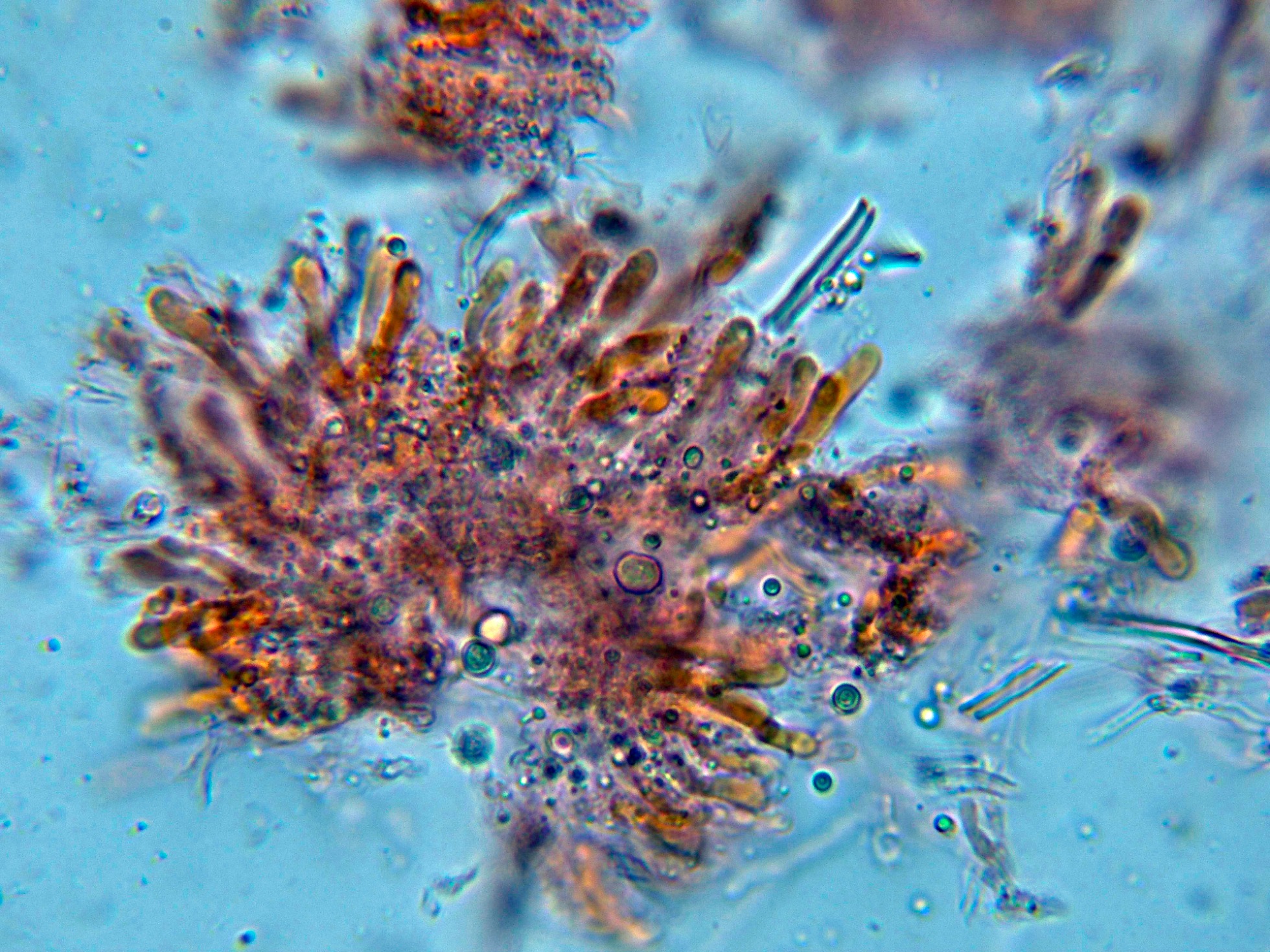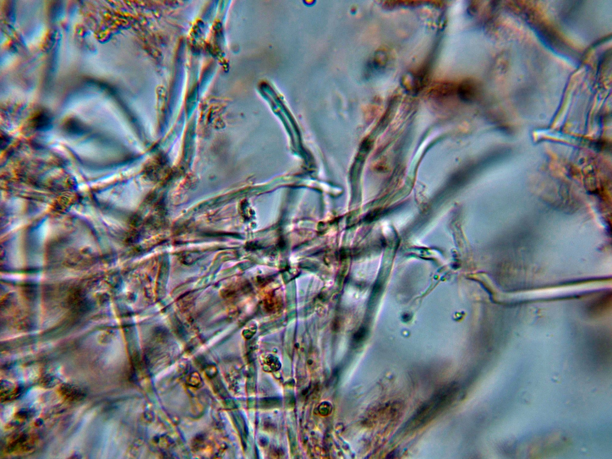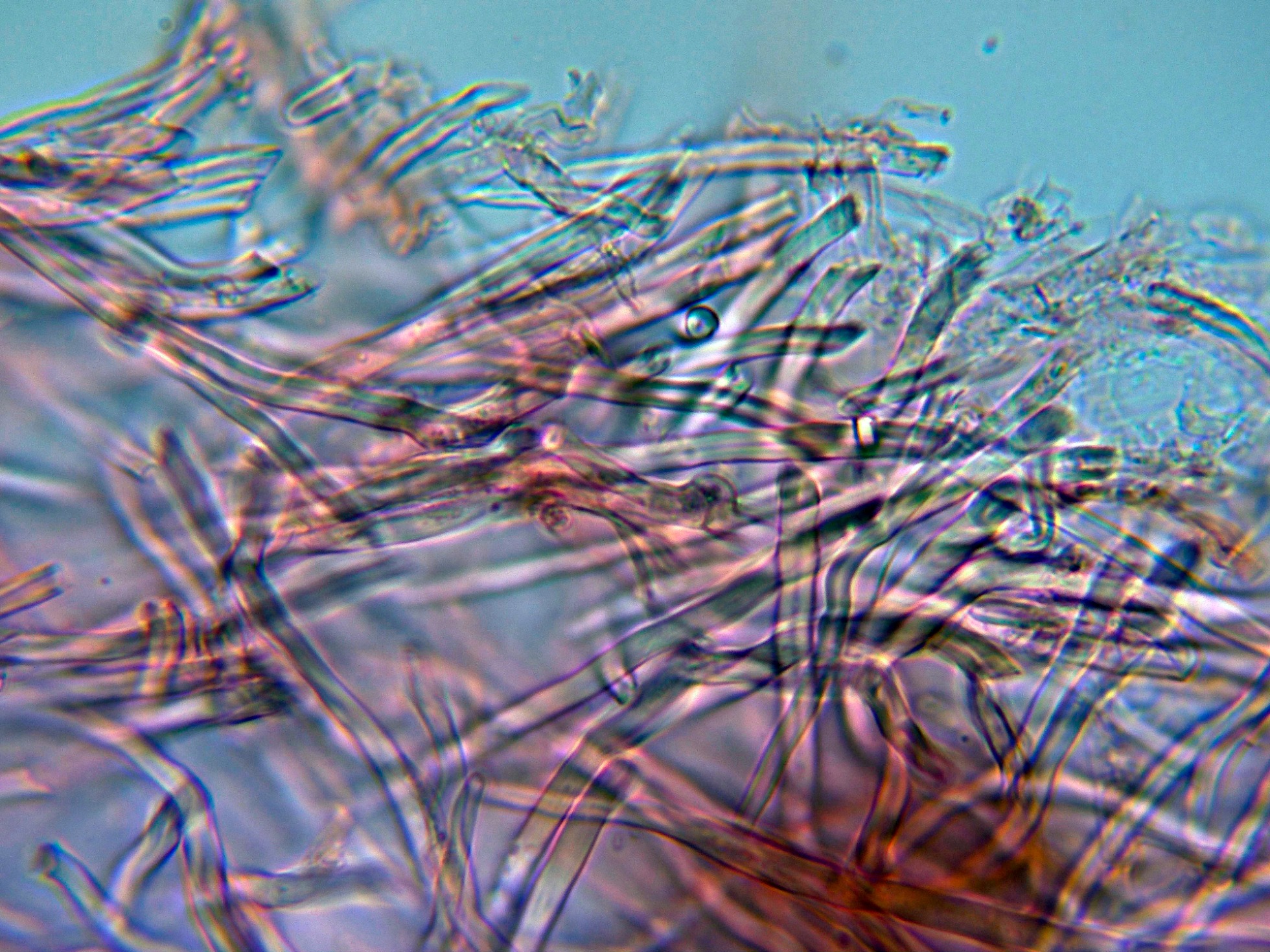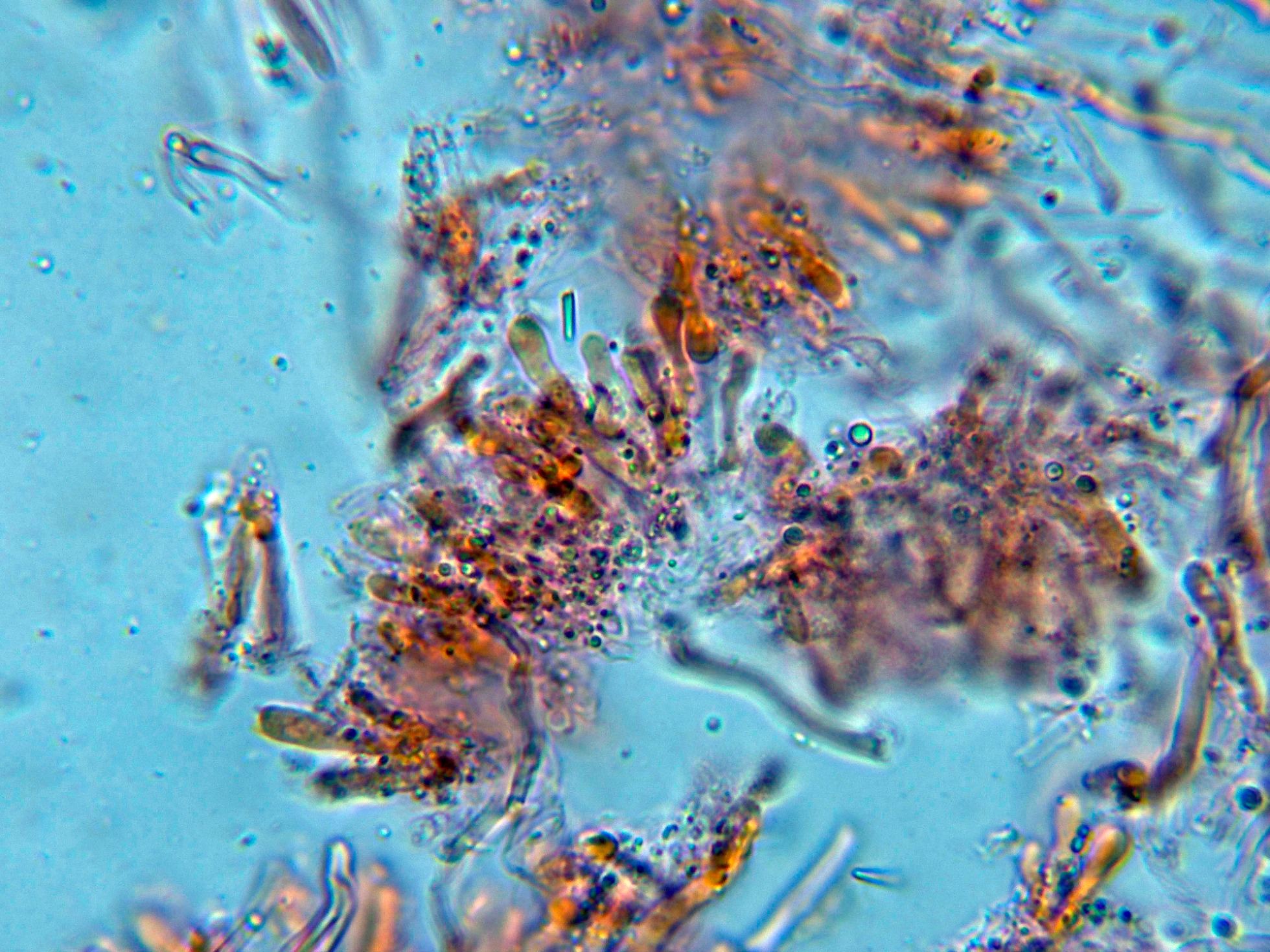 Sin cistidios observados, aunque en la literatura se citan unos pequeños cistidiolos fusoides muy escasos y dispersos.