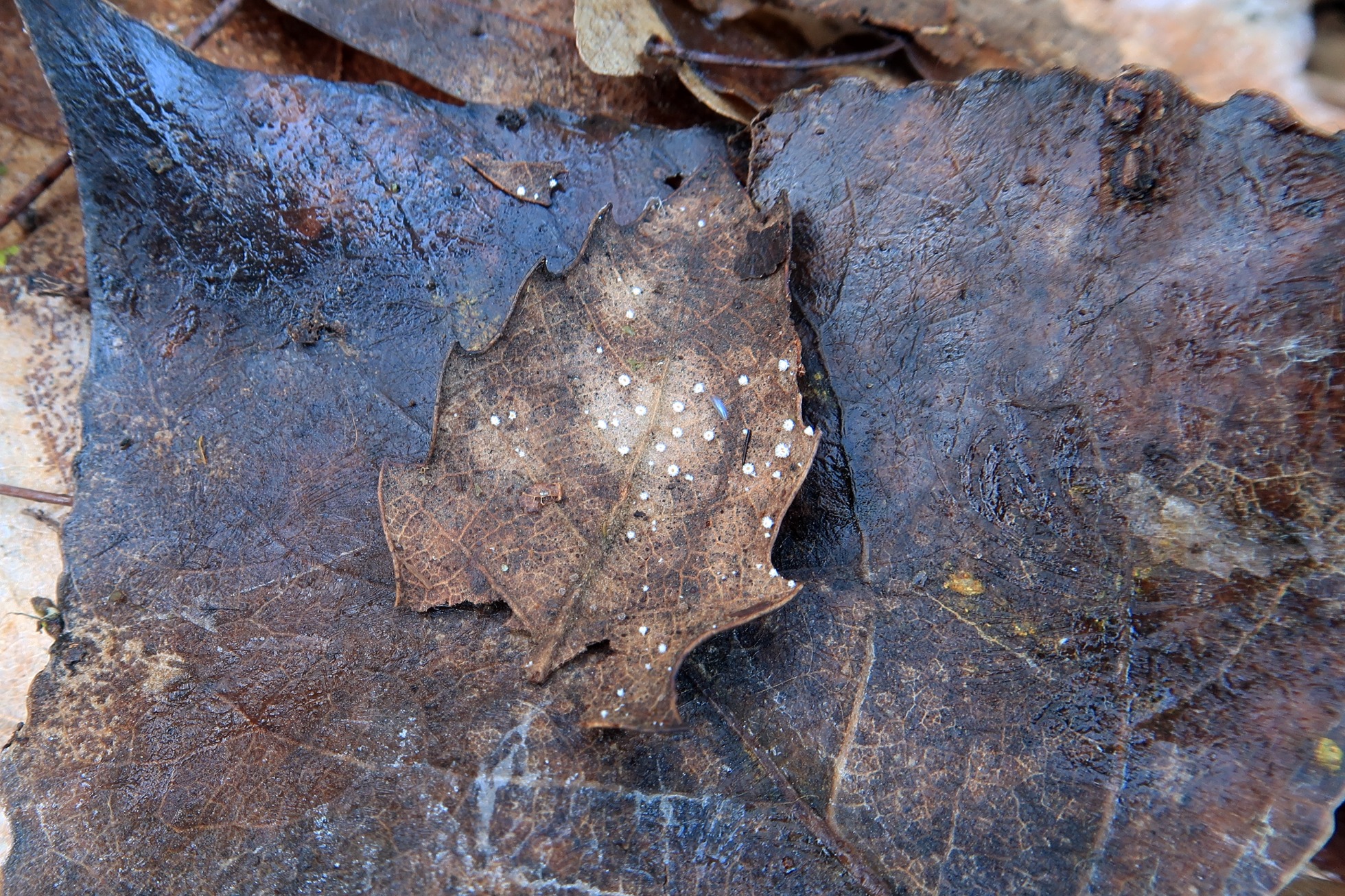 Un Lachnum sobre una pequeña hoja de Quercus, este se caracteriza por los cristales globosos de los pelos marginales que se desprenden fácilmente y por sus esporas con bajo contenido en aceite, el Lachnum rhytismatis.
