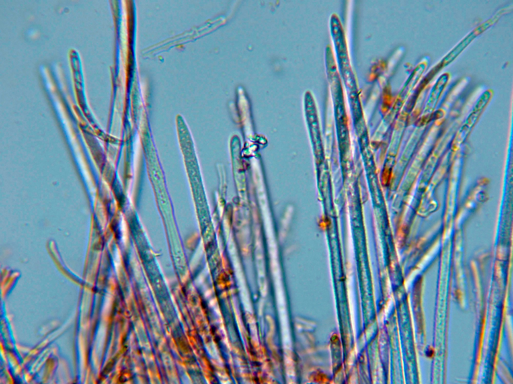 Y para terminar un Corticial con cistidios subulados, con pocas esporas libres pero suficientes para poder determinar la especie, el Subulicystidium longisporum.