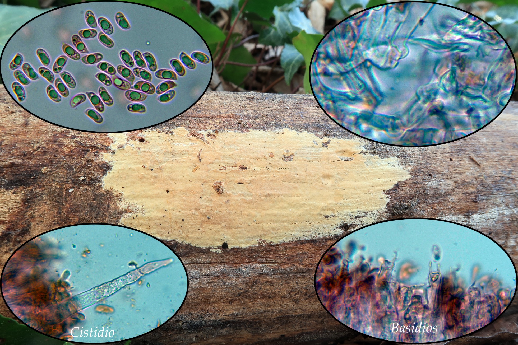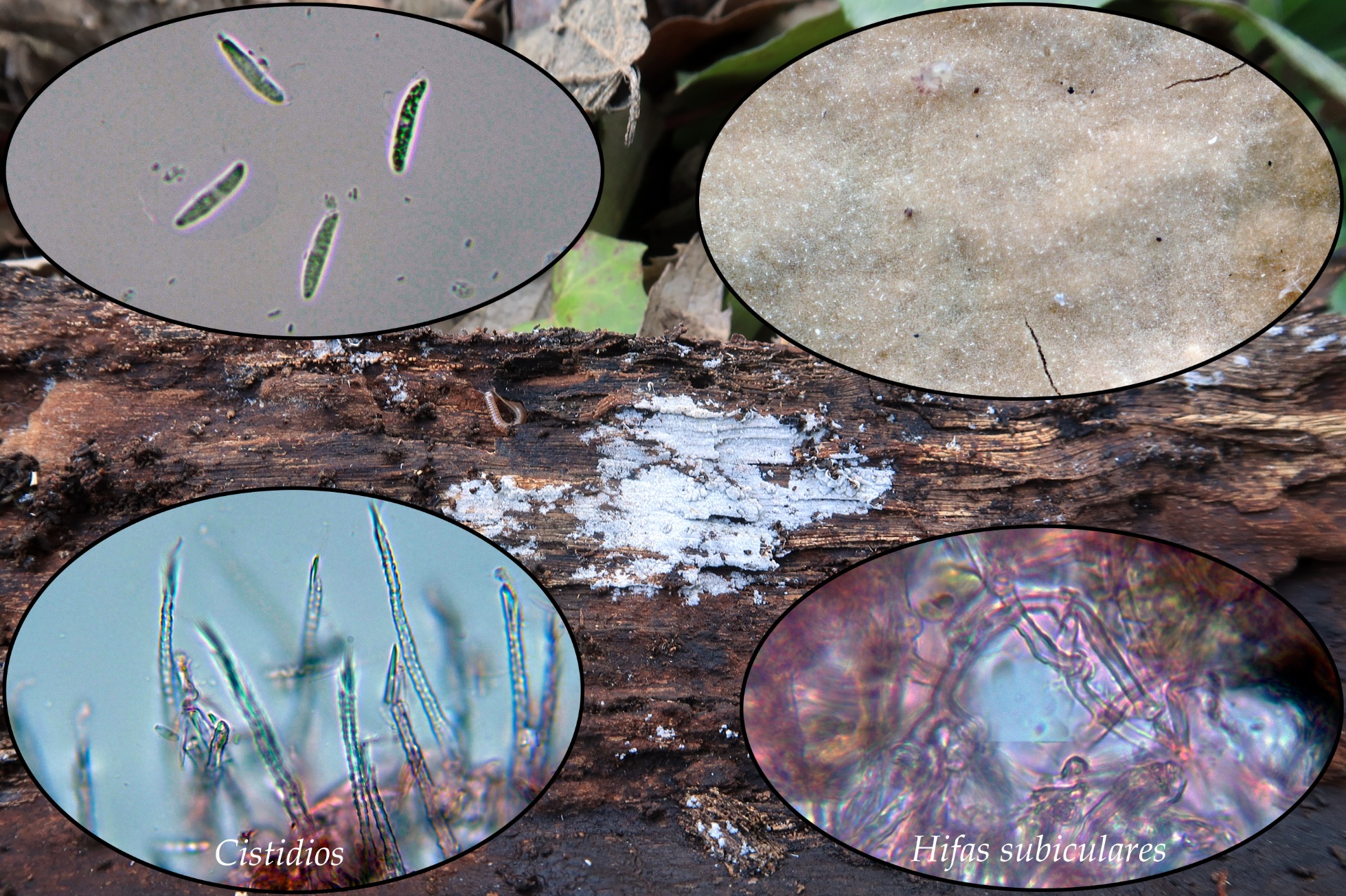 Con un aspecto poco habitual, con largos cistidios provistos de cristales y muy apuntados, la Peniophorella pubera.