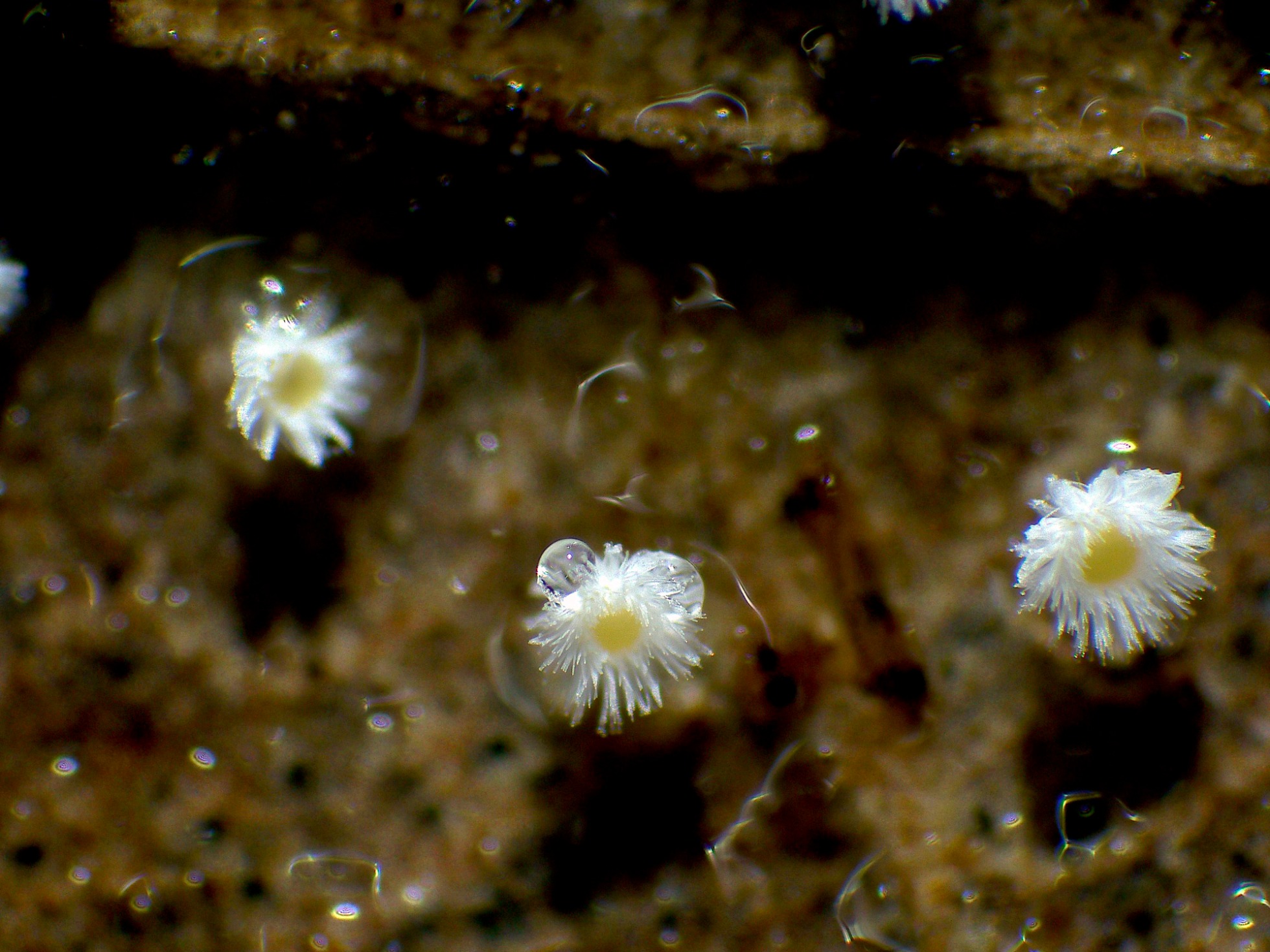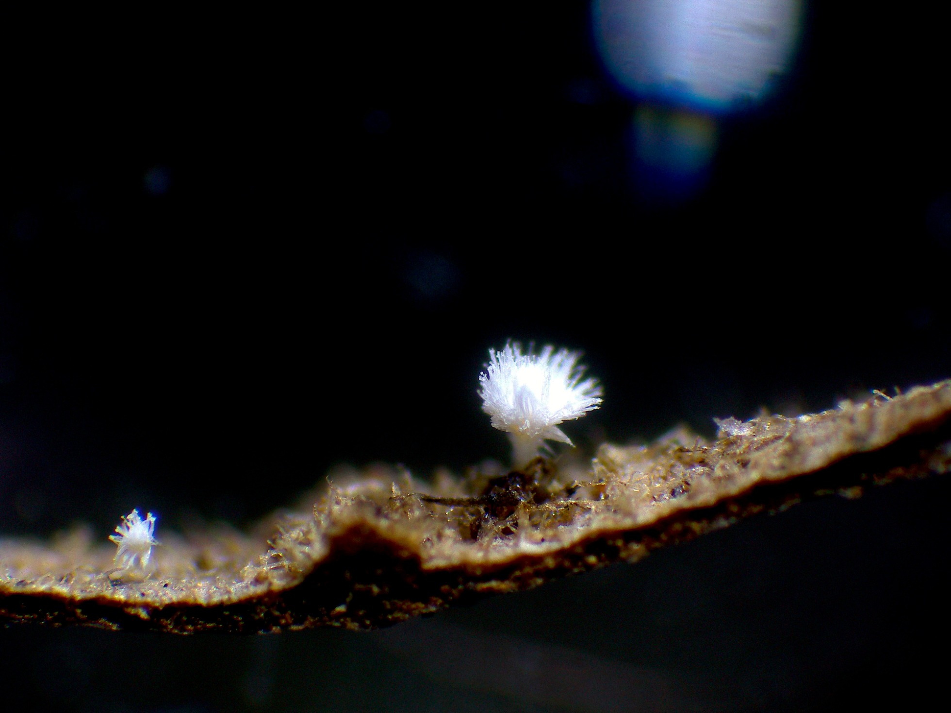 Brotando de manera dispersa pero abundante sobre un tronco tumbado de Populus, la Phaeosolenia densa.