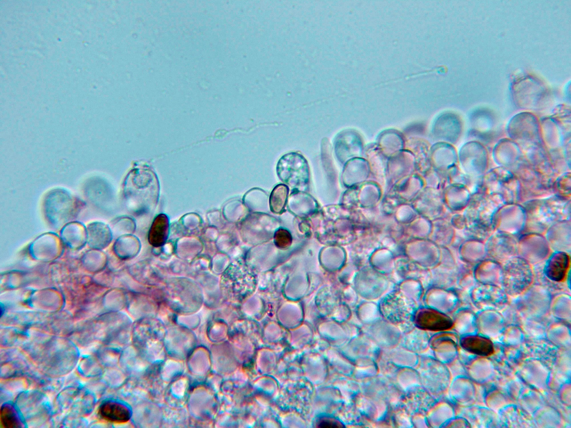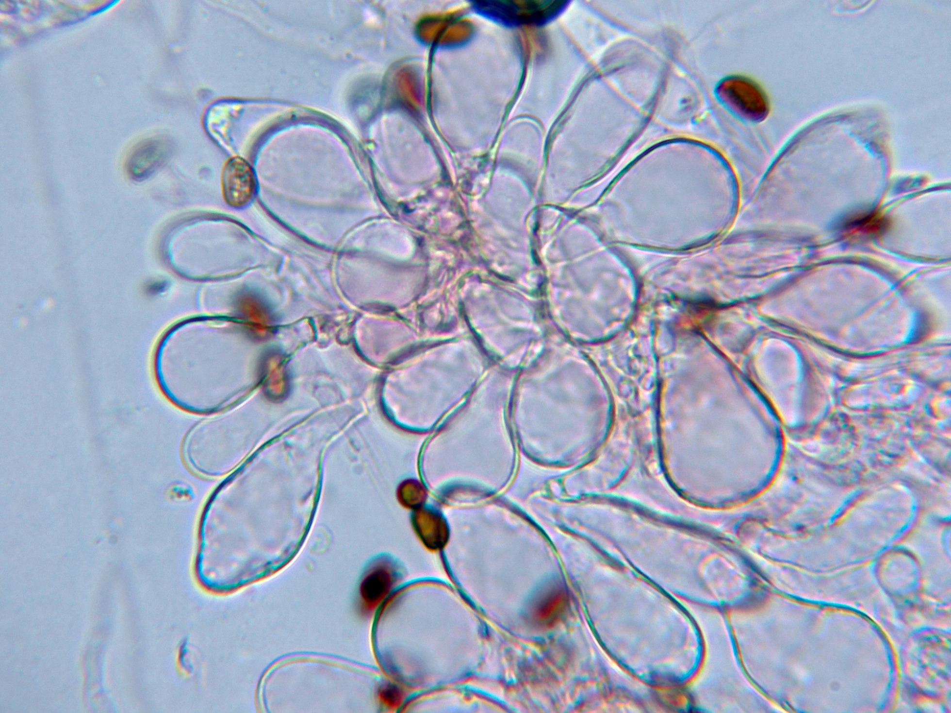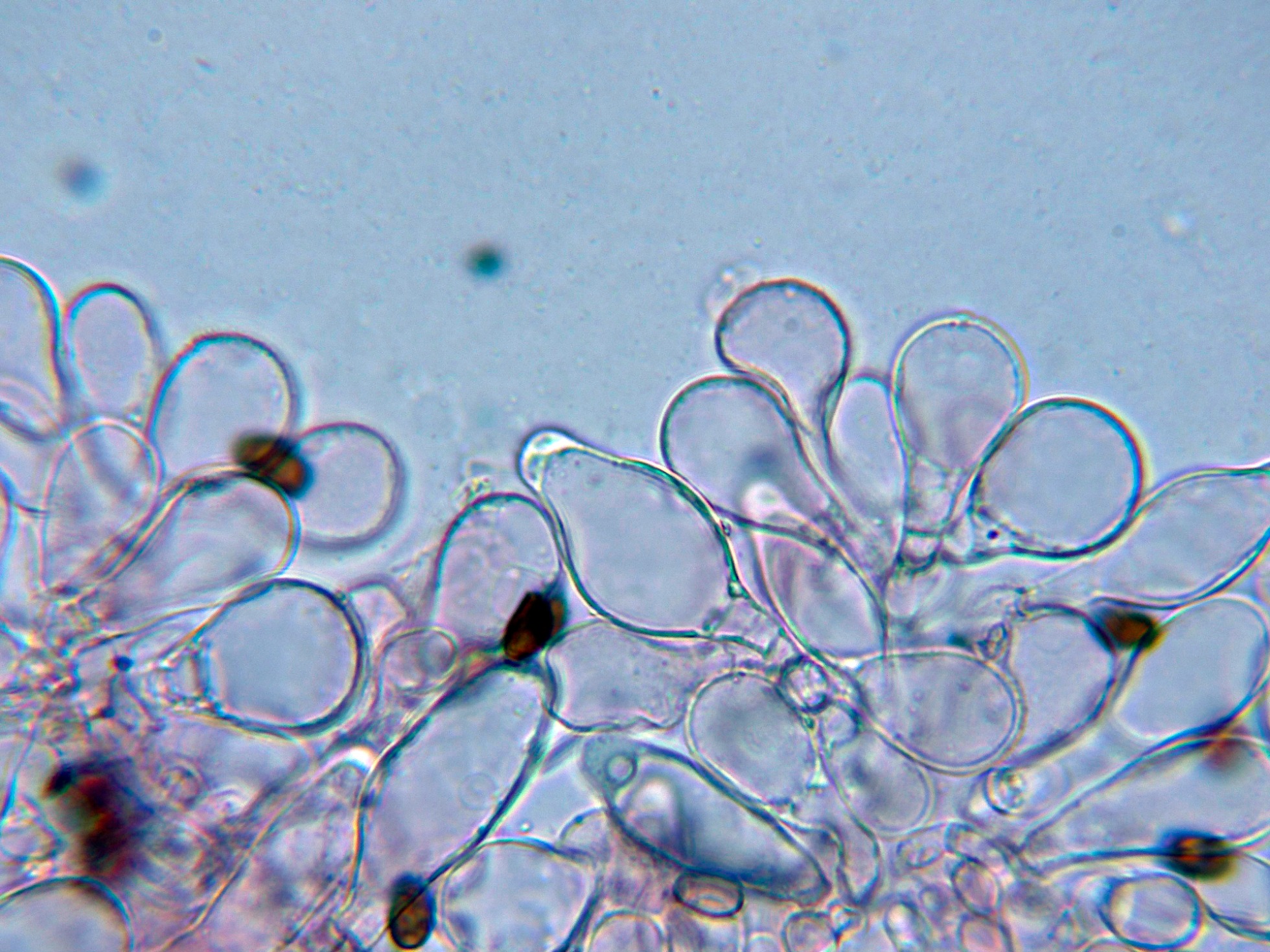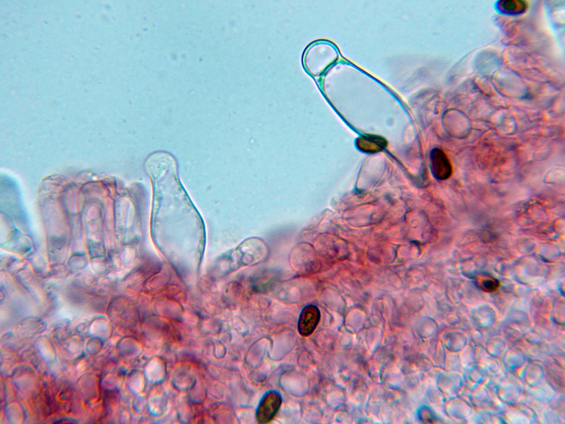 Queilocistidios de 2 tipos con unas medidas de (25.9) 26.9 - 38.3 (39.2) × (11.8) 12.4 - 17.2 (18.9) µm., algunos de ellos tenuemente pigmentados en su interior.