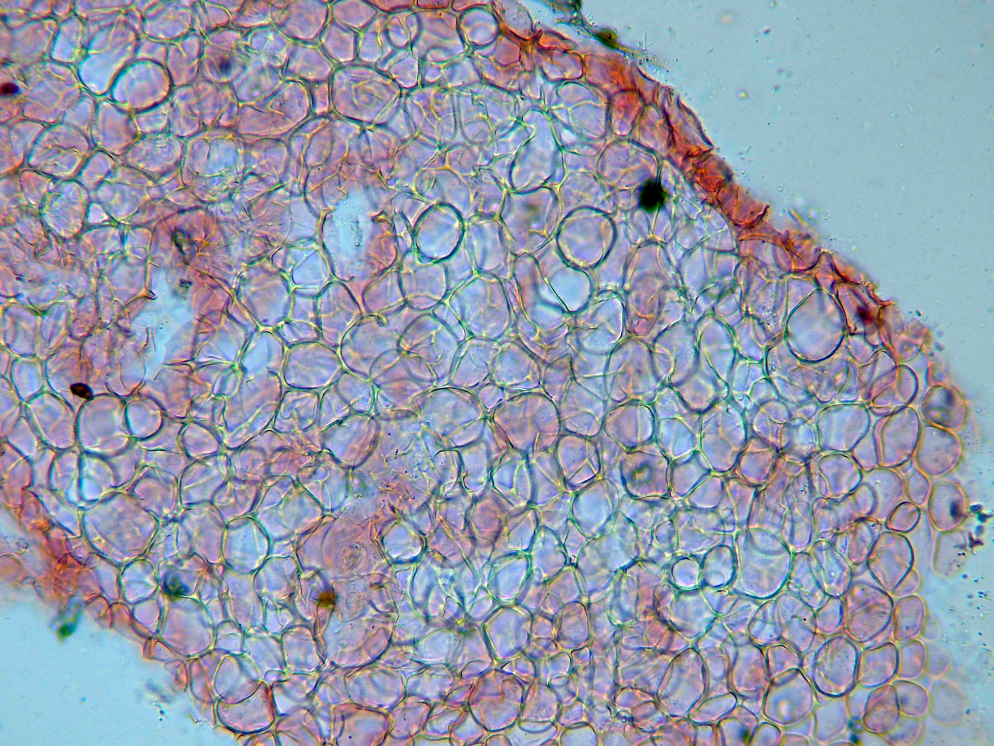 y aunque a ambos nos costó horrores enfocar la muestra al final vimos algo de su estructura y algún "pelo", que al cortar la muestra por uno de los nervios de la hoja puede que éste se llame estroma.