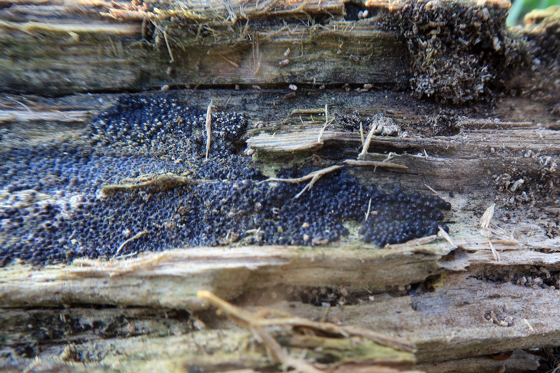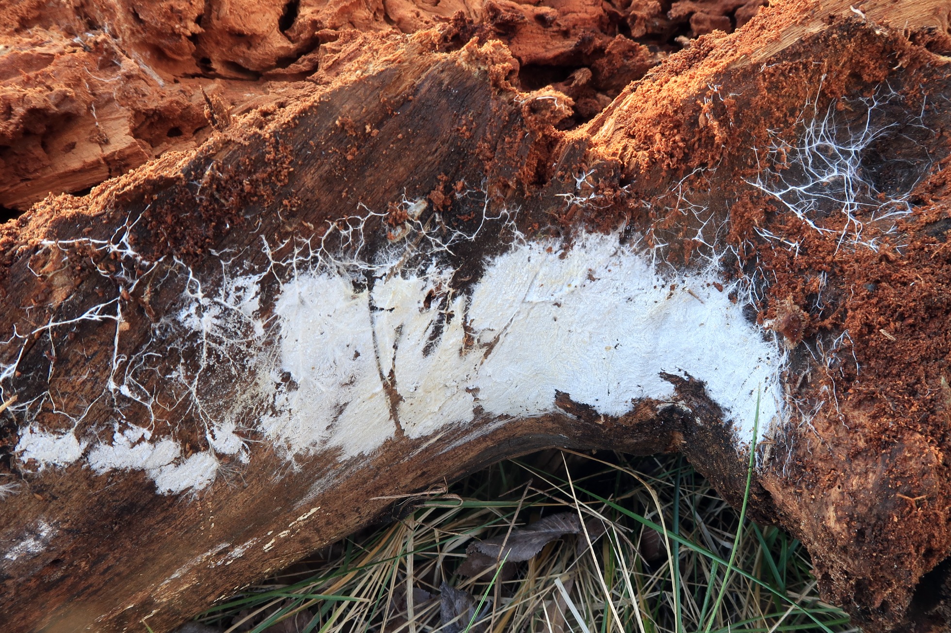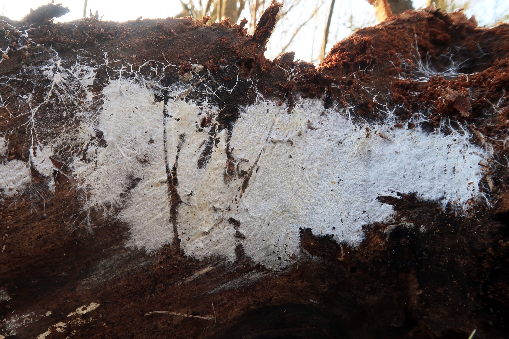 Basidiomas completamente resupinados, cubriendo buena parte del tronco a modo de parches.