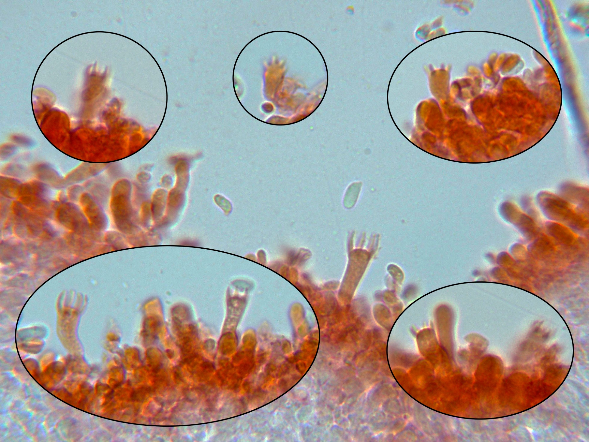 La primera un Corticial que solo me había encontrado en una ocasión, allá por 2017, con basidios mayoritariamente de 8 esporas, sin cistidios, el Sistotrema octosporum.