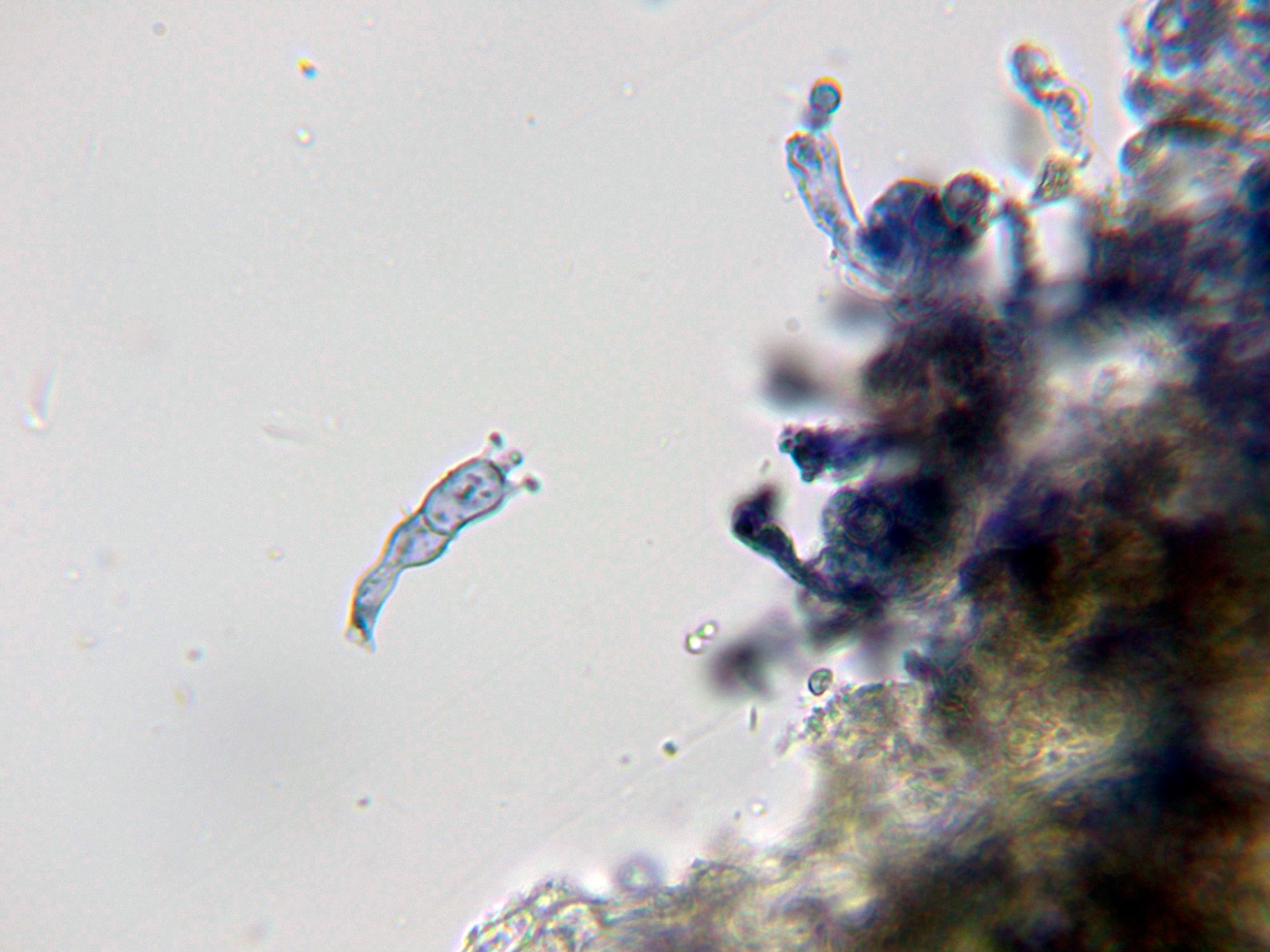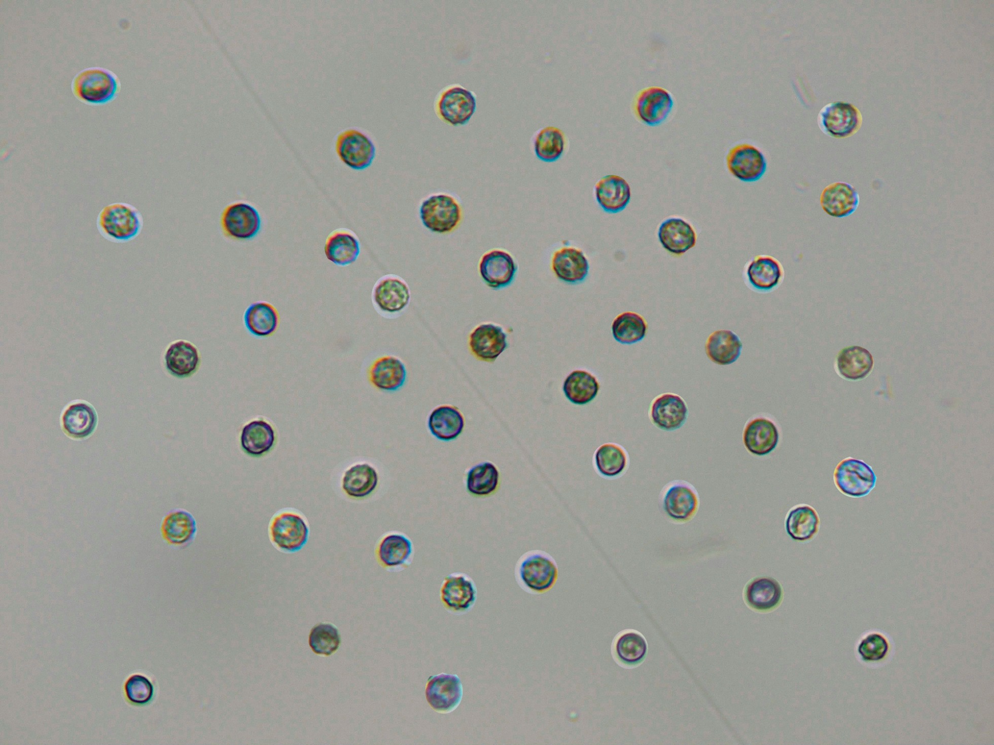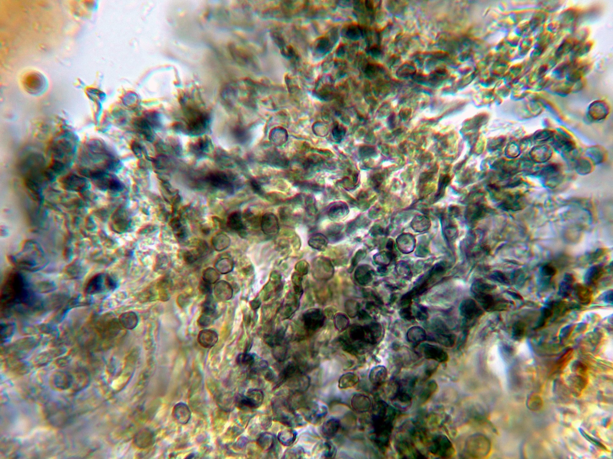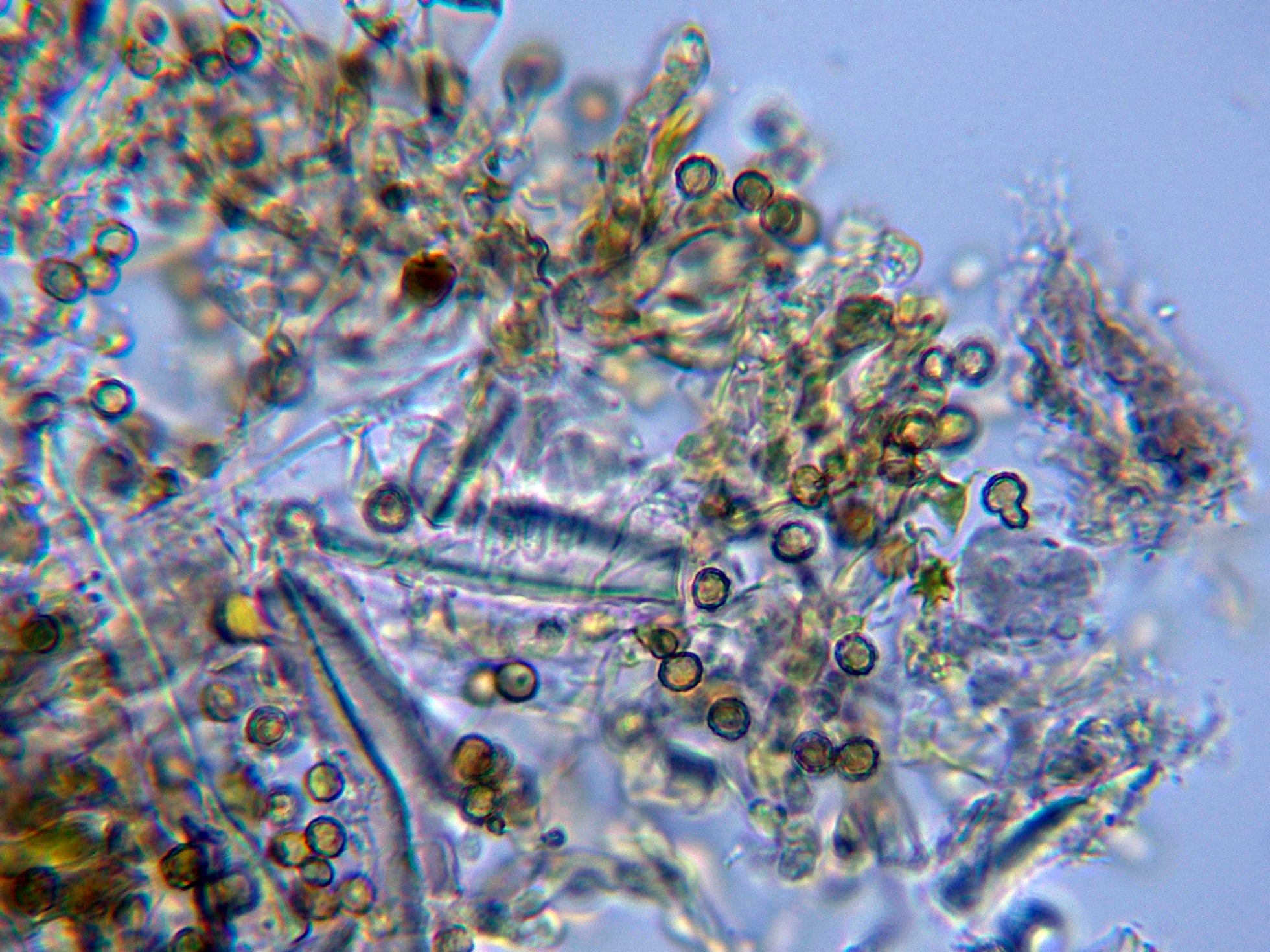 Las esporas en agua, con discretas verrugas y pigmentadas de azul.
